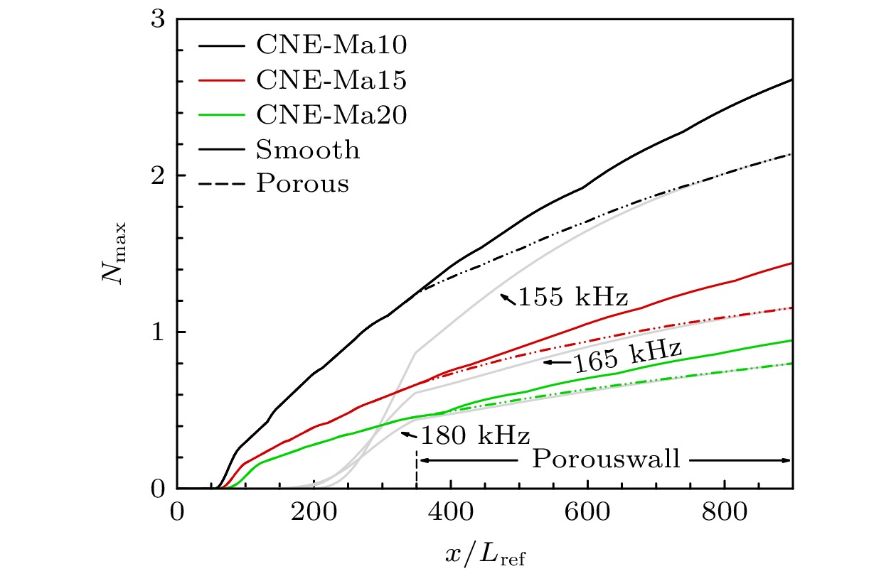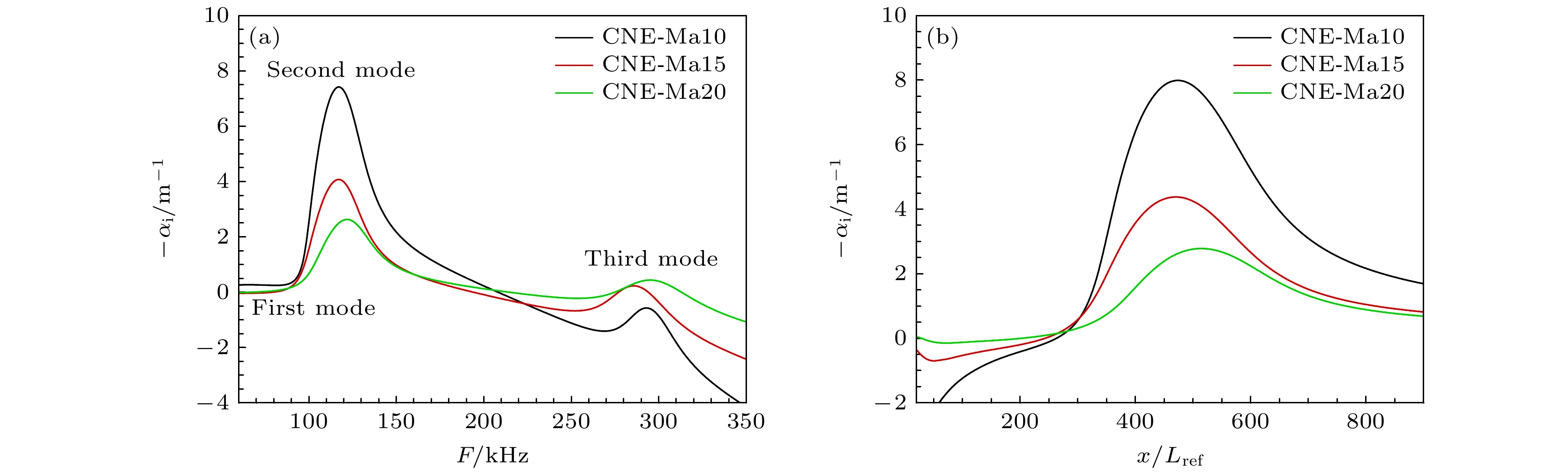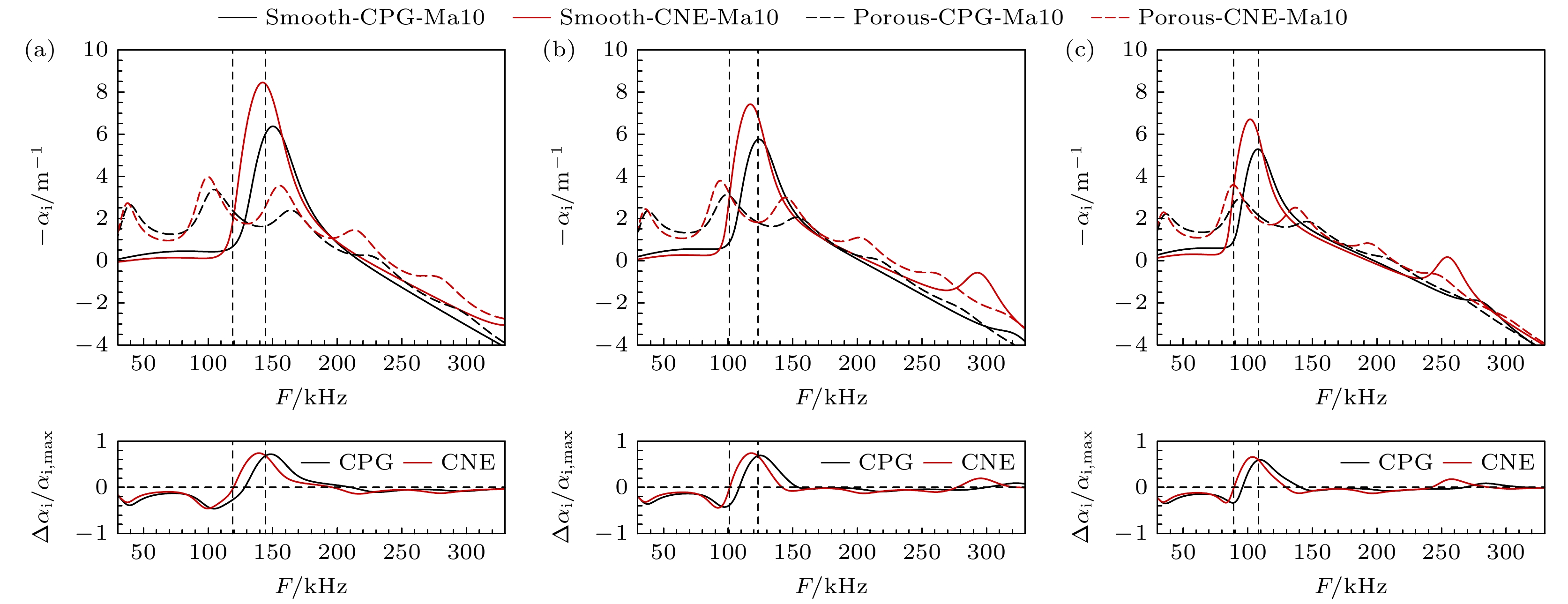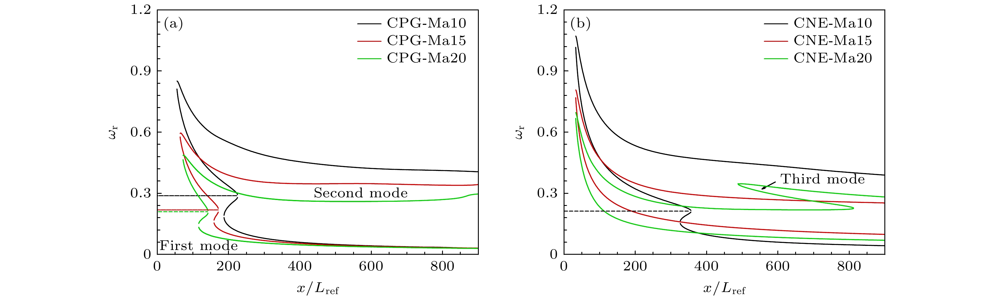 The transition from laminar to turbulent flow is one of the main aerodynamic challenges in aircraft design and development. When the flight Mach number is sufficiently high, the aircraft surface experiences micropore effects and high-temperature gas thermochemical reactions. At present, boundary layer instability has become a more complex problem, and its mechanism is still unclear. In this study, a linear stability analysis method is developed which takes into consideration high-temperature chemical non-equilibrium process and surface micropore effect. For flight conditions at high altitude (H = 25 km) with Mach numbers 10, 15, and 20, the effects of micropore effects, chemical non-equilibrium effects, and their joint effect on flow stability are contrasted and investigated. The results show that the chemical non-equilibrium effect can contribute to the boundary layer's mode instability, while the micropore effect can restrain the second mode instability. The coexistence of the two often contributes to the instability of the second mode, because the former is heavier than the latter. The chemical non-equilibrium effect can reduce the frequency range corresponding to the second mode of pore effect inhibition, which results in the chemical non-equilibrium effect enhancing the inhibition effect of the micropore effect in the local low-frequency range and weakening its inhibition effect in the high-frequency range. This, in turn, causes a decrease in the corresponding N value variation by pore effect. Furthermore, when both effects are present, the micropore effect’s capacity to inhibit the second mode is not significantly affected by change in Mach number.