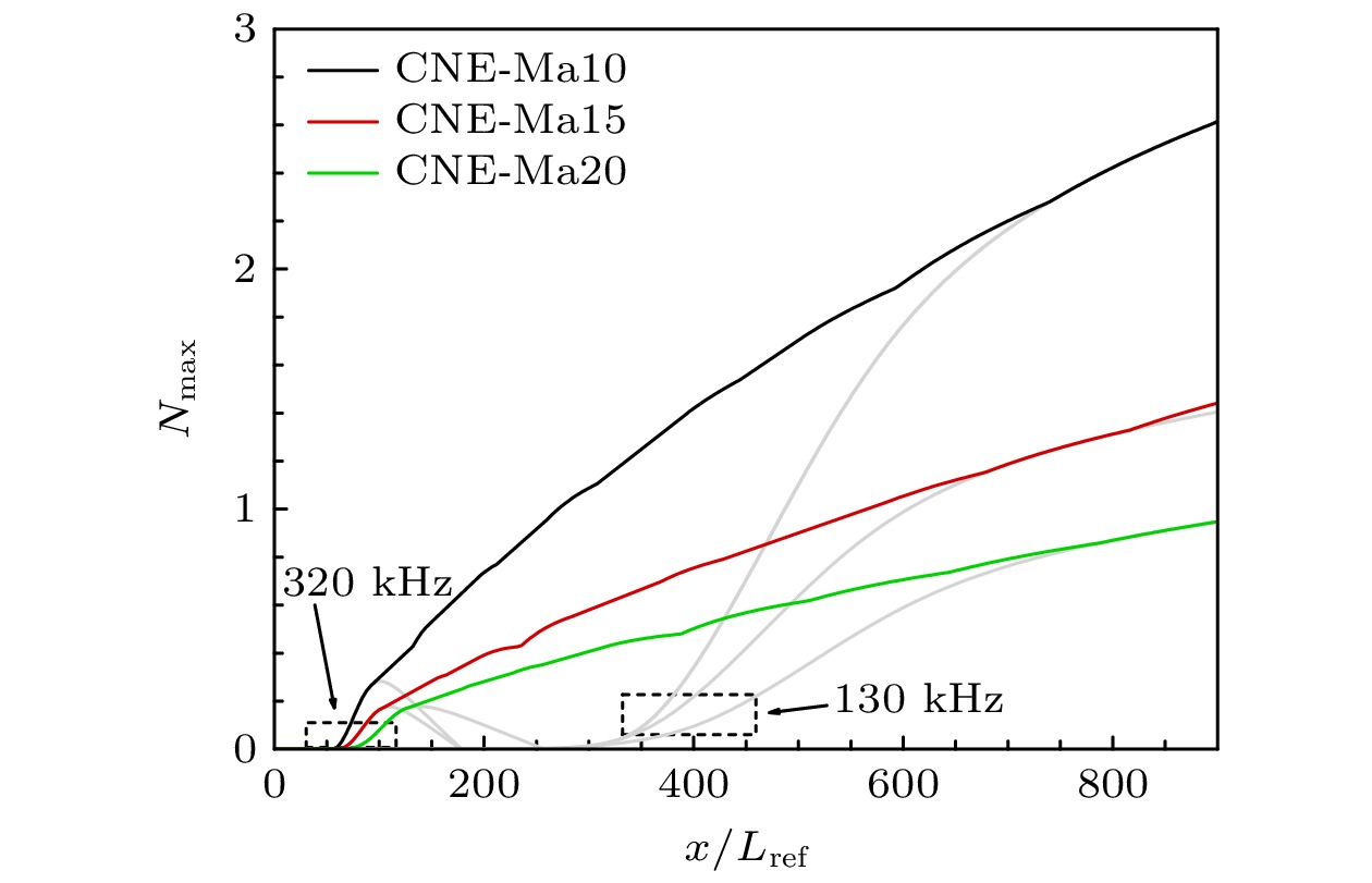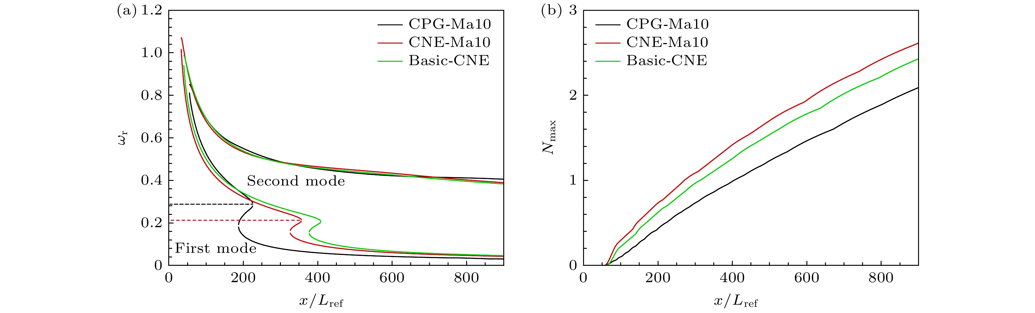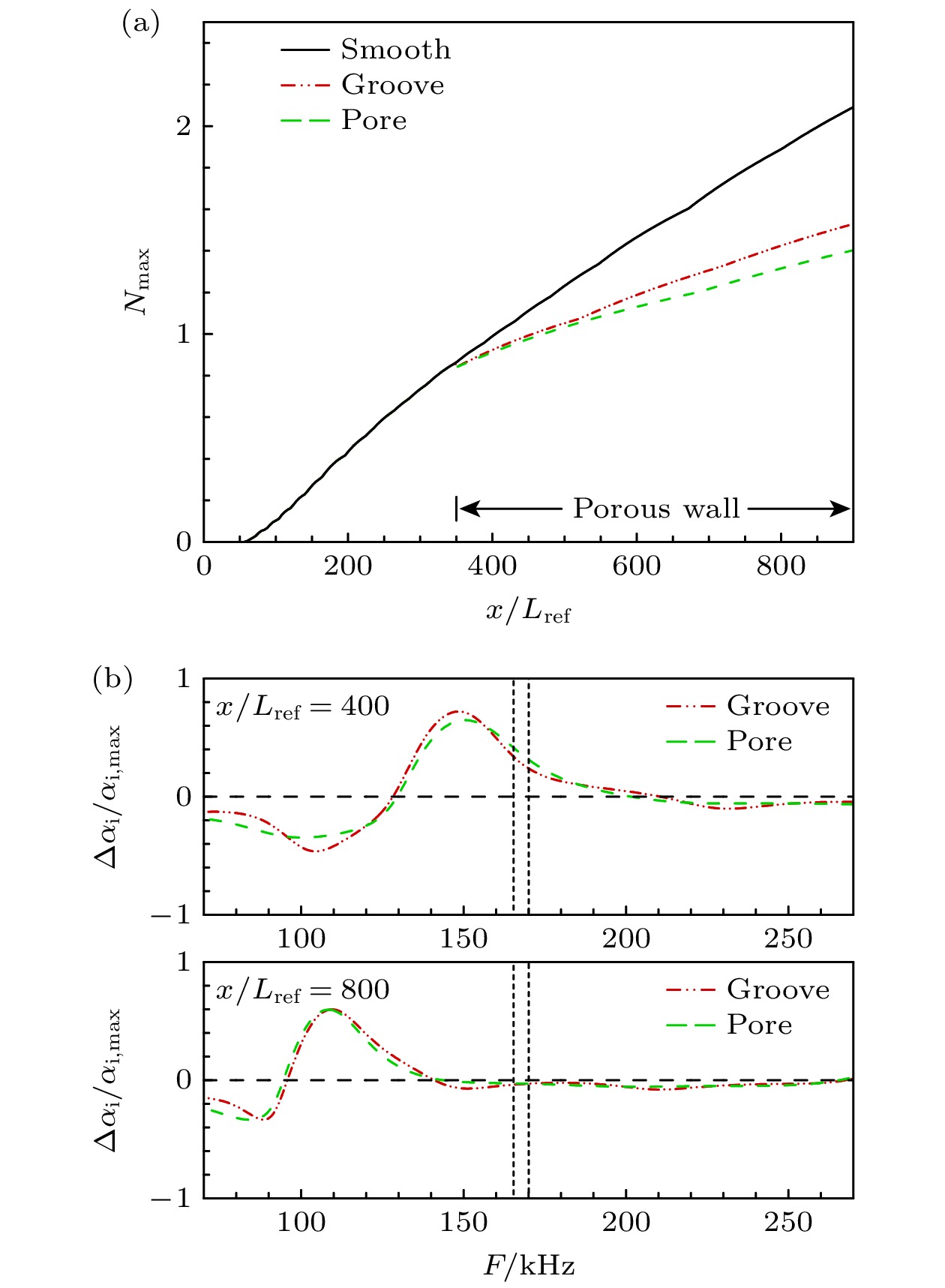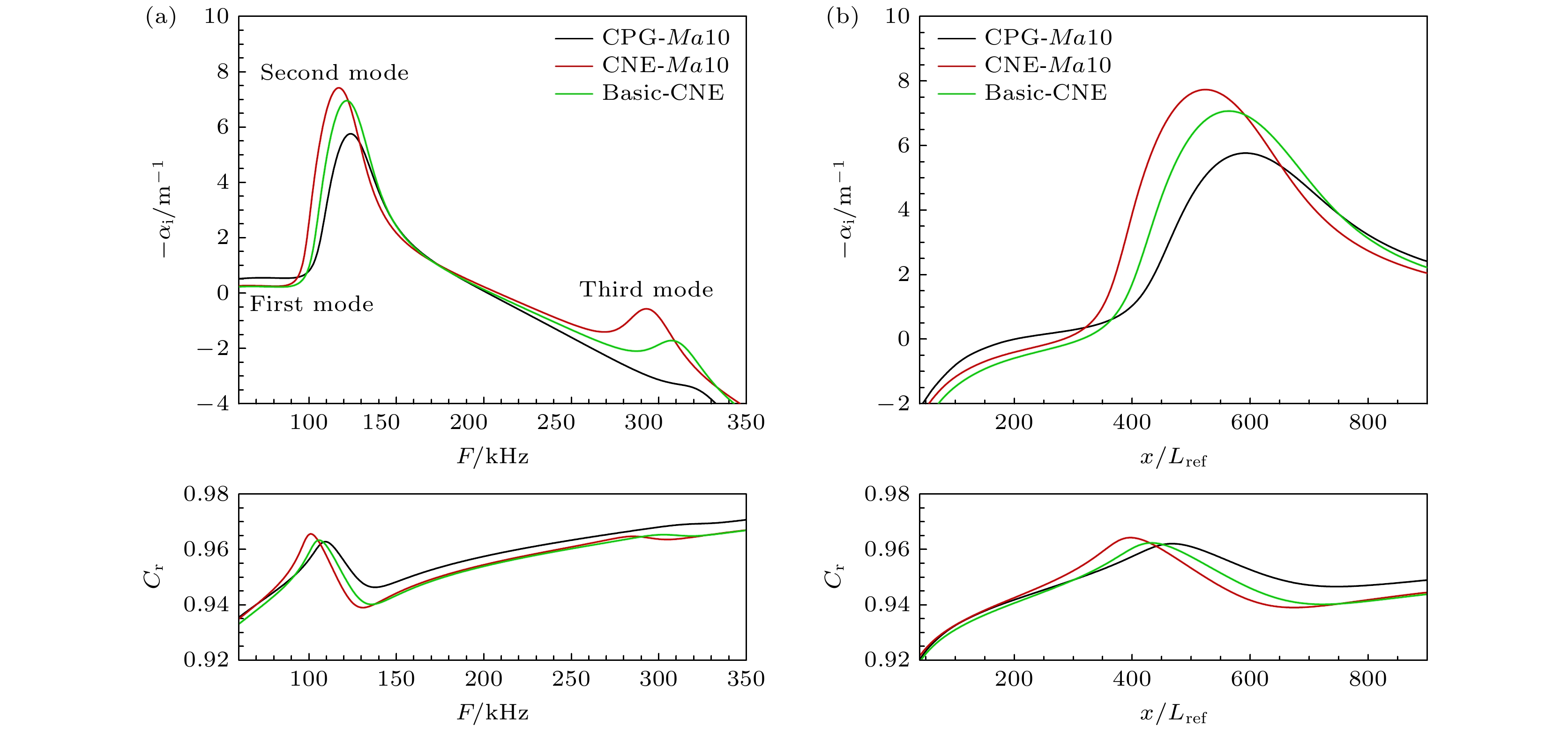 The transition from laminar to turbulent flow is one of the main aerodynamic challenges in aircraft design and development. When the flight Mach number is sufficiently high, the aircraft surface experiences micropore effects and high-temperature gas thermochemical reactions. At present, boundary layer instability has become a more complex problem, and its mechanism is still unclear. In this study, a linear stability analysis method is developed which takes into consideration high-temperature chemical non-equilibrium process and surface micropore effect. For flight conditions at high altitude (H = 25 km) with Mach numbers 10, 15, and 20, the effects of micropore effects, chemical non-equilibrium effects, and their joint effect on flow stability are contrasted and investigated. The results show that the chemical non-equilibrium effect can contribute to the boundary layer's mode instability, while the micropore effect can restrain the second mode instability. The coexistence of the two often contributes to the instability of the second mode, because the former is heavier than the latter. The chemical non-equilibrium effect can reduce the frequency range corresponding to the second mode of pore effect inhibition, which results in the chemical non-equilibrium effect enhancing the inhibition effect of the micropore effect in the local low-frequency range and weakening its inhibition effect in the high-frequency range. This, in turn, causes a decrease in the corresponding N value variation by pore effect. Furthermore, when both effects are present, the micropore effect’s capacity to inhibit the second mode is not significantly affected by change in Mach number.
