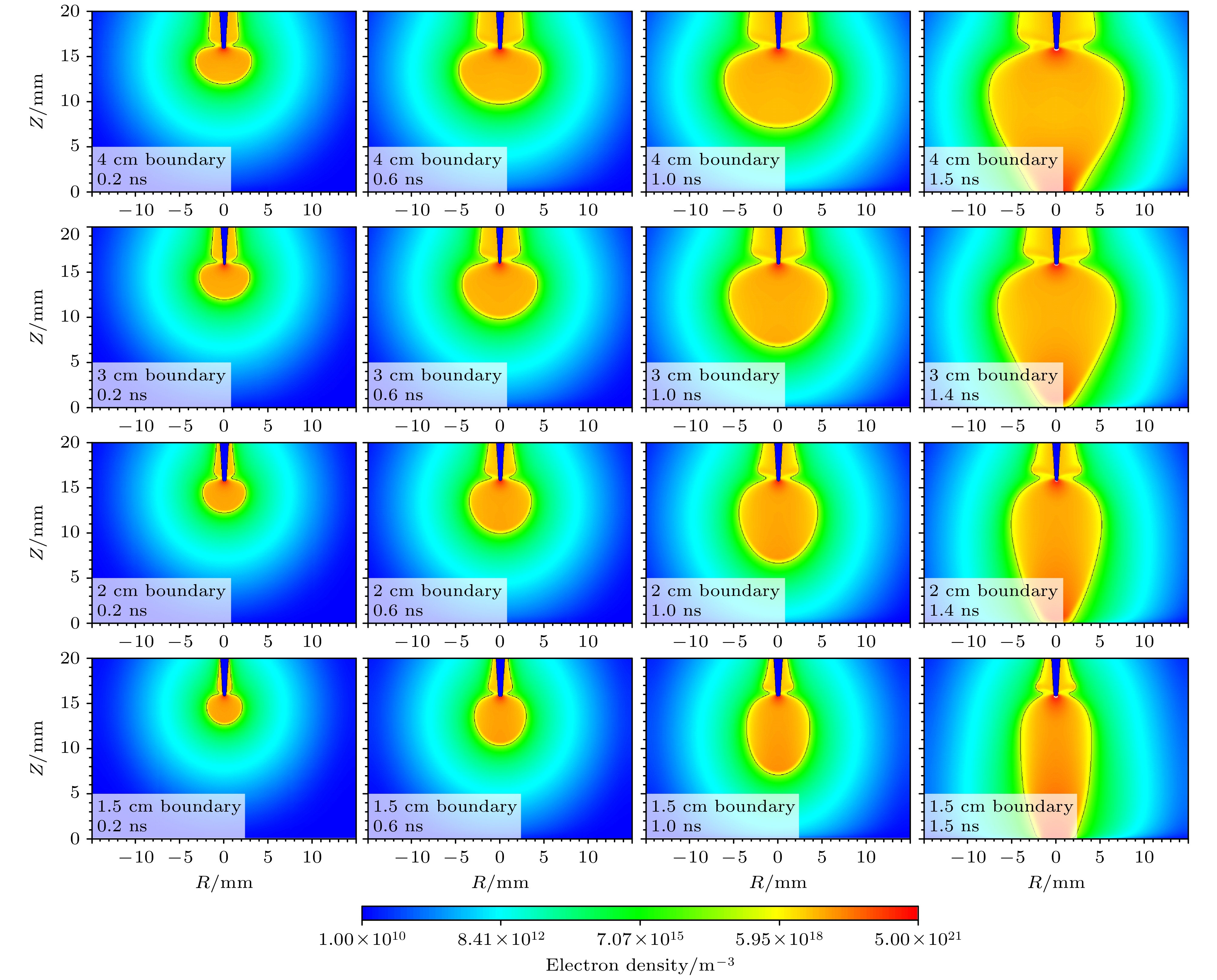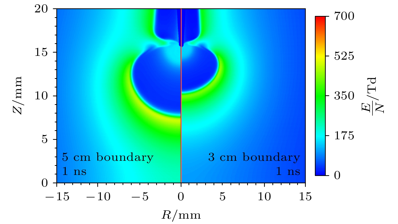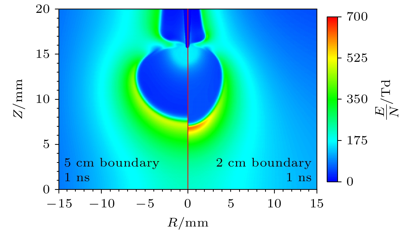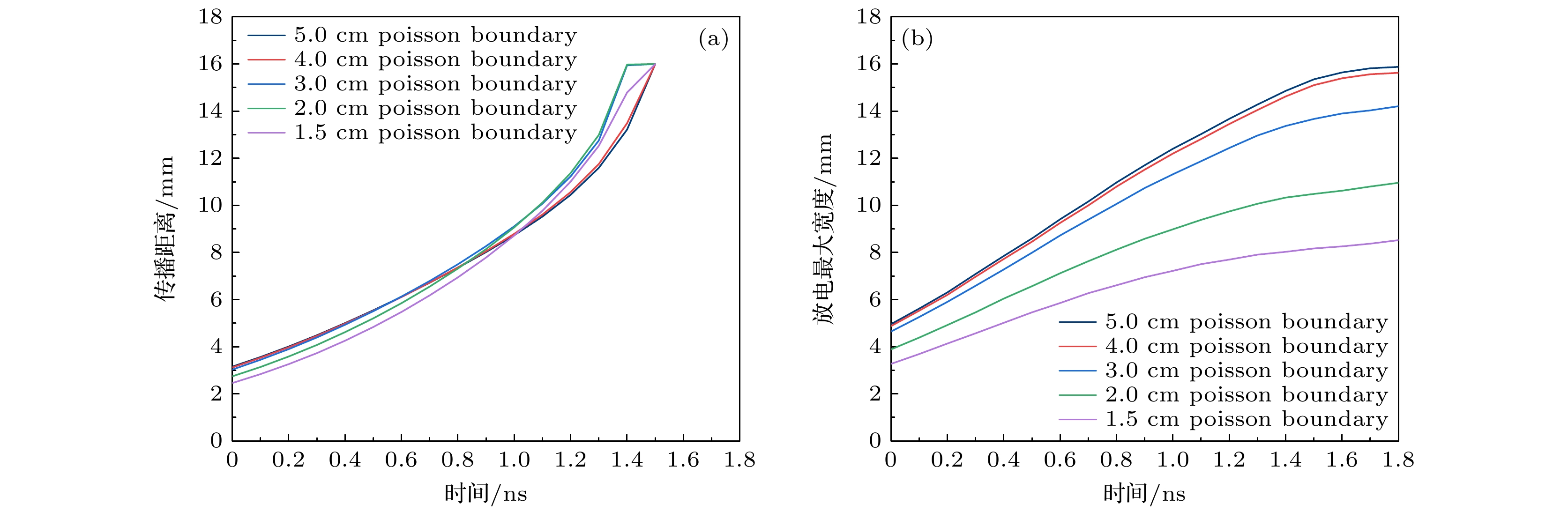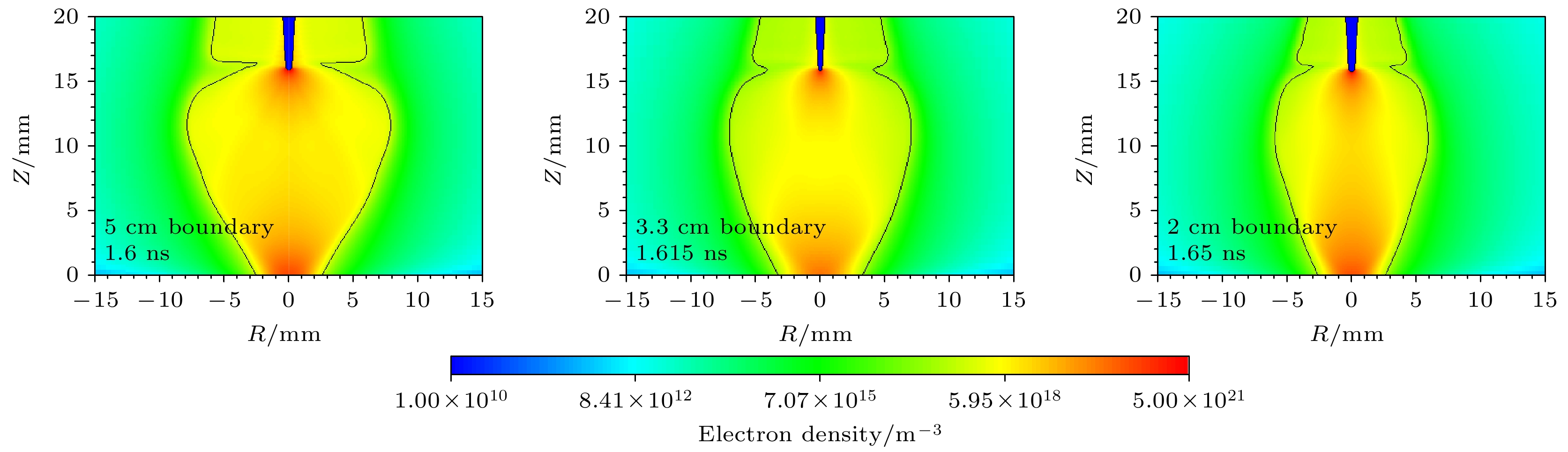 基于流体模型探讨了大气压空气中快纳秒脉冲上升沿引发的弥散放电对等离子体计算域边界与泊松方程计算域边界范围的敏感性和影响机制. 通过对比不同边界范围的仿真结果与实验数据, 尤其是位于整个矩形计算域的最上方边界(上边界)和最右侧边界(右边界): 1)当等离子体边界与泊松方程边界均采用比放电本身半径宽6倍以上的边界范围时, 放电宽度与传播速度与实验吻合度较高, 但放电到达板电极时刻仍存在流体模型所具有的普遍性延迟; 2)等离子体计算域边界的缩减仅使放电头部电场强度与电子密度产生可忽略的微弱波动, 证明其对弥散放电宏观特性影响甚微; 3)泊松方程计算域右边界范围缩减导致放电宽度显著降低, 其放电宽度-计算域比值递增, 且放电在上、下半间隙呈现非对称传播特征, 但适当缩减右边界可改善放电形貌与实验的匹配度; 4)泊松方程计算域上边界缩减会弱化放电头部电场“聚焦效应”, 导致空间电场分布均匀化, 延缓放电加速过程, 使仿真结果偏离实验更显著. 泊松方程边界范围对放电时空演化具有决定性影响, 其中计算域上边界缩减会严重损害仿真精度, 而右边界调整可权衡计算效率与结果可靠性.Diffuse discharges generated by fast rising edge of nanosecond pulses possess a larger discharge radius than classic streamer discharges. However, existing simulation studies often employ boundary ranges similar to those used for simulating streamer discharges, thus neglecting the influence of the boundary range on their characteristics. In this work, the characteristics of diffuse discharges in atmospheric-pressure air are investigated using a fluid model. The research focuses on the influences of plasma and Poisson equation boundary ranges, especially the top and right boundaries of the rectangular computational domain, on discharge evolution. The comparison between numerical simulations and experimental results reveals several key findings: When both plasma and Poisson equation boundaries are set to 5 cm×5 cm (exceeding six times the maximum discharge radius), the simulated discharge width and propagation velocity accord well with experimental measurements. However, consistent delays are observed in simulating the time required to reach the plate electrode, highlighting the inherent limitations of current fluid models in accurately simulating temporal scales. Reducing the plasma boundaries results in negligible fluctuations in electric field strength and electron density at the discharge head, indicating a minimal effect on macroscopic discharge characteristics. Narrowing the Poisson equation’s right boundary significantly reduces the discharge width while simultaneously increasing the discharge width relative to the domain size. Asymmetric propagation patterns occur between the upper and lower halves of the discharge gap. Nevertheless, appropriate reduction of the right boundary improves morphological consistency with experimental observations, thereby suggesting practical optimization strategies. Conversely, reducing the top boundary weakens the electric field “focusing effect” at the discharge head, homogenizes the spatial field distribution, and delays accelerating, thereby exacerbating deviations from experimental data. These results demonstrate that Poisson boundary conditions critically govern spatiotemporal discharge dynamics. Top boundary truncation significantly reduces the simulation accuracy, whereas adjusting the right boundary allows for a balanced optimization between computational efficiency and result reliability. This work provides theoretical guidance for selecting boundary conditions in the numerical modeling of diffuse discharges.