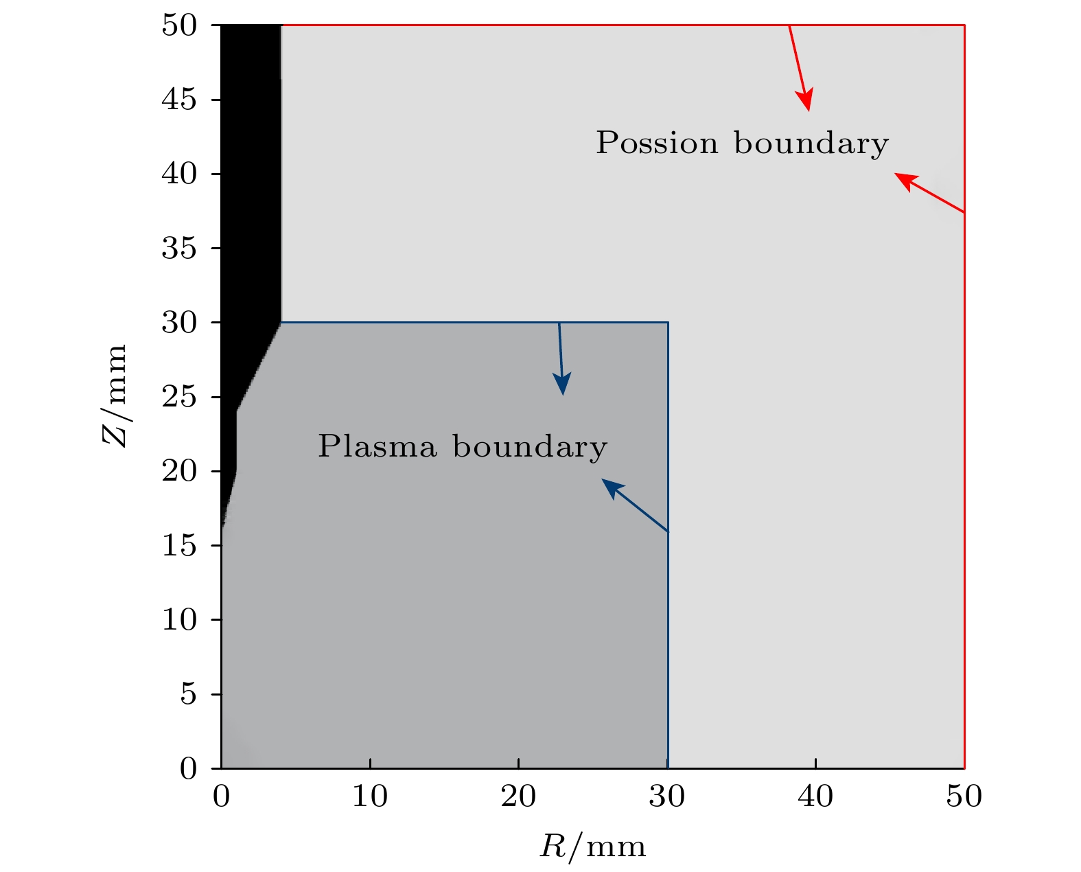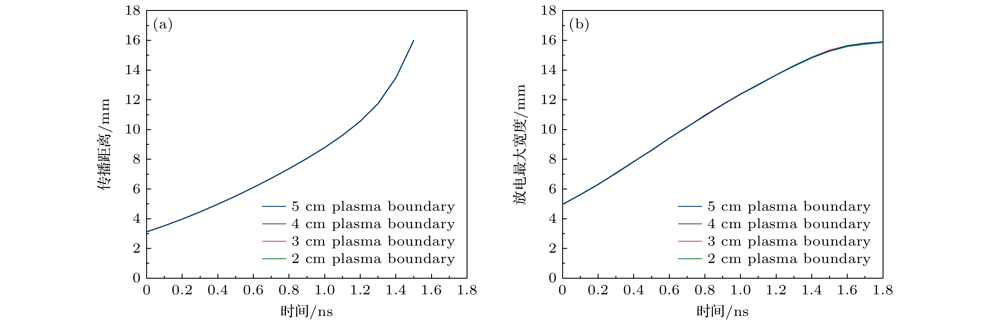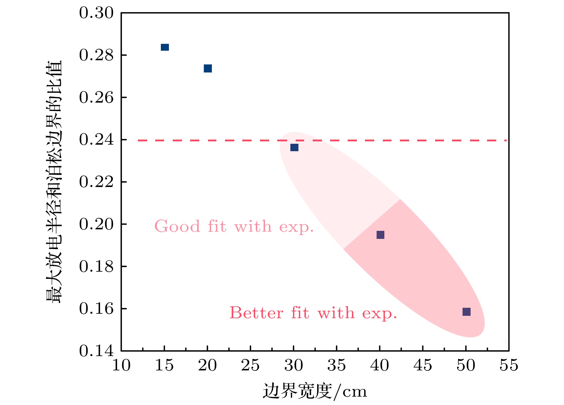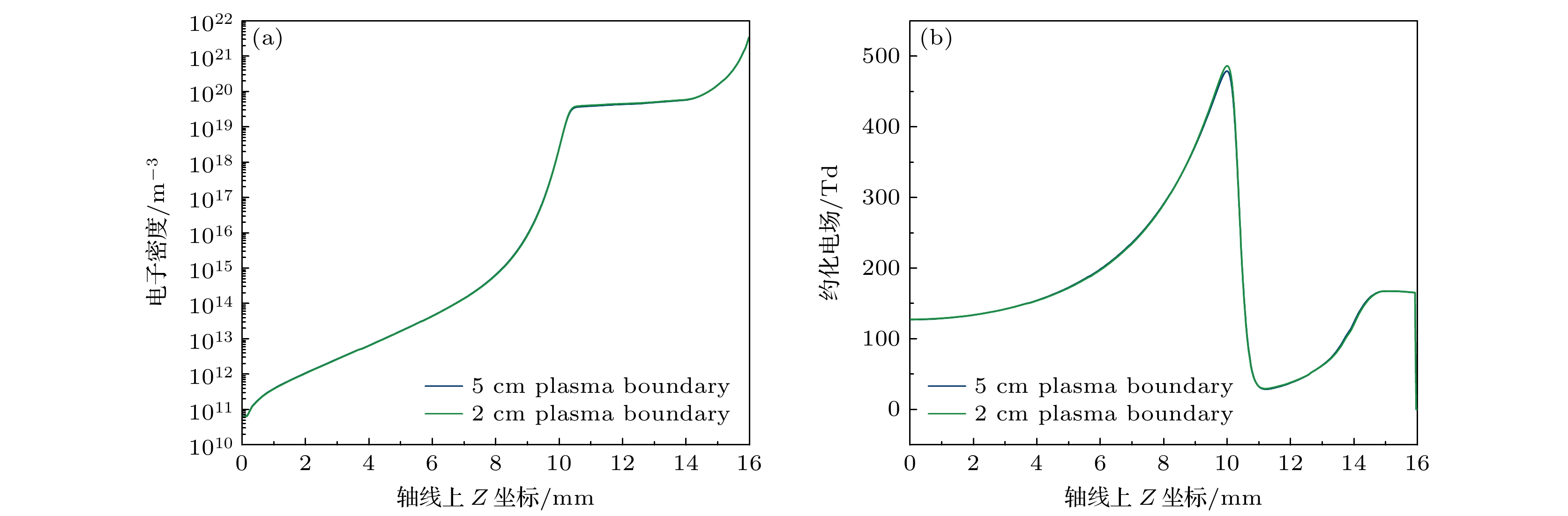 基于流体模型探讨了大气压空气中快纳秒脉冲上升沿引发的弥散放电对等离子体计算域边界与泊松方程计算域边界范围的敏感性和影响机制. 通过对比不同边界范围的仿真结果与实验数据, 尤其是位于整个矩形计算域的最上方边界(上边界)和最右侧边界(右边界): 1)当等离子体边界与泊松方程边界均采用比放电本身半径宽6倍以上的边界范围时, 放电宽度与传播速度与实验吻合度较高, 但放电到达板电极时刻仍存在流体模型所具有的普遍性延迟; 2)等离子体计算域边界的缩减仅使放电头部电场强度与电子密度产生可忽略的微弱波动, 证明其对弥散放电宏观特性影响甚微; 3)泊松方程计算域右边界范围缩减导致放电宽度显著降低, 其放电宽度-计算域比值递增, 且放电在上、下半间隙呈现非对称传播特征, 但适当缩减右边界可改善放电形貌与实验的匹配度; 4)泊松方程计算域上边界缩减会弱化放电头部电场“聚焦效应”, 导致空间电场分布均匀化, 延缓放电加速过程, 使仿真结果偏离实验更显著. 泊松方程边界范围对放电时空演化具有决定性影响, 其中计算域上边界缩减会严重损害仿真精度, 而右边界调整可权衡计算效率与结果可靠性.Diffuse discharges generated by fast rising edge of nanosecond pulses possess a larger discharge radius than classic streamer discharges. However, existing simulation studies often employ boundary ranges similar to those used for simulating streamer discharges, thus neglecting the influence of the boundary range on their characteristics. In this work, the characteristics of diffuse discharges in atmospheric-pressure air are investigated using a fluid model. The research focuses on the influences of plasma and Poisson equation boundary ranges, especially the top and right boundaries of the rectangular computational domain, on discharge evolution. The comparison between numerical simulations and experimental results reveals several key findings: When both plasma and Poisson equation boundaries are set to 5 cm×5 cm (exceeding six times the maximum discharge radius), the simulated discharge width and propagation velocity accord well with experimental measurements. However, consistent delays are observed in simulating the time required to reach the plate electrode, highlighting the inherent limitations of current fluid models in accurately simulating temporal scales. Reducing the plasma boundaries results in negligible fluctuations in electric field strength and electron density at the discharge head, indicating a minimal effect on macroscopic discharge characteristics. Narrowing the Poisson equation’s right boundary significantly reduces the discharge width while simultaneously increasing the discharge width relative to the domain size. Asymmetric propagation patterns occur between the upper and lower halves of the discharge gap. Nevertheless, appropriate reduction of the right boundary improves morphological consistency with experimental observations, thereby suggesting practical optimization strategies. Conversely, reducing the top boundary weakens the electric field “focusing effect” at the discharge head, homogenizes the spatial field distribution, and delays accelerating, thereby exacerbating deviations from experimental data. These results demonstrate that Poisson boundary conditions critically govern spatiotemporal discharge dynamics. Top boundary truncation significantly reduces the simulation accuracy, whereas adjusting the right boundary allows for a balanced optimization between computational efficiency and result reliability. This work provides theoretical guidance for selecting boundary conditions in the numerical modeling of diffuse discharges.
