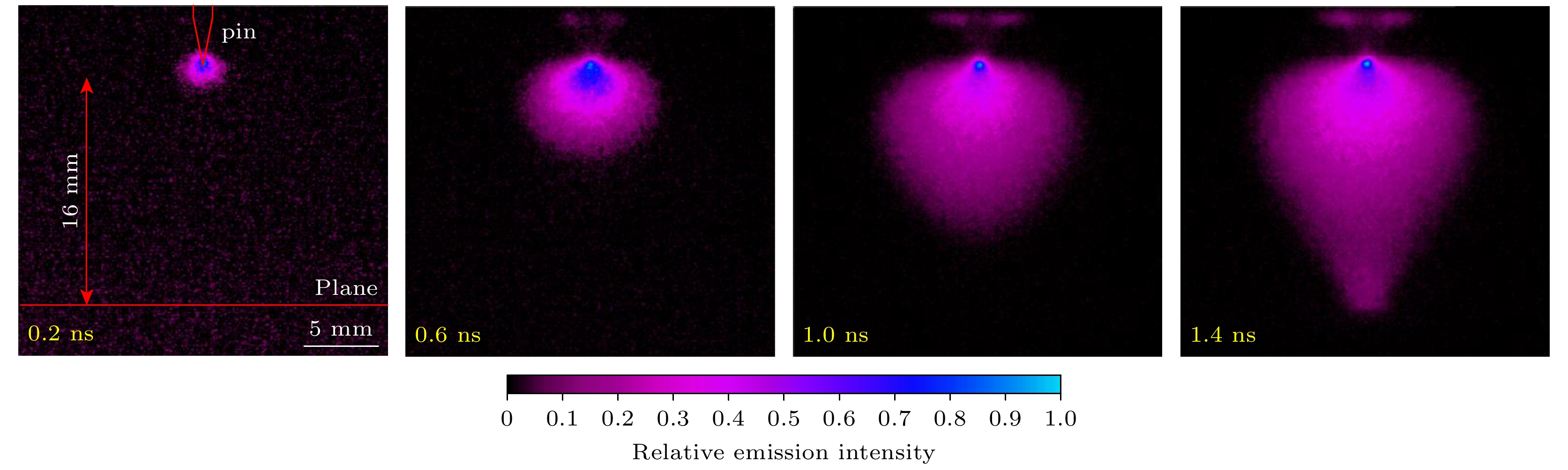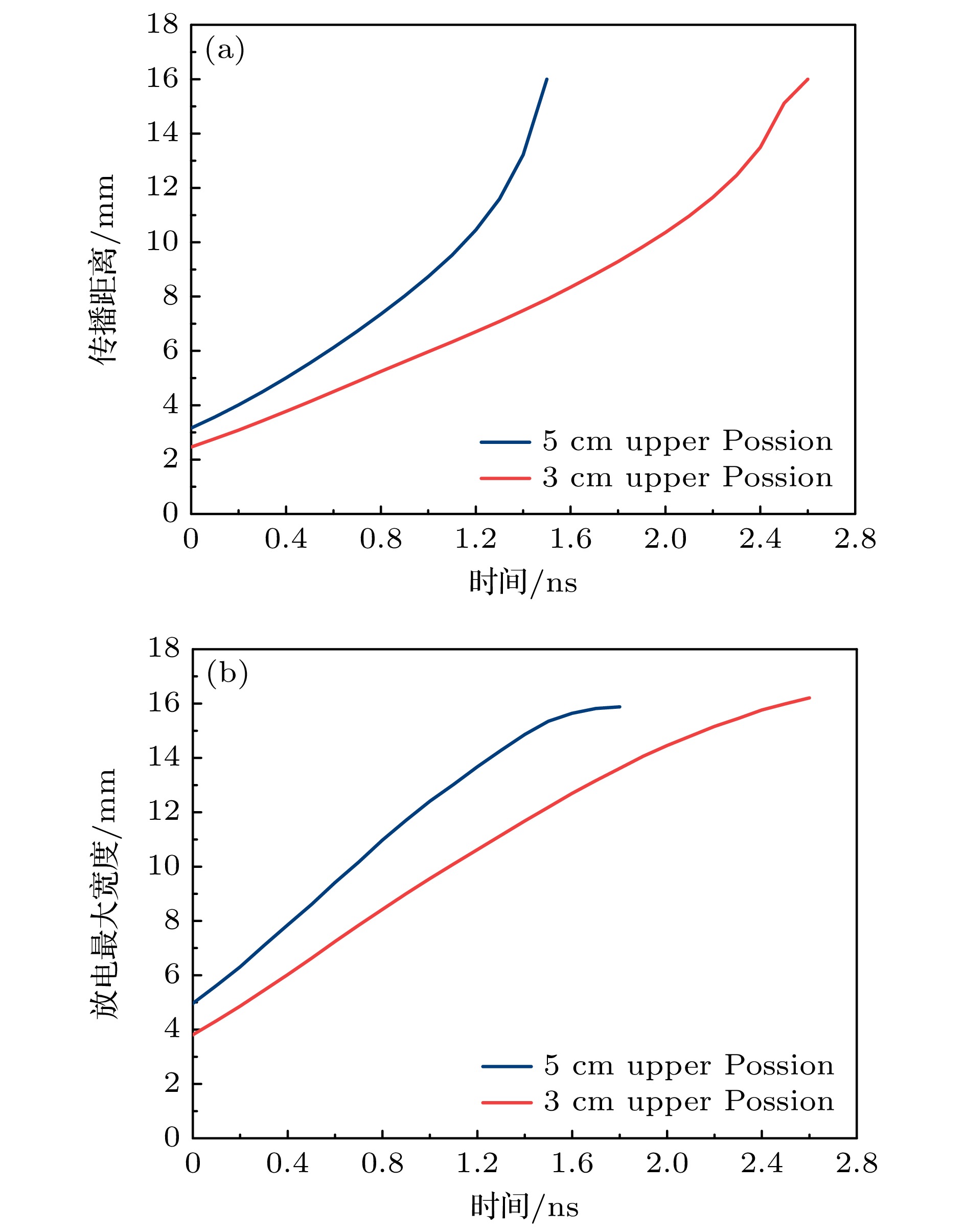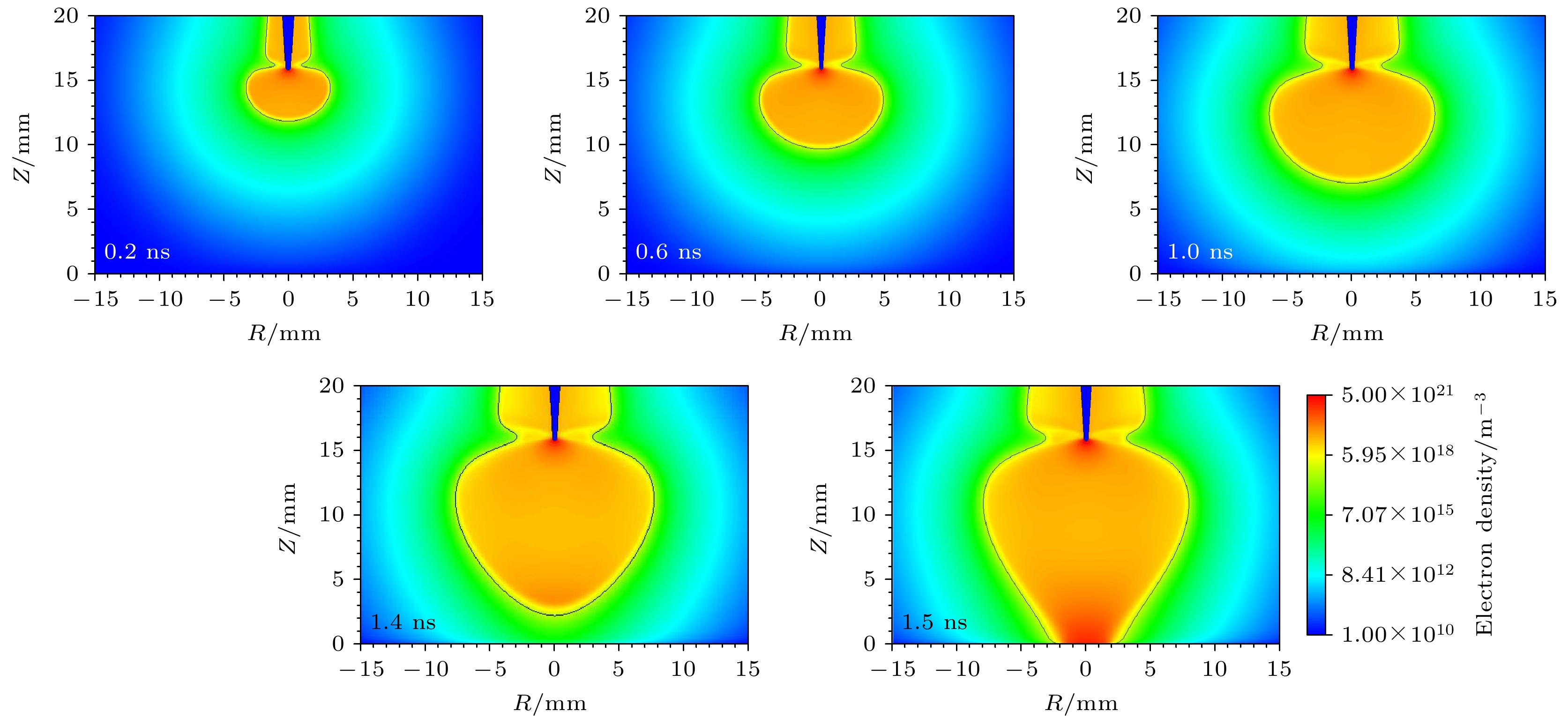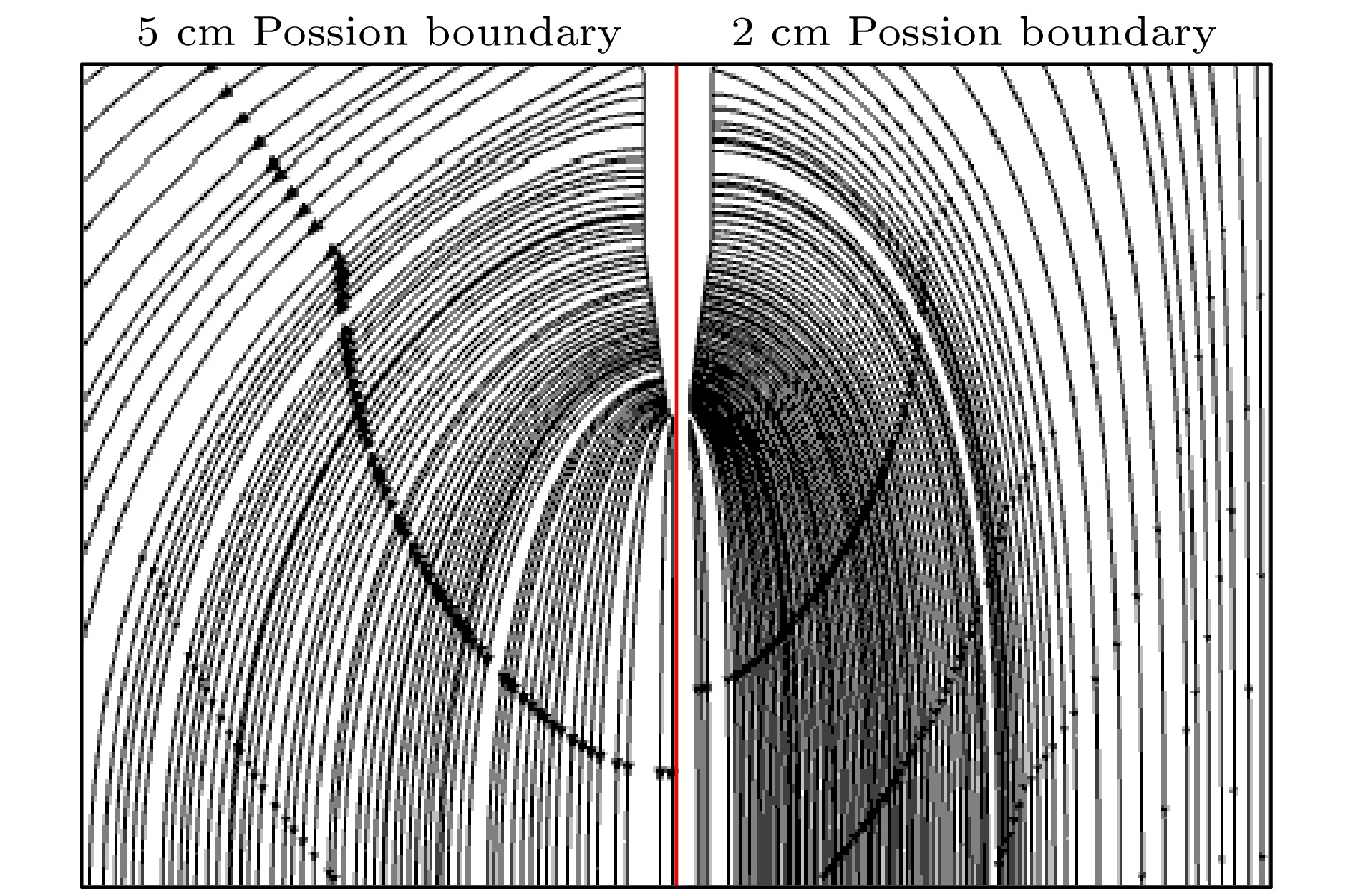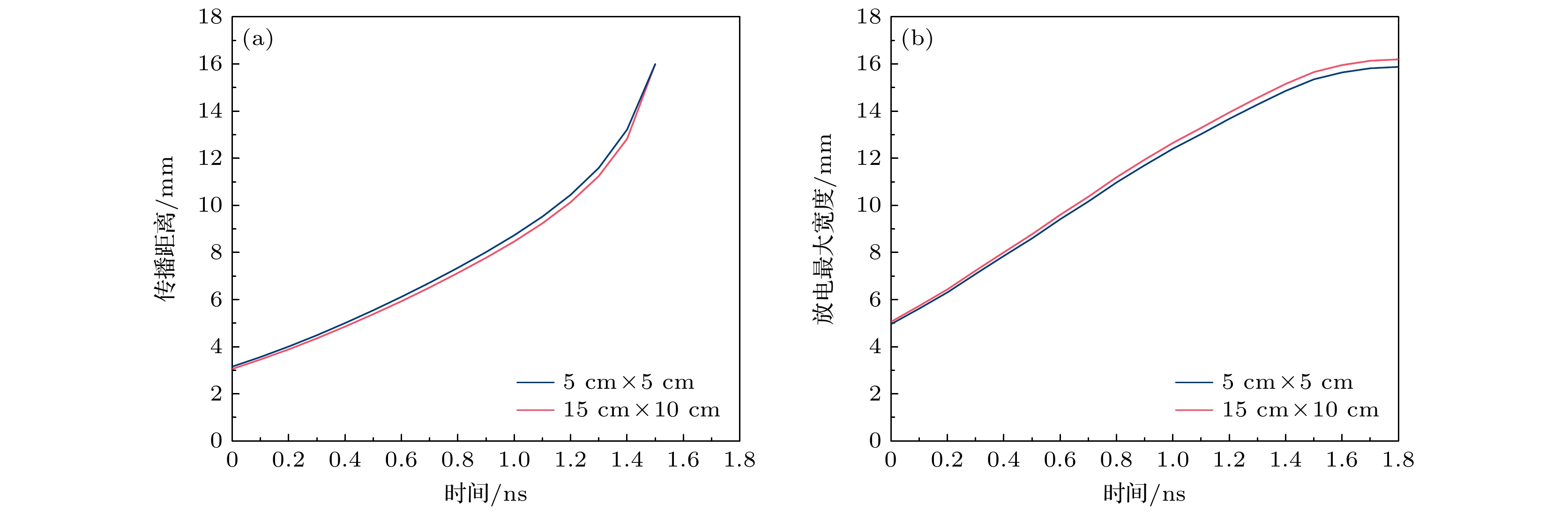 基于流体模型探讨了大气压空气中快纳秒脉冲上升沿引发的弥散放电对等离子体计算域边界与泊松方程计算域边界范围的敏感性和影响机制. 通过对比不同边界范围的仿真结果与实验数据, 尤其是位于整个矩形计算域的最上方边界(上边界)和最右侧边界(右边界): 1)当等离子体边界与泊松方程边界均采用比放电本身半径宽6倍以上的边界范围时, 放电宽度与传播速度与实验吻合度较高, 但放电到达板电极时刻仍存在流体模型所具有的普遍性延迟; 2)等离子体计算域边界的缩减仅使放电头部电场强度与电子密度产生可忽略的微弱波动, 证明其对弥散放电宏观特性影响甚微; 3)泊松方程计算域右边界范围缩减导致放电宽度显著降低, 其放电宽度-计算域比值递增, 且放电在上、下半间隙呈现非对称传播特征, 但适当缩减右边界可改善放电形貌与实验的匹配度; 4)泊松方程计算域上边界缩减会弱化放电头部电场“聚焦效应”, 导致空间电场分布均匀化, 延缓放电加速过程, 使仿真结果偏离实验更显著. 泊松方程边界范围对放电时空演化具有决定性影响, 其中计算域上边界缩减会严重损害仿真精度, 而右边界调整可权衡计算效率与结果可靠性.Diffuse discharges generated by fast rising edge of nanosecond pulses possess a larger discharge radius than classic streamer discharges. However, existing simulation studies often employ boundary ranges similar to those used for simulating streamer discharges, thus neglecting the influence of the boundary range on their characteristics. In this work, the characteristics of diffuse discharges in atmospheric-pressure air are investigated using a fluid model. The research focuses on the influences of plasma and Poisson equation boundary ranges, especially the top and right boundaries of the rectangular computational domain, on discharge evolution. The comparison between numerical simulations and experimental results reveals several key findings: When both plasma and Poisson equation boundaries are set to 5 cm×5 cm (exceeding six times the maximum discharge radius), the simulated discharge width and propagation velocity accord well with experimental measurements. However, consistent delays are observed in simulating the time required to reach the plate electrode, highlighting the inherent limitations of current fluid models in accurately simulating temporal scales. Reducing the plasma boundaries results in negligible fluctuations in electric field strength and electron density at the discharge head, indicating a minimal effect on macroscopic discharge characteristics. Narrowing the Poisson equation’s right boundary significantly reduces the discharge width while simultaneously increasing the discharge width relative to the domain size. Asymmetric propagation patterns occur between the upper and lower halves of the discharge gap. Nevertheless, appropriate reduction of the right boundary improves morphological consistency with experimental observations, thereby suggesting practical optimization strategies. Conversely, reducing the top boundary weakens the electric field “focusing effect” at the discharge head, homogenizes the spatial field distribution, and delays accelerating, thereby exacerbating deviations from experimental data. These results demonstrate that Poisson boundary conditions critically govern spatiotemporal discharge dynamics. Top boundary truncation significantly reduces the simulation accuracy, whereas adjusting the right boundary allows for a balanced optimization between computational efficiency and result reliability. This work provides theoretical guidance for selecting boundary conditions in the numerical modeling of diffuse discharges.