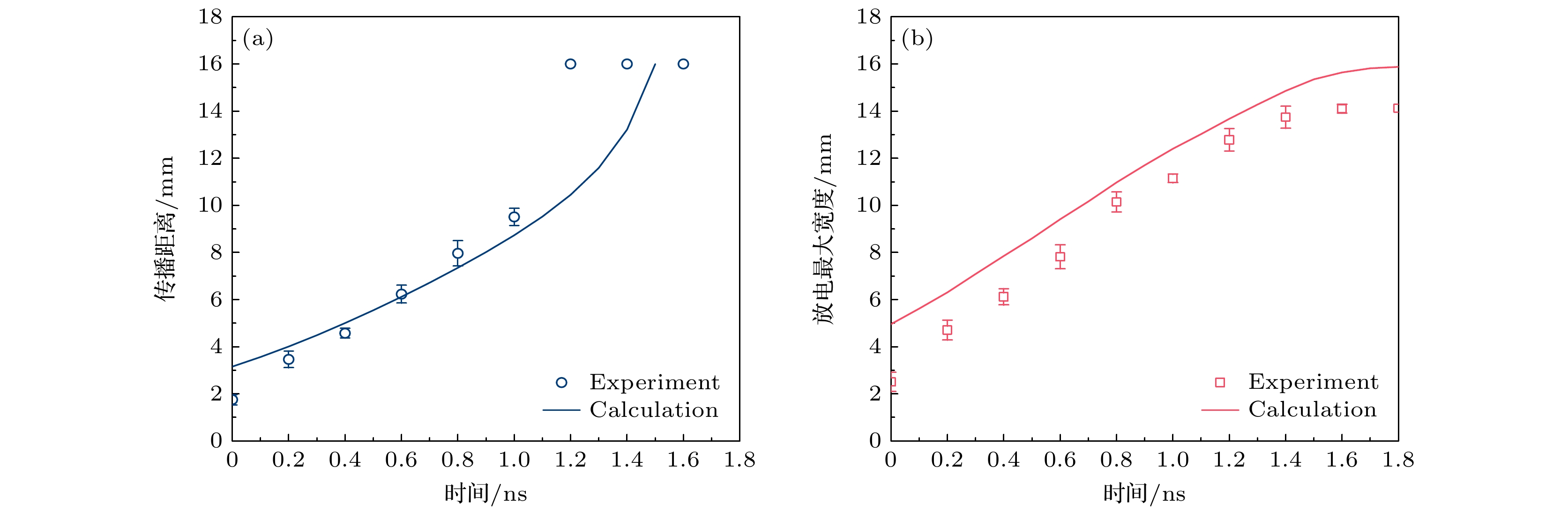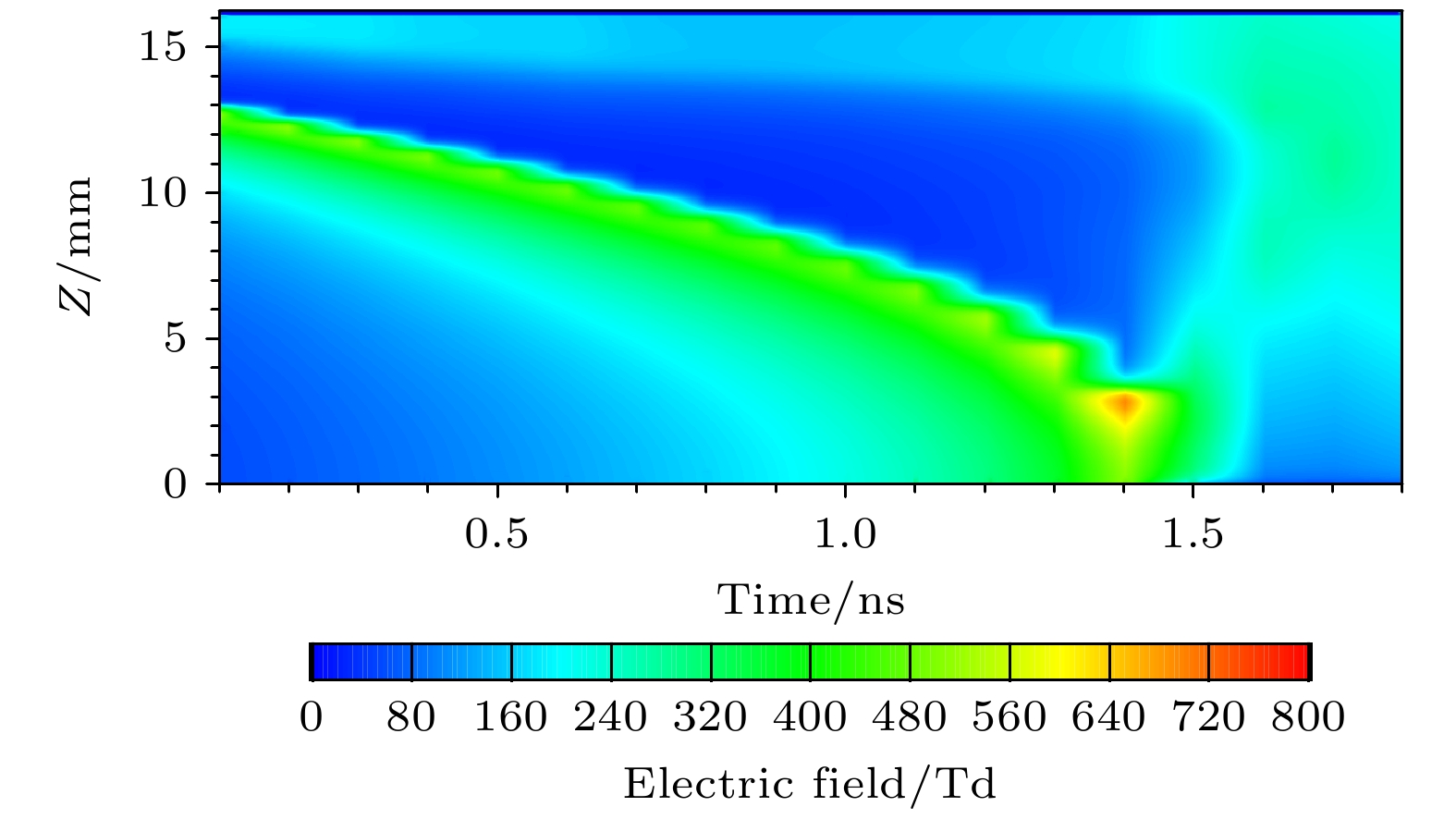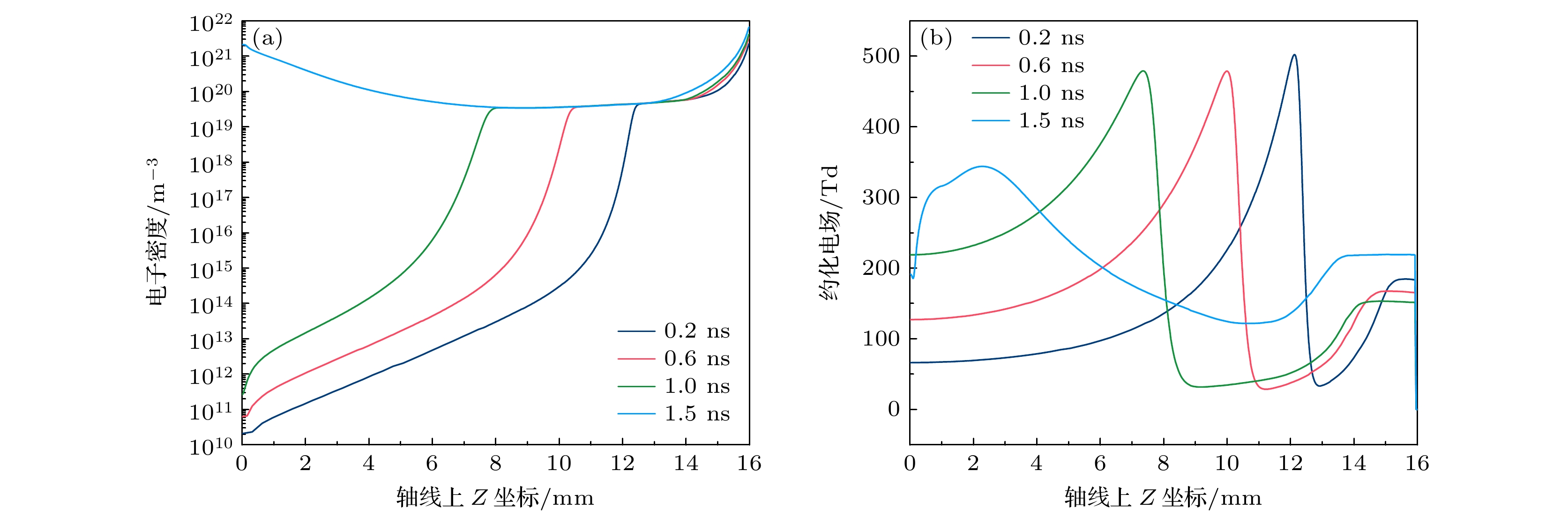 通量方向 电子 正离子 负离子 电子能量 阳极向外 0 $ \nabla n = 0 $ 0 0 阳极向内 $ \nabla n = 0 $ 0 $ \nabla n = 0 $ $ \varGamma = {\varGamma _{\text{e}}}{n_{{\varepsilon }}} $ 阴极向外 $ \nabla n = 0 $ 0 $ \nabla n = 0 $ $ \varGamma = {\varGamma _{\text{e}}}{n_{{\varepsilon }}} $ 阴极向内 0 $ \nabla n = 0 $ 0 0 反应 反应速率 文献 R1 e+N2$ \to {\text{N}}_{2}^{+} $+e+e f(σ, ε) [16] R2 e+O2$ \to {\text{O}}_{2}^{+} $+e+e f(σ, ε) [17] R3 e+O2+O2$ \to {\text{O}}_{2}^{-} $+O2 f(ε) [17] R4 e+O2$ \to $O–+O f(ε) [17] R5 $ {\text{O}}_{2}^{-} $+M $ \to $e+O2+M f(ε) [18] R6 O–+ N2$ \to $e+N2O f(ε) [18] R7 O–+ O2$ \to {\text{O}}_{2}^{-} $+O2 f(ε) [18] R8 O–+O2+M $ \to {\text{O}}_{3}^{-} $+M f(ε) [18] R9 $ {\text{N}}_{2}^{+} $+N2+M $ \to {\text{N}}_{4}^{+} $+M $5 \times 10^{-29} \times \Big(\dfrac{300}{T_{\rm gas}}\Big)^2 $ [19] R10 $ {\text{O}}_{2}^{+} $+O2+M $ \to {\text{O}}_{4}^{+} $+M $2.4 \times 10^{-30} \times \Big(\dfrac{300}{T_{\rm gas}}\Big)^3 $ [19] R11 $ {\text{N}}_{4}^{+} + {\mathrm{O}}_2 \to {\text{O}}_{2}^{+} + {\mathrm{N}}_2 + {\mathrm{N}}_2$ 2.5×10–10 [19] R12 e+$ {\text{O}}_{4}^{+}\to $O2+O2 $1.4 \times 10^{-6} \times \Big(\dfrac{300}{T_{\rm gas}}\Big)^{0.5} $ [19] R13 e+$ {\text{N}}_{4}^{+}\to $N2+N2 $2 \times 10^{-6} \times \Big(\dfrac{300}{T_{\rm gas}}\Big)^{0.5} $ [19] R14 e+N2$ \to $e+ N2(C3Πu) f(ε) [16] R15 N2(C3Πu) $ \to $N2+hv 2.38×107 [20] R16 $ {\text{N}}_{2}^{+} $+ O–$ \to $N+N+O 10–7 [19] R17 $ {\text{N}}_{2}^{+} $+$ {\text{O}}_{2}^{-}\to $N+N+O2 10–7 [19] R18 $ {\text{N}}_{2}^{+} $+$ {\text{O}}_{3}^{-}\to $N+N+O3 10–7 [19] R19 $ {\text{O}}_{2}^{+} $+ O–$ \to $O+O+O 10–7 [19] R20 $ {\text{O}}_{2}^{+} $+$ {\text{O}}_{2}^{-}\to $O+O+O2 10–7 [19] R21 $ {\text{O}}_{2}^{+} $+$ {\text{O}}_{3}^{-}\to $O+O+O3 10–7 [19] R22 $ {\text{O}}_{4}^{+} $+ O–$ \to $O2+O2+O 10–7 [19] R23 $ {\text{O}}_{4}^{+} + {\text{O}}_{2}^{-} \to {\mathrm{O}}_2 + {\mathrm{O}}_2 + {\mathrm{O}}_2 $ 10–7 [19] R24 $ {\text{O}}_{4}^{+} + {\text{O}}_{3}^{-} \to {\mathrm{O}}_2 + {\mathrm{O}}_2 + {\mathrm{O}}_3 $ 10–7 [19] R25 $ {\text{N}}_{4}^{+} $+ O–$ \to $N2+N2+O 10–7 [19] R26 $ {\text{N}}_{4}^{+} + {\text{O}}_{2}^{-}\to {\mathrm{N}}_2 + {\mathrm{N}}_2 + {\mathrm{O}}_2 $ 10–7 [19] R27 $ {\text{N}}_{4}^{+} + {\text{O}}_{3}^{-}\to {\mathrm{N}}_2 + {\mathrm{N}}_2 + {\mathrm{O}}_3 $ 10–7 [19] -