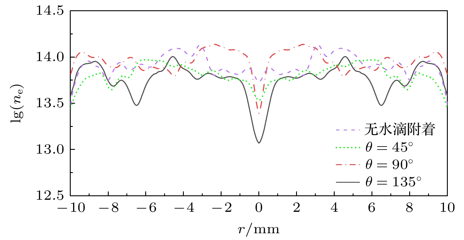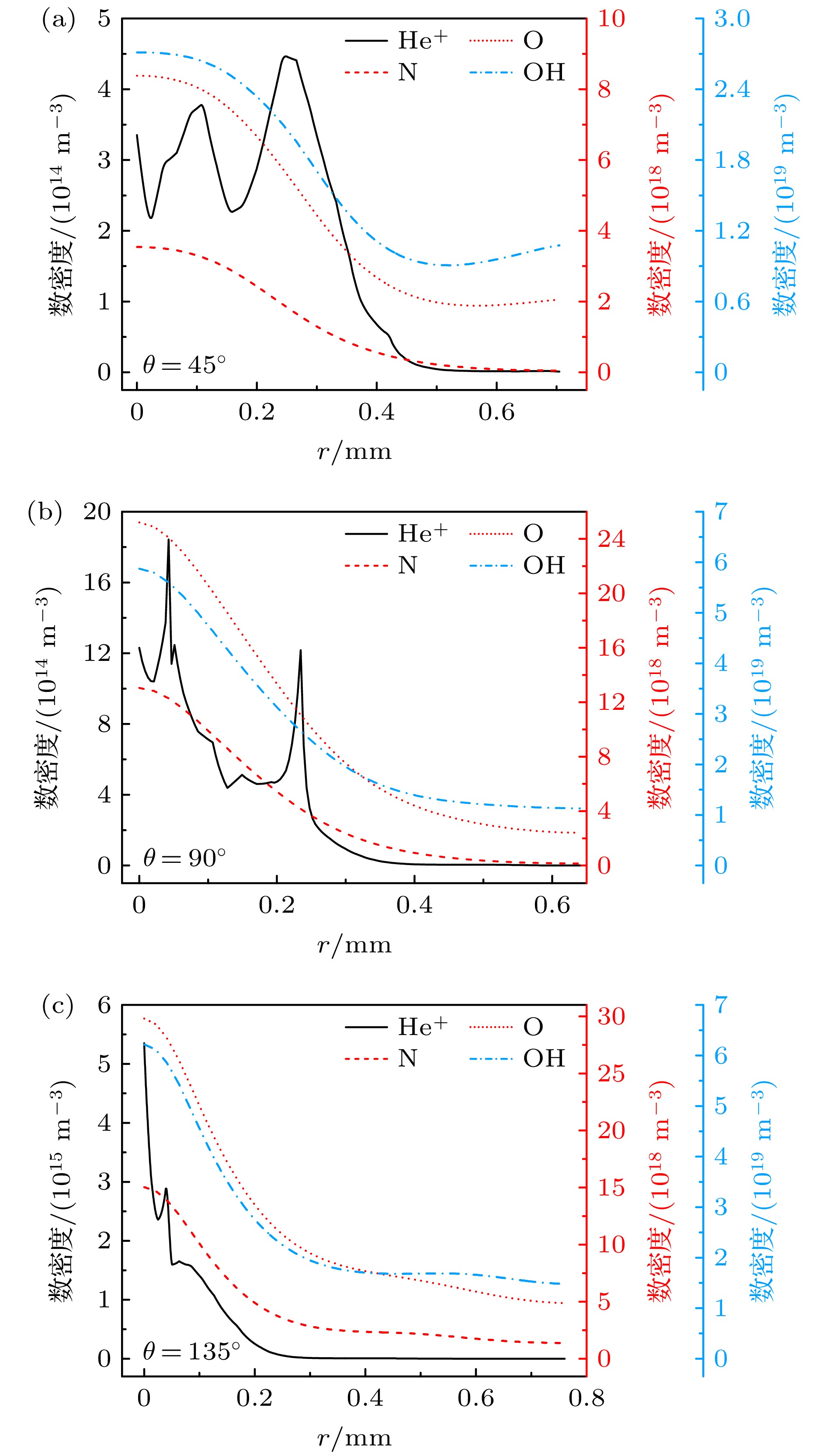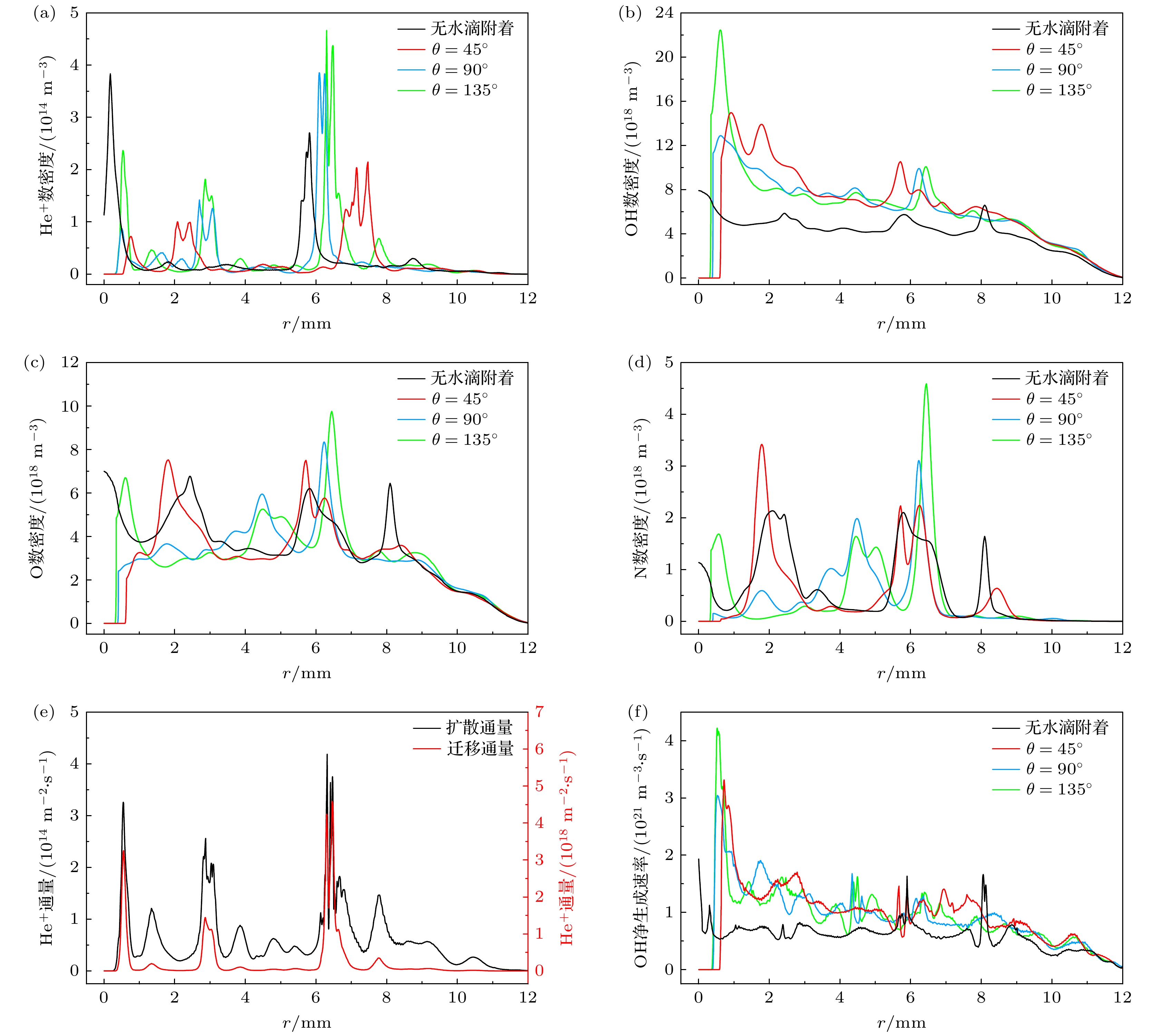 • 在大气压介质阻挡放电的某些应用场景中, 待处理物表面附着的水滴会改变气隙宽度、介电分布、气相成分等条件, 进而影响低温等离子体的应用效果. 本文建立了大气压氦气介质阻挡放电仿真模型, 探究了接触角为45°, 90°和135°的水滴附着于待处理物表面时稳态放电结构与活性粒子分布受到的影响及其背后机制. 结果表明, 水滴表面与上方区域的稳态放电强度受到削弱, 这是因为在负击穿中, 水滴表面的极化电场增强了等离子体双极性扩散, 促成环形放电抑制区; 在次正放电阶段, 水滴极化导致的种子电子清除效应抑制了水滴上方区域放电, 上述放电抑制作用随水滴接触角变大而提升. 在化学分布部分, 待处理物和水滴表面的活性粒子与电子存在着协同分布关系, 其中O与N的分布会因O2与N2键能的不同产生差异, OH与He+的分布则分别受到水滴蒸发与电场的影响. 本文系统地阐述了水滴附着对介质阻挡放电电化学过程的影响机制, 为等离子体-液滴系统的相关应用提供了理论指导.