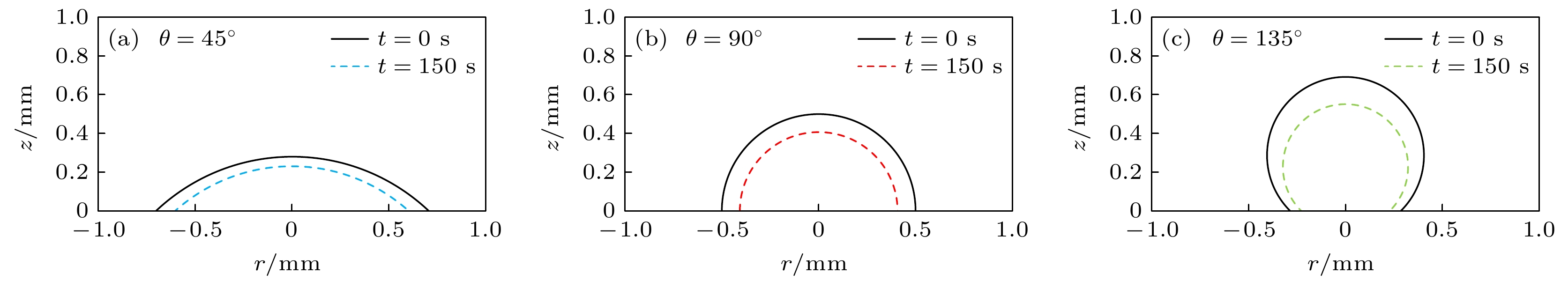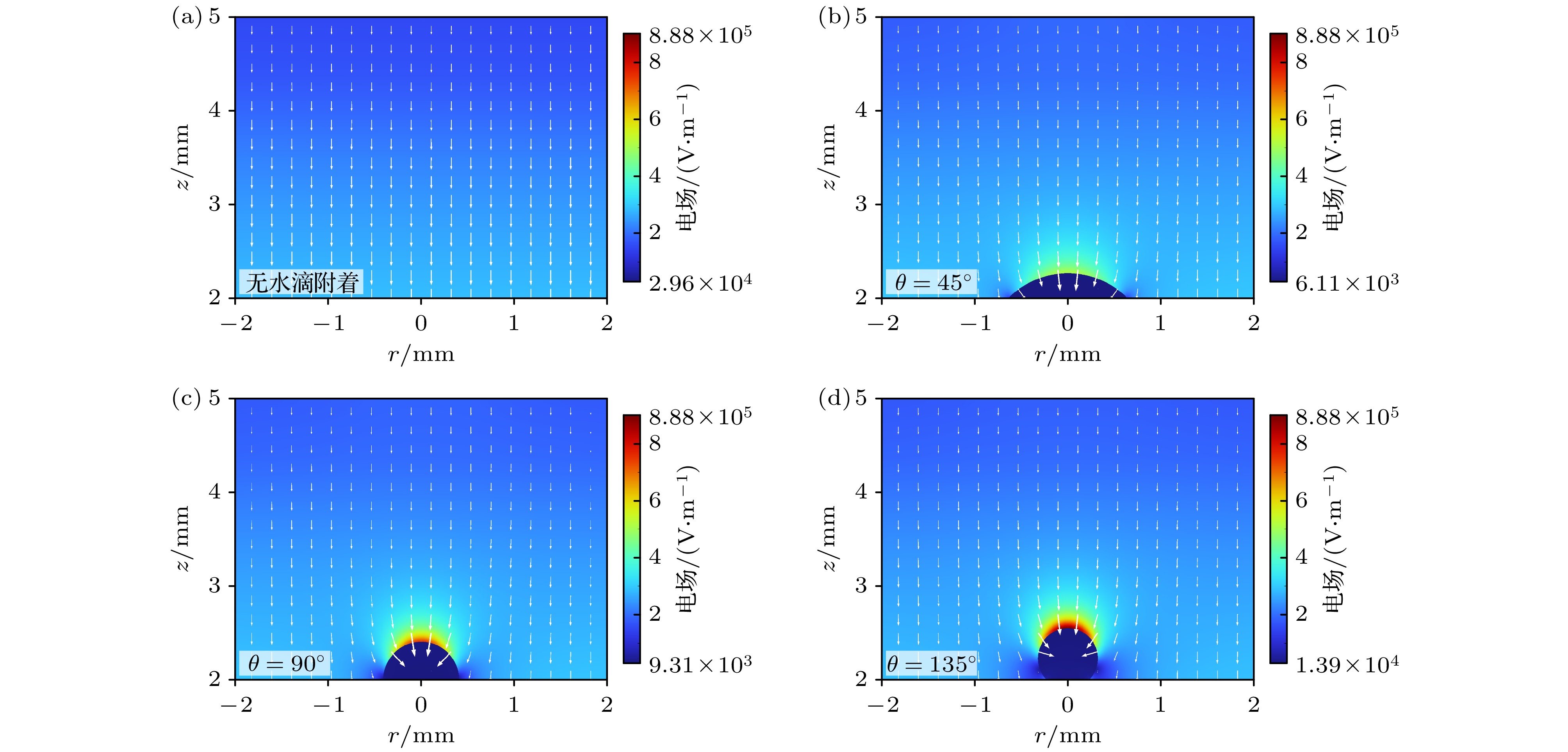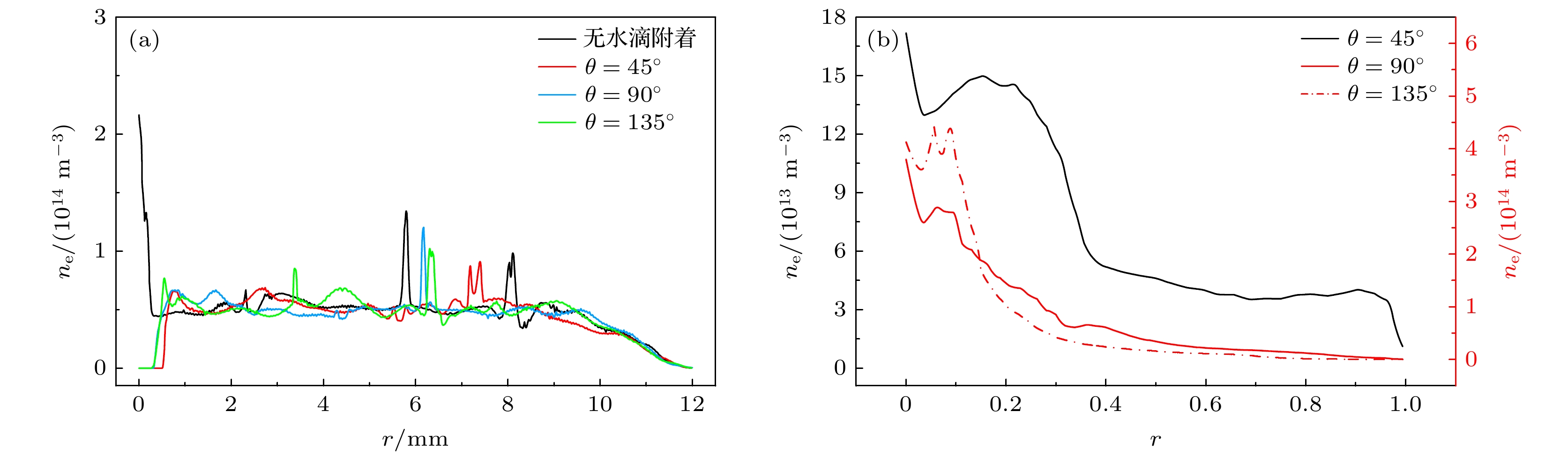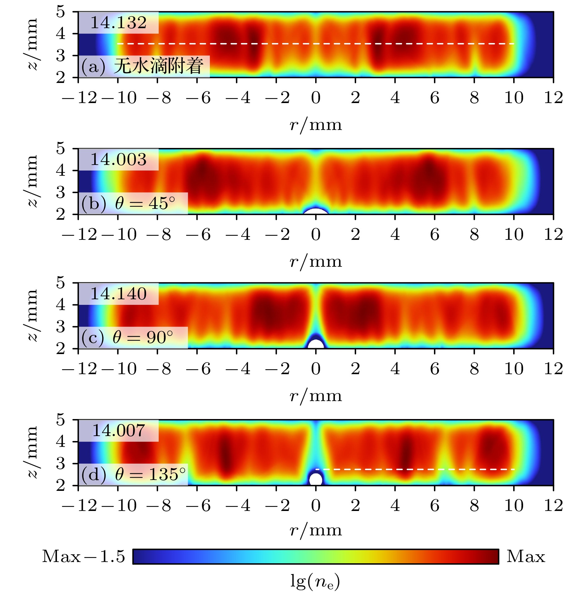 • 在大气压介质阻挡放电的某些应用场景中, 待处理物表面附着的水滴会改变气隙宽度、介电分布、气相成分等条件, 进而影响低温等离子体的应用效果. 本文建立了大气压氦气介质阻挡放电仿真模型, 探究了接触角为45°, 90°和135°的水滴附着于待处理物表面时稳态放电结构与活性粒子分布受到的影响及其背后机制. 结果表明, 水滴表面与上方区域的稳态放电强度受到削弱, 这是因为在负击穿中, 水滴表面的极化电场增强了等离子体双极性扩散, 促成环形放电抑制区; 在次正放电阶段, 水滴极化导致的种子电子清除效应抑制了水滴上方区域放电, 上述放电抑制作用随水滴接触角变大而提升. 在化学分布部分, 待处理物和水滴表面的活性粒子与电子存在着协同分布关系, 其中O与N的分布会因O2与N2键能的不同产生差异, OH与He+的分布则分别受到水滴蒸发与电场的影响. 本文系统地阐述了水滴附着对介质阻挡放电电化学过程的影响机制, 为等离子体-液滴系统的相关应用提供了理论指导.