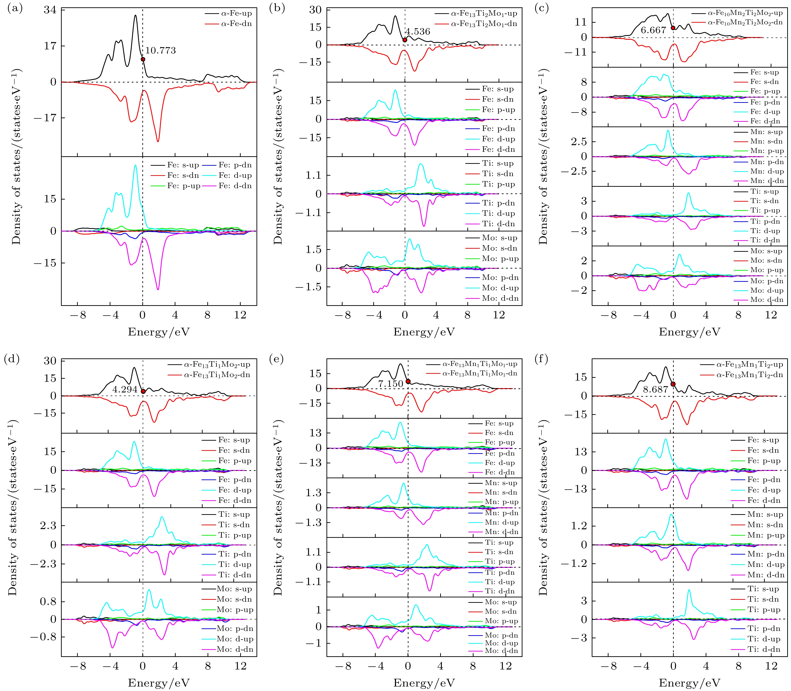Ferrite (α-Fe), as a fundamental phase of steel materials, plays a decisive role in determining their macroscopic mechanical behaviors through its microscopic properties, particularly in engineering applications involving resistance to plastic deformation and fracture, fatigue resistance, wear resistance, and low-temperature toughness. Therefore, alloying elements are commonly introduced to improve the performance of steel via mechanisms such as grain refinement strengthening and precipitation strengthening. However, in these strengthening mechanisms, the effects of doped alloying elements on the stability, electronic structure, and mechanical properties of ferrite itself have not been thoroughly investigated. In this study, orthogonal experimental design and first-principles calculations are employed to investigate the effects of ternary alloy doping with M (Mn, Ti, Mo) on the stabilities, electronic structures, and mechanical properties of a ferrite-based supercell model Fe16-x-y-zMnxTiyMoz (x, y, or z = 0, 1, or 2), aiming to provide both theoretical insight and experimental reference for improving the comprehensive performance of ferrite-based steels by modifying the properties of the matrix phase. The results of the formation enthalpy (Hform) calculations indicate that all solid solutions have negative formation enthalpies, suggesting that they can form spontaneously. Among them, Ti doping is the most favorable for solid solution formation, followed by Mn, with Mo being the least favorable. The Fe13Ti1Mo2 configuration is the easiest to form spontaneously. The cohesive energy (Ecoh) results demonstrate that all solid solutions exhibit structural stabilities. Fe13Ti1Mo2 has the largest (most negative) cohesive energy of –477.96 eV, indicating that it possesses the highest structural stability. The contribution of Mo doping to stability enhancement is the greatest, followed by Ti, while the influence of Mn is the smallest. Electronic structure calculations reveal that M doping consistently reduces the density of states (DOS) at the Fermi level for Fe16-x-y-zMnxTiyMoz. The lowest DOS at the Fermi level is found to be 4.294 in Fe13Ti1Mo2, indicating enhanced hybridization and overlap between Mn 3d, Ti 3d, Mo 4d, and Fe 3d states. This strong hybridization leads to a decrease in the Fermi level and contributes to the high stability of the Fe13Ti1Mo2 phase. Mechanical property calculations indicate that M doping reduces the Young’s modulus (E) and Vickers hardness (HV) of the solid solutions. However, the K values (K = GH/BH) are all greater than 1.75, and Poisson’s ratios (ν) exceed 0.26, implying that while stiffness and hardness decrease, the ductility of the materials is improved. This study provides valuable guidance for designing ductile and tough ferrite-based steel materials.
