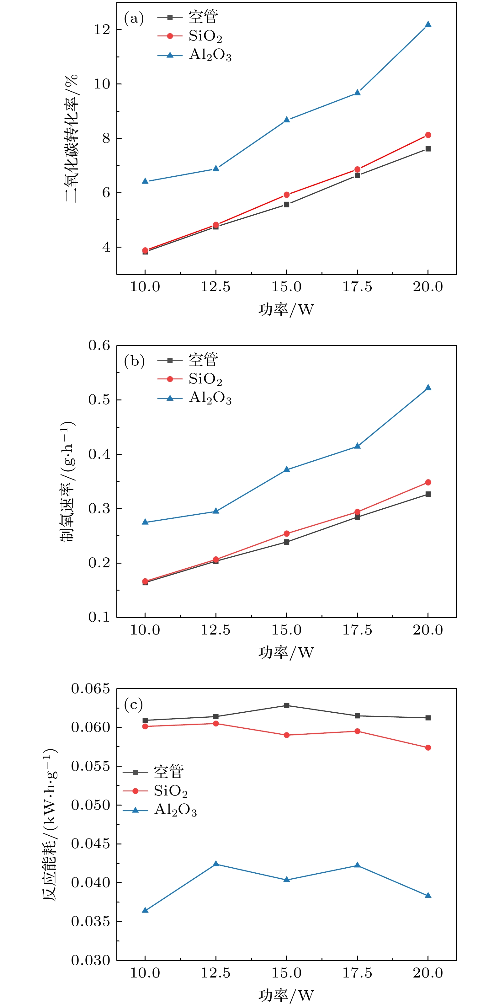 The utilization of in-situ resource on Mars is currently one of the key research focuses in deep space exploration. Non-thermal plasma technology provides a promising approach for in-situ conversion of high-concentration CO2 in the Martian atmosphere, with advantages such as strong environmental adaptability and high system efficiency. In this study, a coaxial packed-bed dielectric barrier discharge reactor is employed to investigate the discharge characteristics of simulated Martian atmospheric CO2, with particular emphasis on the effects of SiO2 and Al2O3 packing materials on CO2 conversion performance and energy consumption. Through in-situ spectral diagnostics, the variation patterns of characteristic spectral lines of excited-state CO2 and O2 under different operating conditions are investigated in this work. It is found that increasing the discharge power promotes the generation of excited-state reactive species, which facilitates the activation and conversion of carbon dioxide. Furthermore, increasing the discharge power effectively enhances the electric field strength in CO2 discharge. Compared with plasma only and the use of SiO2 packing material, the system exhibits a more significant electric field enhancement effect when packed with Al2O3 beads. Based on numerical simulations, the electron impact reaction rate constant and electron energy distribution function of CO2 discharge are obtained. The results reveal that packing the discharge gap with Al2O3 material significantly changes the physical characteristics of CO2 discharge, enhances both the electric field strength and the mean electron energy, thereby generating more high-energy electrons and asymmetric vibrational excited states of CO2. This ultimately promotes the CO2 decomposition reaction for oxygen production. Finally, the study examines the effectiveness of CO2 decomposition for oxygen production under various typical operating conditions. It is demonstrated that increasing the discharge power and packing with Al2O3 both contribute to improving the CO2 conversion rate and oxygen production rate, while reducing the energy consumption of the reaction. The introduction of Al2O3 packing enhances the electric field strength, thereby improving CO2 conversion and O2 production, achieving a CO2 conversion rate of 12.18% and a minimum energy consumption of 0.36 kWh/g. This study provides theoretical and experimental support for the future applications of non-thermal plasma technology in the in-situ resource utilization of Martian atmosphere, offering insights into sustainable resource utilization in deep space exploration.