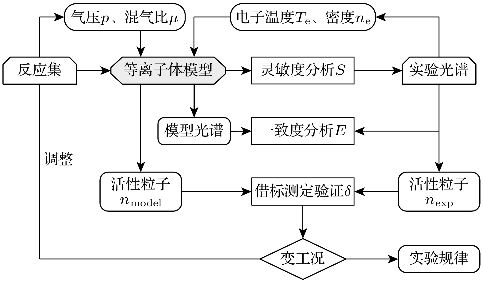 $ \sigma ({E_{\text{e}}}) $: 激发截面; $ f({E_{\text{e}}}) $: 电子能量分布E4 $ {R_{\text{S}}} = {K_{\text{S}}}{n_{\text{s}}} $ $ {n_{\text{s}}} $: 表面损失物质密度 E5 $ K_S^{\text{n}} = {\left[ {\dfrac{{{\varLambda ^2}}}{{{D_{\text{n}}}}} + \dfrac{{2 V(2 - \gamma )}}{{S{u_{\text{n}}}\gamma }}} \right]^{ - 1}} $ $ K_S^{\text{n}} $: 中性粒子表面损失系数; $ {D_{\text{n}}} $: 扩散系数; $ \gamma $: 表面黏附系数;