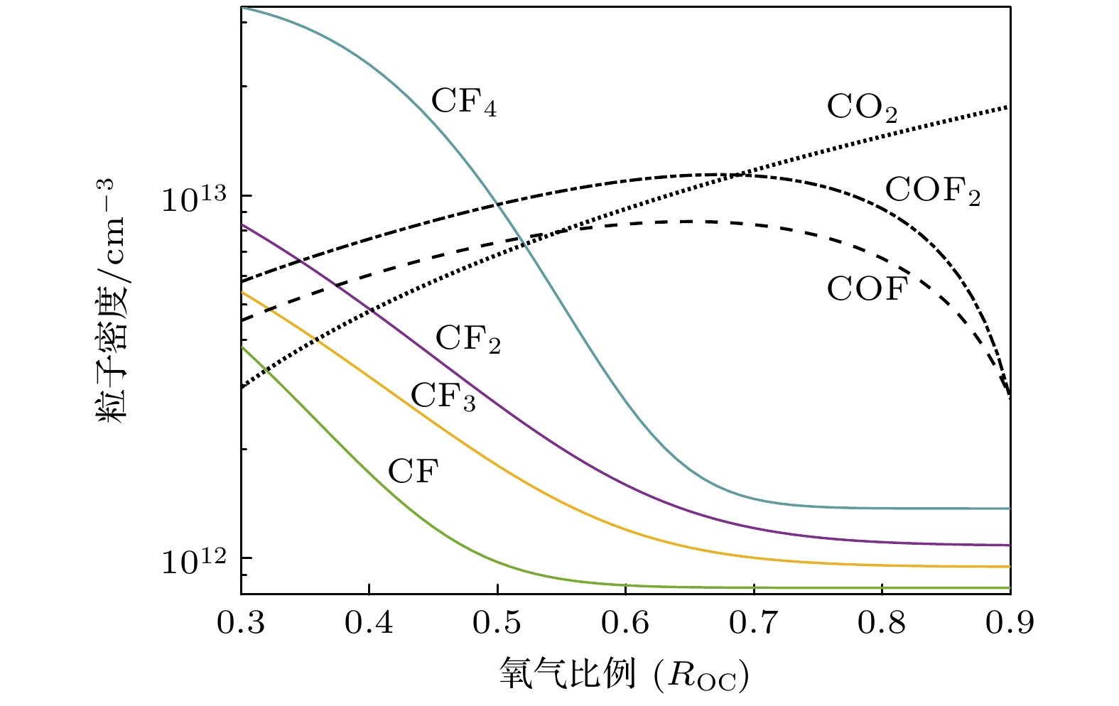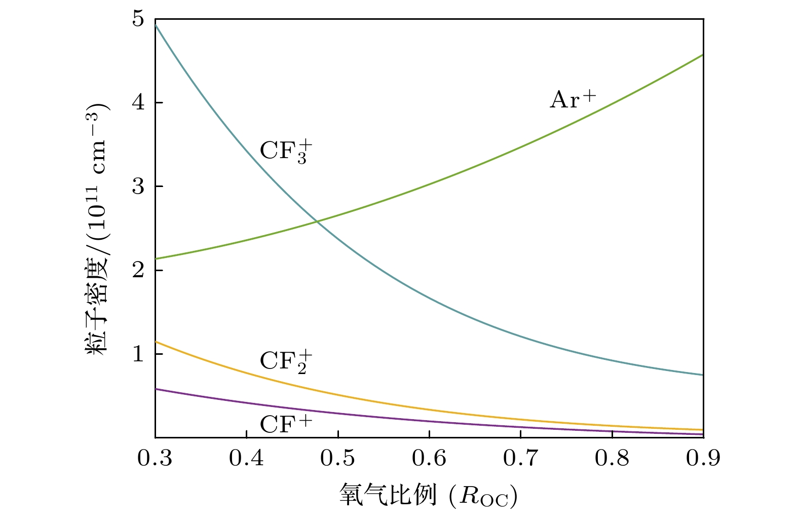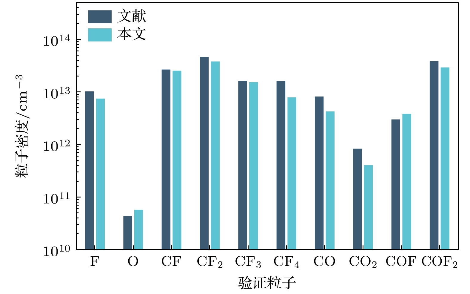 $ {u_{\text{n}}} $: 平均热速度; V, S : 反应腔室体积和表面积E6 $ {\varLambda ^{ - 2}} = {\left( {{{\pi}}/{l}} \right)^2} + {\left( {{{2.405}}/{r}} \right)^2} $ $ \varLambda $: 有效扩散长度; l, r : 反应腔室高度和半径 E7 $ K_{\text{S}}^{+} = 2{u_{\text{B}}}\left( {{{h_{\text{l}}}}}/{l} + {{{h_{\text{r}}}}}/{r}\right) $ $ K_{\text{S}}^{+} $: 离子表面损失系数; $ {u_{\text{B}}} $: 玻姆速度; E8 ${h_{\text{l}}} = 0.86{\left[ {3.0 + {l}/({{2\lambda }})} \right]^{-1/2}}$ ${h_{\text{l}}}$: 轴向边界-中心离子密度比; $\lambda $: 平均自由程 E9 $ h_{\text{r}}=0.80\left(4.0 + {r}/{\lambda}\right)^{-1/2} $ ${h_{\text{r}}}$: 径向边界-中心离子密度比 类别 物种 离子 $ \mathrm{CF}_3^+ $, ${\mathrm{CF}}_2^+ $, CF+, Ar+ 自由基 CF3, CF2, CF, COF, F, C, O 中性产物 C2F4, CF4, F2, COF2, CO, CO2 原料气体 C4F8, O2, Ar 类别 物种 Ar* Ar(1s5)-Ar(1s2), Ar(2p10)-Ar(2p1) O* O(2p.1D), O(2p.1S), O(3s.3So), O(3s.5So), O(3p.3P), O(3p.5P), O(3p.3Do), O(3p.5Do) F* F(3s.2P), F(3s.4P), F(3s.2D), F(3p.2So), F(3p.4So), F(3p.2Po), F(3p.4Po), F(3p.2Do), F(3p.4Do) CF* CF(a4Σ–), CF(A2Σ), CF(b4Π), CF(B2Δ), CF(C2Σ–) ${\mathrm{CF}}^*_2 $ CF2(A1B1), CF2(X1A2), CF2(X3A2), CF2(X3B1), CF2(X3B2) CO* CO(a3Π), CO(A1Π), CO(b3Σ), CO(B1Σ) 反应编号 反应式 速率系数/(cm3·s–1) 参考文献 a b c 电子碰撞反应 R1 e + C4F8 → 2C2F4 + e 9.58 × 10–8 0.042 8.572 [12] R2 e + C2F4 → 2CF2 + e 1.32 × 10–8 0.412 6.329 [12] R3 e + CF4 → CF3 + F + e 2.10 × 10–9 0.936 12.004 [35] R4 e + CF3 → CF2 + F + e 7.94 × 10–8 –0.452 12.100 [12] R5 e + CF2 → CF + F + e 1.16 × 10–8 –0.380 –14.350 [12] R6 e + CF → C + F + e 4.51 × 10–8 –0.110 8.941 [12] R7 e + F2 → 2F + e 1.08 × 10–8 –0.296 4.464 [12] R8 e + COF2 → COF + F + e 3.20 × 10–9 0.013 10.300 [36] R9 e + CO2 → CO + O + e 2.90 × 10–9 0.302 12.100 [37] R10 e + CO → C + O + e 1.54 × 10–8 0.270 14.600 [38] R11 e + O2 → 2O + e 1.71 × 10–8 –1.270 7.310 [39] R12 e + CF4 → ${\mathrm{CF}}_3^+ $ + F + 2e 2.29 × 10–8 0.680 18.304 [35] R13 e + CF3 → ${\mathrm{CF}}_2^+ $ + F + 2e 7.02 × 10–9 0.430 16.280 [12] R14 e + CF2 → CF+ + F + 2e 5.43 × 10–9 0.561 14.290 [12] R15 e + ${\mathrm{CF}}_3^+ $ → CF2 + F 6.54 × 10–8 –0.500 0.025 [13] R16 e + ${\mathrm{CF}}_2^+ $ → CF + F 6.54 × 10–8 –0.500 0.025 [13] R17 e + CF+ → C + F 6.54 × 10–8 –0.500 0.025 [13] R18 e + CF3 → ${\mathrm{CF}}_3^+ $ + 2e 1.36 × 10–9 0.796 9.057 [12] R19 e + CF2 → ${\mathrm{CF}}_2^+ $ + 2e 1.10 × 10–8 0.393 11.370 [12] R20 e + CF → CF+ + 2e 5.48 × 10–9 0.556 9.723 [12] R21 e + Ar → Ar+ + 2e 7.35 × 10–8 0.208 19.100 [40] 电荷交换反应 R22 $ {\mathrm{CF}}_2^+$ + CF → ${\mathrm{CF}}_3^+ $ + C 2.06 × 10–9 0 0 [13] R23 ${\mathrm{CF}}_2^+ $ + C → CF+ + CF 1.04 × 10–9 0 0 [13] R24 CF+ + CF3 → ${\mathrm{CF}}_3^+ $ + CF 1.71 × 10–9 0 0 [13] R25 CF+ + CF2 → ${\mathrm{CF}}_2^+ $ + CF 1.00 × 10–9 0 0 [13] R26 Ar+ + CF4 → ${\mathrm{CF}}_3^+ $ + F + Ar 4.80 × 10–10 0 0 [13] R27 Ar+ + CF3 → ${\mathrm{CF}}_2^+ $ + F + Ar 5.00 × 10–10 0 0 [13] R28 Ar+ + CF2 → CF+ + F + Ar 5.00 × 10–10 0 0 [13] 氧化反应 R29 CF3 + O → COF2 + F 3.30 × 10–11 0 0 [13] R30 CF2 + O → COF + F 3.10 × 10–11 0 0 [13] R31 CF + O → CO + F 6.60 × 10–11 0 0 [13] R32 COF + O → CO2 + F 9.30 × 10–11 0 0 [13] R33 COF + COF → COF2 + CO 1.00 × 10–11 0 0 [13] R34 C + CO2 → 2CO 1.00 × 10–15 0 0 [41] R35 COF + CF3 → COF2 + CF2 1.00 × 10–11 0 0 [13] R36 COF + CF2 → COF2 + CF 3.00 × 10–13 0 0 [13] R37 COF + CF3 → CO + CF4 1.00 × 10–11 0 0 [13] R38 COF + CF2 → CO + CF3 3.00 × 10–13 0 0 [13] 重组反应 R39 F + CF3 → CF4 2.00 × 10–11 0 0 [13] R40 F + CF2 → CF3 1.80 × 10–11 0 0 [13] R41 F + CF → CF2 9.96 × 10–11 0 0 [13] R42 F2 + CF3 → CF4 + F 1.90 × 10–14 0 0 [13] R43 F2 + CF2 → CF3 + F 8.30 × 10–14 0 0 [13] 反应编号 反应式 速率系数 原子扩散 R44 O → $\dfrac{1}{2} $O2 4.20 × 103 s–1 R45 F → $\dfrac{1}{2} $F2 3.2 × 102 s–1 离子扩散 R46 ${\mathrm{CF}}_3^+ $ → CF3 6.73 × 103 s–1 R47 ${\mathrm{CF}}_2^+ $ → CF2 7.91 × 103 s–1 R48 CF+ → CF 1.00 × 104 s–1 R49 Ar+ → Ar 8.85 × 103 s–1 等效表面反应 R50 C2F4 + C2F4 → C4F8 1.00 × 10–11 cm3/s R51 CF2 + CF2 → C2F4 1.00 × 10–11 cm3/s R52 C + F → CF 1.00 × 10–11 cm3/s 参数 Kimura和Noto Lee等[56] ICP腔室尺寸 半径/mm 80 80 高度/mm 80 130 放电工况 气压/mTorr 30 10 功率/W 140 700 气流/sccm 40 40 等离子参数 电子温度/eV 2.93—3.05 3.60—4.25 电子密度/cm–3 5.48 × 1010—