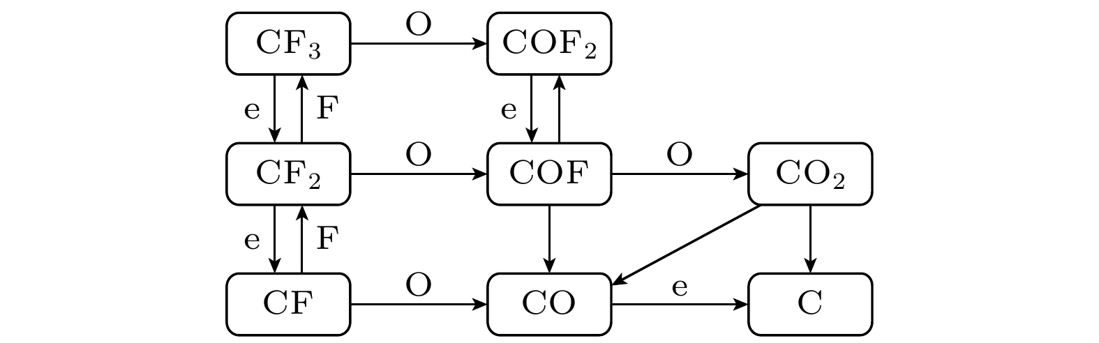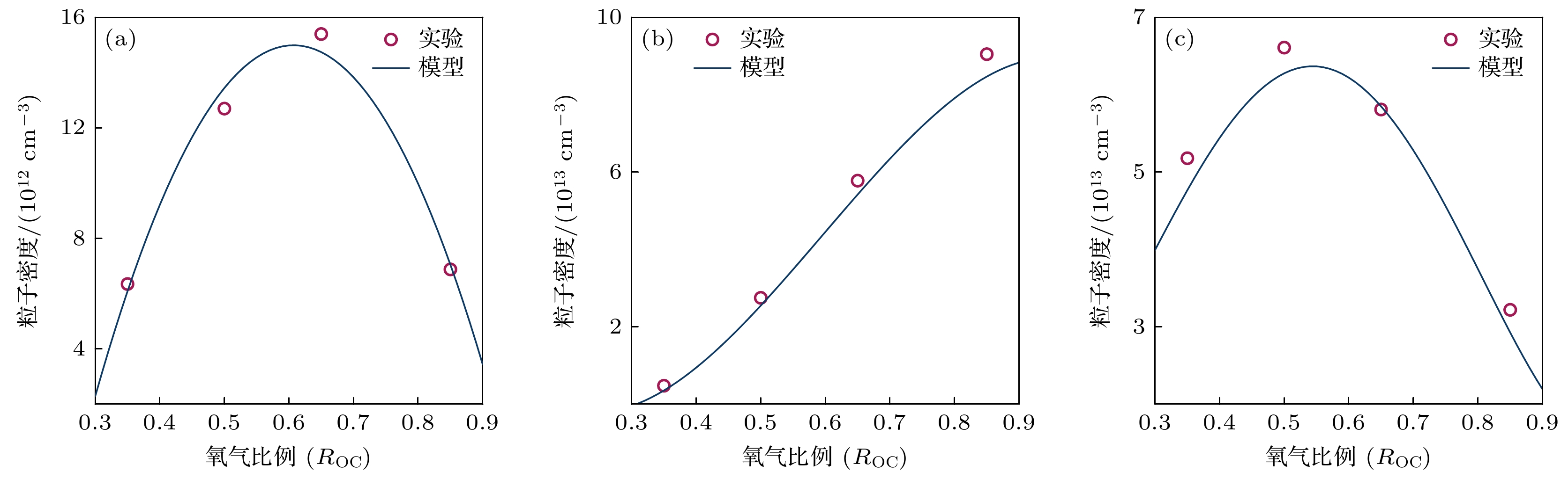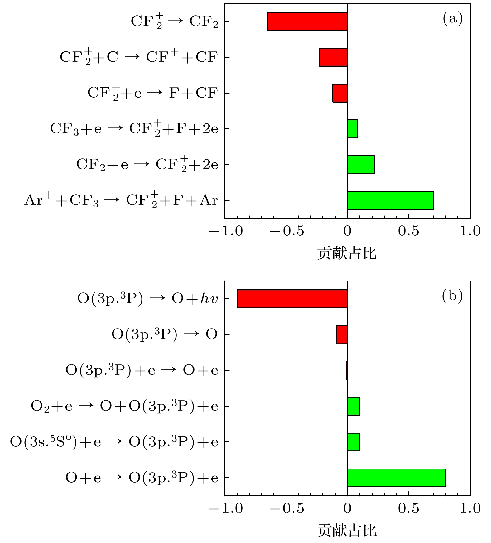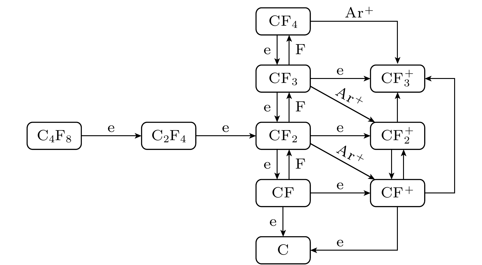 $ {u_{\text{n}}} $: 平均热速度; V, S : 反应腔室体积和表面积E6 $ {\varLambda ^{ - 2}} = {\left( {{{\pi}}/{l}} \right)^2} + {\left( {{{2.405}}/{r}} \right)^2} $ $ \varLambda $: 有效扩散长度; l, r : 反应腔室高度和半径 E7 $ K_{\text{S}}^{+} = 2{u_{\text{B}}}\left( {{{h_{\text{l}}}}}/{l} + {{{h_{\text{r}}}}}/{r}\right) $ $ K_{\text{S}}^{+} $: 离子表面损失系数; $ {u_{\text{B}}} $: 玻姆速度; E8 ${h_{\text{l}}} = 0.86{\left[ {3.0 + {l}/({{2\lambda }})} \right]^{-1/2}}$ ${h_{\text{l}}}$: 轴向边界-中心离子密度比; $\lambda $: 平均自由程 E9 $ h_{\text{r}}=0.80\left(4.0 + {r}/{\lambda}\right)^{-1/2} $ ${h_{\text{r}}}$: 径向边界-中心离子密度比 类别 物种 离子 $ \mathrm{CF}_3^+ $, ${\mathrm{CF}}_2^+ $, CF+, Ar+ 自由基 CF3, CF2, CF, COF, F, C, O 中性产物 C2F4, CF4, F2, COF2, CO, CO2 原料气体 C4F8, O2, Ar 类别 物种 Ar* Ar(1s5)-Ar(1s2), Ar(2p10)-Ar(2p1) O* O(2p.1D), O(2p.1S), O(3s.3So), O(3s.5So), O(3p.3P), O(3p.5P), O(3p.3Do), O(3p.5Do) F* F(3s.2P), F(3s.4P), F(3s.2D), F(3p.2So), F(3p.4So), F(3p.2Po), F(3p.4Po), F(3p.2Do), F(3p.4Do) CF* CF(a4Σ–), CF(A2Σ), CF(b4Π), CF(B2Δ), CF(C2Σ–) ${\mathrm{CF}}^*_2 $ CF2(A1B1), CF2(X1A2), CF2(X3A2), CF2(X3B1), CF2(X3B2) CO* CO(a3Π), CO(A1Π), CO(b3Σ), CO(B1Σ) 反应编号 反应式 速率系数/(cm3·s–1) 参考文献 a b c 电子碰撞反应 R1 e + C4F8 → 2C2F4 + e 9.58 × 10–8 0.042 8.572 [12] R2 e + C2F4 → 2CF2 + e 1.32 × 10–8 0.412 6.329 [12] R3 e + CF4 → CF3 + F + e 2.10 × 10–9 0.936 12.004 [35] R4 e + CF3 → CF2 + F + e 7.94 × 10–8 –0.452 12.100 [12] R5 e + CF2 → CF + F + e 1.16 × 10–8 –0.380 –14.350 [12] R6 e + CF → C + F + e 4.51 × 10–8 –0.110 8.941 [12] R7 e + F2 → 2F + e 1.08 × 10–8 –0.296 4.464 [12] R8 e + COF2 → COF + F + e 3.20 × 10–9 0.013 10.300 [36] R9 e + CO2 → CO + O + e 2.90 × 10–9 0.302 12.100 [37] R10 e + CO → C + O + e 1.54 × 10–8 0.270 14.600 [38] R11 e + O2 → 2O + e 1.71 × 10–8 –1.270 7.310 [39] R12 e + CF4 → ${\mathrm{CF}}_3^+ $ + F + 2e 2.29 × 10–8 0.680 18.304 [35] R13 e + CF3 → ${\mathrm{CF}}_2^+ $ + F + 2e 7.02 × 10–9 0.430 16.280 [12] R14 e + CF2 → CF+ + F + 2e 5.43 × 10–9 0.561 14.290 [12] R15 e + ${\mathrm{CF}}_3^+ $ → CF2 + F 6.54 × 10–8 –0.500 0.025 [13] R16 e + ${\mathrm{CF}}_2^+ $ → CF + F 6.54 × 10–8 –0.500 0.025 [13] R17 e + CF+ → C + F 6.54 × 10–8 –0.500 0.025 [13] R18 e + CF3 → ${\mathrm{CF}}_3^+ $ + 2e 1.36 × 10–9 0.796 9.057 [12] R19 e + CF2 → ${\mathrm{CF}}_2^+ $ + 2e 1.10 × 10–8 0.393 11.370 [12] R20 e + CF → CF+ + 2e 5.48 × 10–9 0.556 9.723 [12] R21 e + Ar → Ar+ + 2e 7.35 × 10–8 0.208 19.100 [40] 电荷交换反应 R22 $ {\mathrm{CF}}_2^+$ + CF → ${\mathrm{CF}}_3^+ $ + C 2.06 × 10–9 0 0 [13] R23 ${\mathrm{CF}}_2^+ $ + C → CF+ + CF 1.04 × 10–9 0 0 [13] R24 CF+ + CF3 → ${\mathrm{CF}}_3^+ $ + CF 1.71 × 10–9 0 0 [13] R25 CF+ + CF2 → ${\mathrm{CF}}_2^+ $ + CF 1.00 × 10–9 0 0 [13] R26 Ar+ + CF4 → ${\mathrm{CF}}_3^+ $ + F + Ar 4.80 × 10–10 0 0 [13] R27 Ar+ + CF3 → ${\mathrm{CF}}_2^+ $ + F + Ar 5.00 × 10–10 0 0 [13] R28 Ar+ + CF2 → CF+ + F + Ar 5.00 × 10–10 0 0 [13] 氧化反应 R29 CF3 + O → COF2 + F 3.30 × 10–11 0 0 [13] R30 CF2 + O → COF + F 3.10 × 10–11 0 0 [13] R31 CF + O → CO + F 6.60 × 10–11 0 0 [13] R32 COF + O → CO2 + F 9.30 × 10–11 0 0 [13] R33 COF + COF → COF2 + CO 1.00 × 10–11 0 0 [13] R34 C + CO2 → 2CO 1.00 × 10–15 0 0 [41] R35 COF + CF3 → COF2 + CF2 1.00 × 10–11 0 0 [13] R36 COF + CF2 → COF2 + CF 3.00 × 10–13 0 0 [13] R37 COF + CF3 → CO + CF4 1.00 × 10–11 0 0 [13] R38 COF + CF2 → CO + CF3 3.00 × 10–13 0 0 [13] 重组反应 R39 F + CF3 → CF4 2.00 × 10–11 0 0 [13] R40 F + CF2 → CF3 1.80 × 10–11 0 0 [13] R41 F + CF → CF2 9.96 × 10–11 0 0 [13] R42 F2 + CF3 → CF4 + F 1.90 × 10–14 0 0 [13] R43 F2 + CF2 → CF3 + F 8.30 × 10–14 0 0 [13] 反应编号 反应式 速率系数 原子扩散 R44 O → $\dfrac{1}{2} $O2 4.20 × 103 s–1 R45 F → $\dfrac{1}{2} $F2 3.2 × 102 s–1 离子扩散 R46 ${\mathrm{CF}}_3^+ $ → CF3 6.73 × 103 s–1 R47 ${\mathrm{CF}}_2^+ $ → CF2 7.91 × 103 s–1 R48 CF+ → CF 1.00 × 104 s–1 R49 Ar+ → Ar 8.85 × 103 s–1 等效表面反应 R50 C2F4 + C2F4 → C4F8 1.00 × 10–11 cm3/s R51 CF2 + CF2 → C2F4 1.00 × 10–11 cm3/s R52 C + F → CF 1.00 × 10–11 cm3/s 参数 Kimura和Noto Lee等[56] ICP腔室尺寸 半径/mm 80 80 高度/mm 80 130 放电工况 气压/mTorr 30 10 功率/W 140 700 气流/sccm 40 40 等离子参数 电子温度/eV 2.93—3.05 3.60—4.25 电子密度/cm–3 5.48 × 1010—