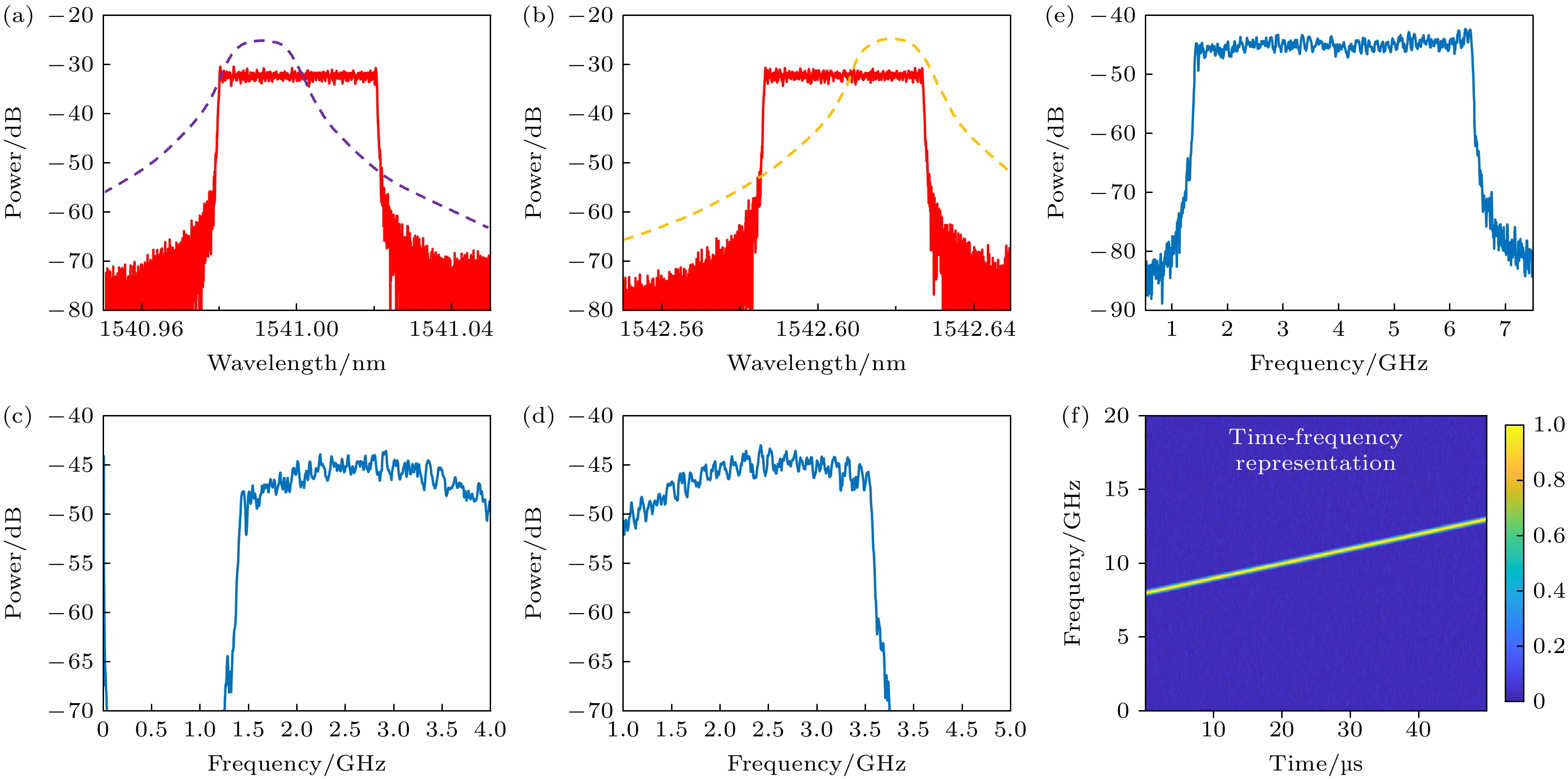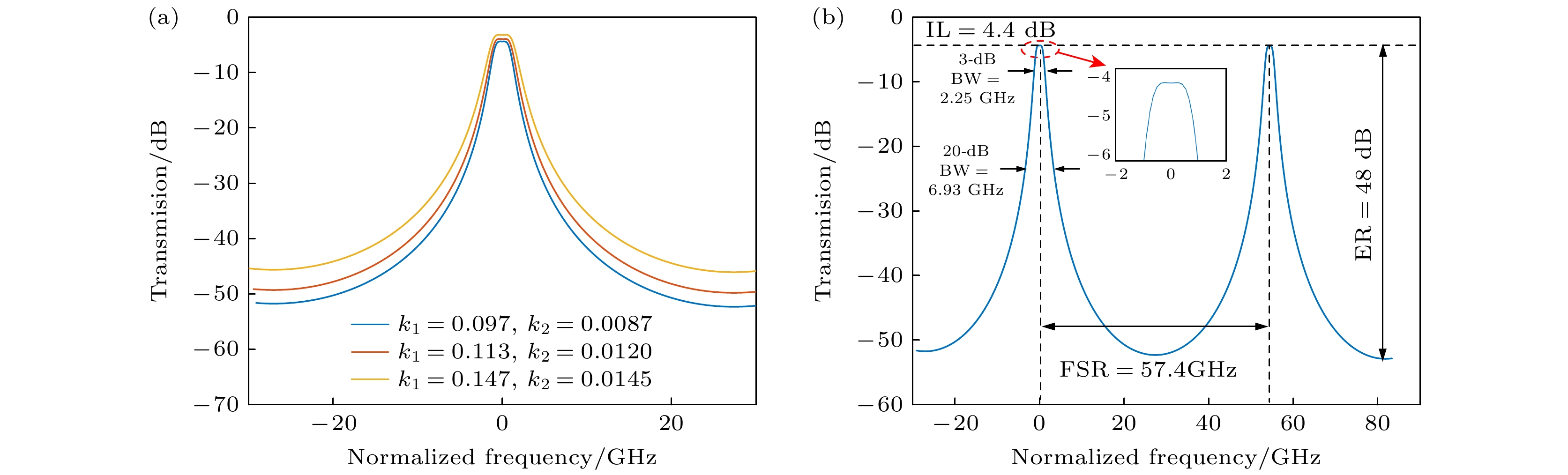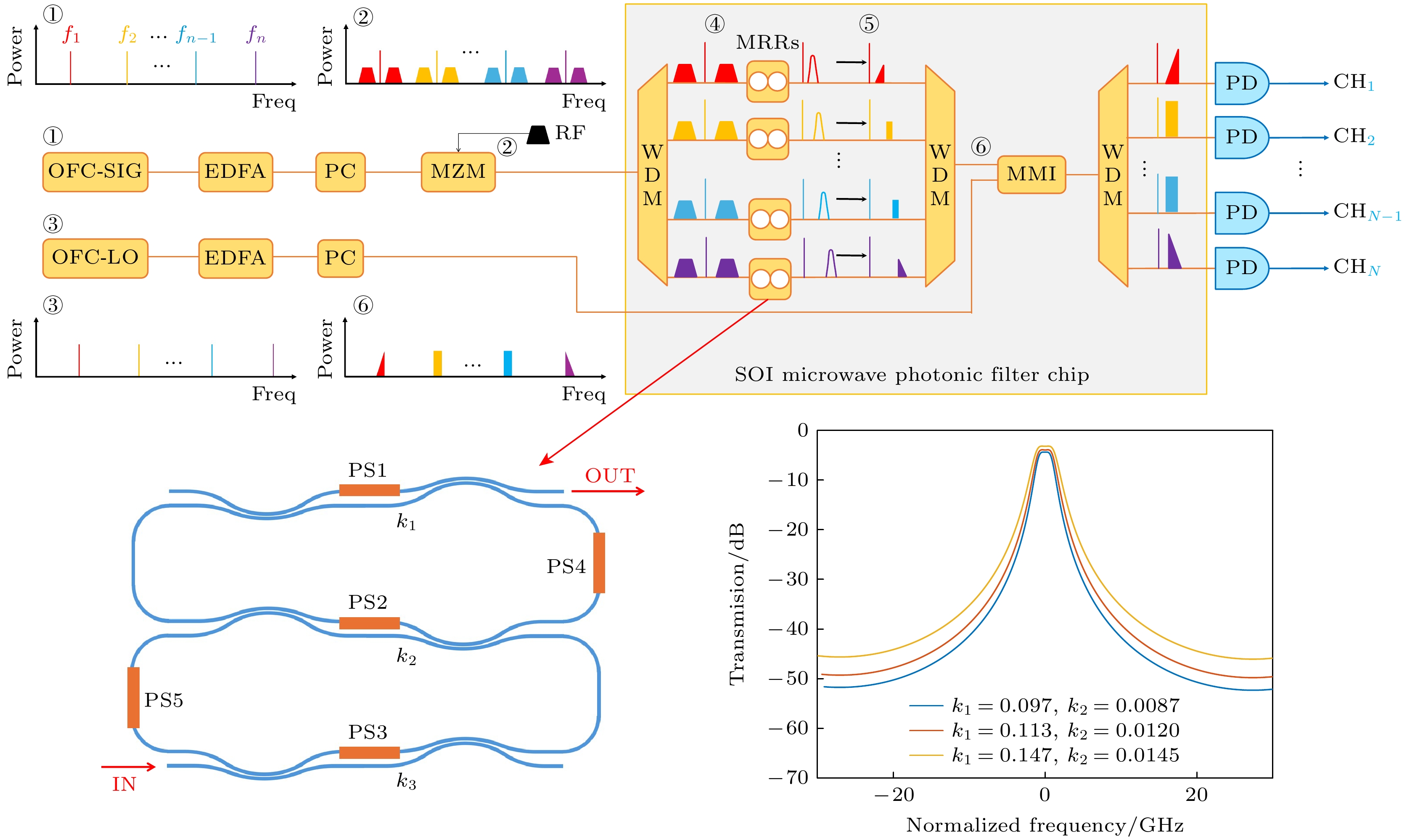 To meet the growing demand for high-frequency broadband signal processing in complex electromagnetic environments and to overcome the limitations of traditional electronic systems such as restricted bandwidth, limited response speed, and low integration density, this paper presents a reconfigurable microwave photonic channelized receiver chip implemented on a silicon photonic platform. The proposed architecture adopts a two-stage optical filtering strategy that circumvents the typical strict wavelength alignment requirements in traditional designs, thereby greatly alleviating the challenges of system integration. In the first stage, the cascaded Mach-Zehnder interferometer (MZI)-based wavelength division multiplexers (WDMs) are used to perform Gaussian-shaped filtering of the input optical spectrum with a channel spacing of approximately 200 GHz. The second stage combines an array of coupled resonator optical waveguide (CROW) filters functioning as finely tunable bandpass elements. These CROW filters utilize curved waveguide directional couplers, which are specifically designed to address the issues found in traditional multimode interference (MMI) couplers such as high insertion loss—and in straight directional couplers, which encounter significant coupling dispersion. The optimized curved coupler exhibits an insertion loss below 0.03 dB and a coupling ratio variation of less than 10% across the 1500–1600 nm wavelength band. Filter bandwidth reconfigurability is achieved via thermo-optic tuning of the balanced MZI embedded within each CROW filter, enabling dynamic adjustment of the coupling coefficients. Each filter exhibits a continuously adjustable 3 dB bandwidth ranging from 2.25 GHz to 3.12 GHz, with an excellent 20 dB/3 dB shape factor of 3.08. This performance indicates significantly improved roll-off characteristics compared with the performance of traditional filter designs, leading to enhanced suppression of image frequency components and improved signal separation fidelity.A complete microwave photon channelized receiving link is constructed using an integrated WDM-CROW filter bank. System-level simulations confirm that the architecture provides excellent broadband adaptability, supporting the channelization of radio frequency (RF) signals in two operational bands: 8–28 GHz and 8–36 GHz. The system efficiently decomposes the input wideband RF signal into eight independent intermediate frequency (IF) sub-bands. Within each sub-band, an image rejection ratio (IRR) exceeding 22 dB is maintained. The corresponding IF ranges are 1.4–3.6 GHz when configured for 8–28 GHz RF input, and 2–5 GHz for 8–36 GHz input, covering critical communication and detection bands from X-band to K-band and satisfying the requirements of multi-scenario signal processing. Furthermore, we simulate the reception and reconstruction of a 5 GHz bandwidth linear frequency-modulated (LFM) signal, successfully verifying the chip’s capability in handling wideband waveforms. These results underscore the feasibility of the proposed chip as a high-performance solution for advanced applications such as radar detection and broadband electronic warfare systems, offering a novel, integrated photonic alternative to traditional channelized reception architectures.