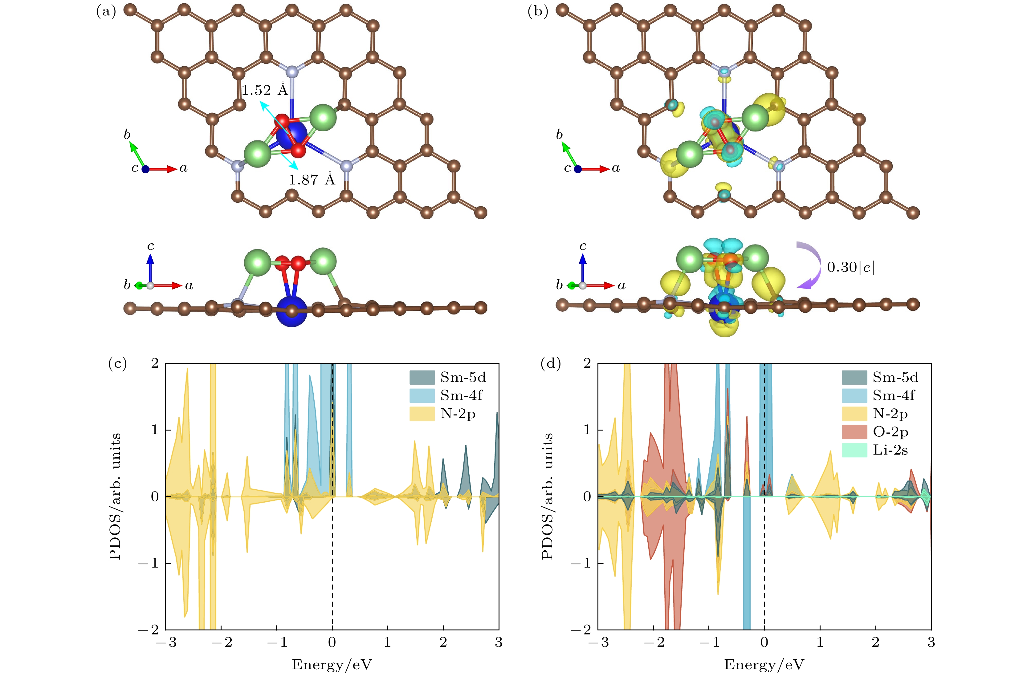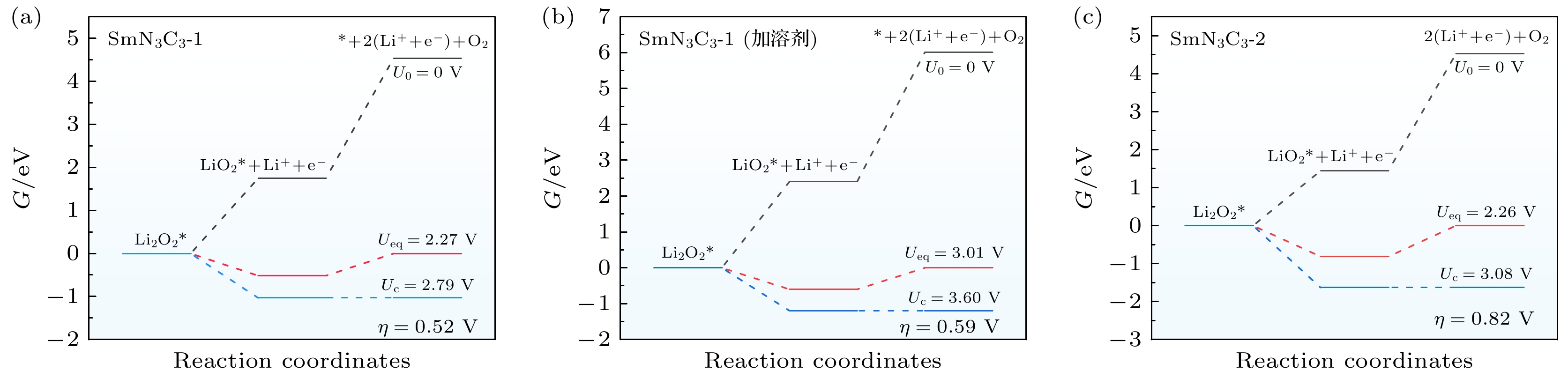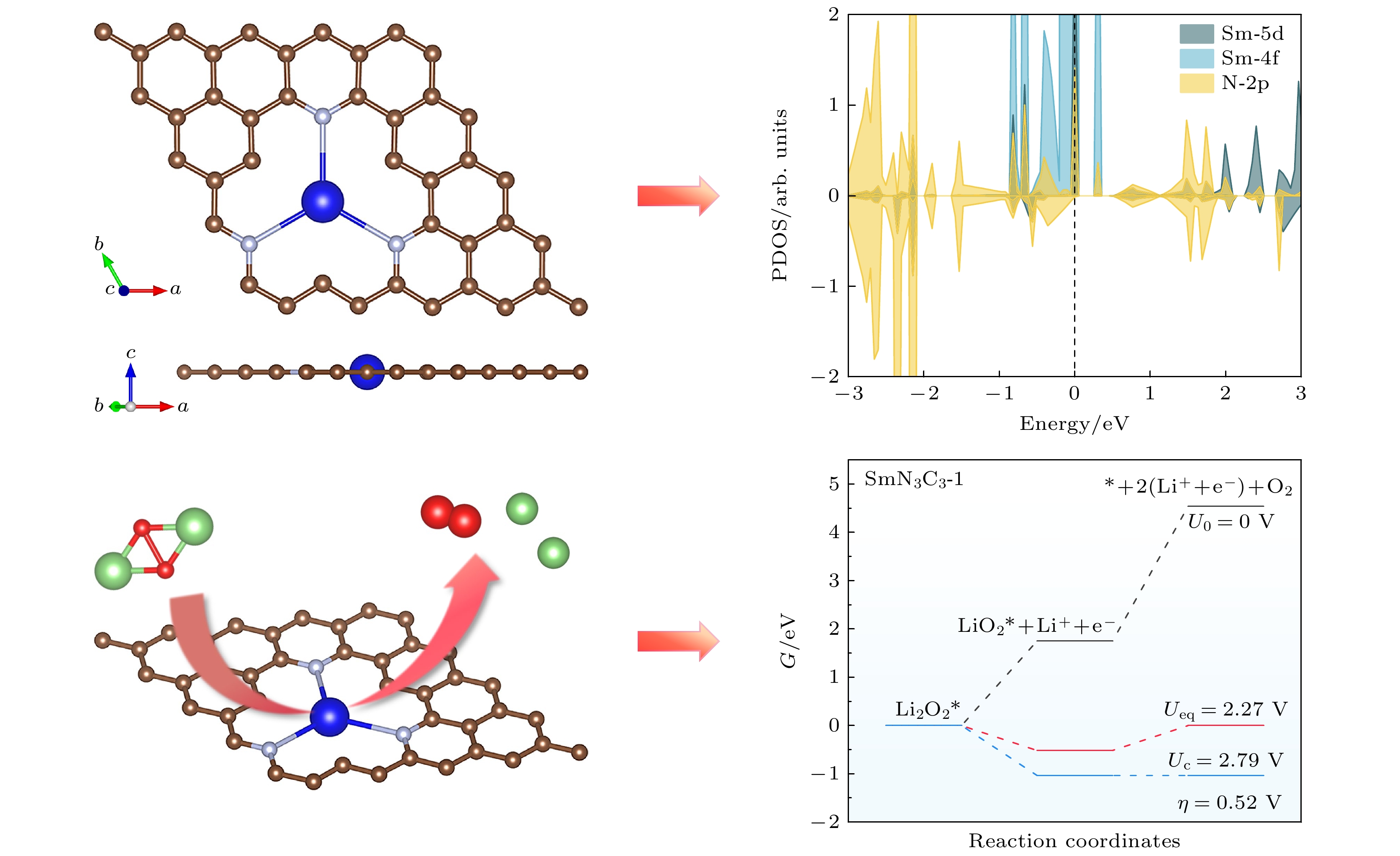 锂-氧电池虽有超高的理论能量密度, 但实际应用仍面临氧化反应动力学缓慢、充电过电位高等严峻问题. 大多数应用于锂-氧电池的单原子催化剂主要是基于过渡金属不饱和配位的d轨道, 而稀土元素Sm有丰富的4f轨道电子. 最近研究表明Sm单原子催化剂在锂-硫电池中能提升多硫化物的转化, 并在全电池实验中实现超稳定的循环性能. 因此, 本研究设计并优化了17种Sm单原子催化剂SmNxCy (x + y = 4, 6), 通过稳定性和催化活性筛选出SmN3C3-1催化剂应用于锂-氧电池. 通过研究对Li2O2分子的催化氧化, 发现Li2O2分子氧化的速率决定步为第2步, 充电过电位为0.52 V. 机理分析表明SmN3C3-1催化剂的d-f-p轨道杂化消除了对Sm原子4f轨道的屏蔽, 促进了界面电荷转移, 从而增强了对Li2O2分子的催化氧化. 本工作为稀土单原子催化剂在锂-氧电池中的应用提供了新视角.Lithium-oxygen batteries (LOBs) are renowned for their ultrahigh theoretical energy densities. However, their practical applications are significantly limited by sluggish oxidation kinetics and elevated charge overpotentials. Most single-atom catalysts (SACs) utilized in LOBs are predominantly based on transition metals, which feature unsaturated d-orbital coordination. In contrast, the rare-earth element samarium (Sm) possesses a rich array of 4f-orbital electrons. Recent studies have demonstrated that Sm SACs can effectively enhance the conversion of polysulfides in lithium-sulfur batteries (LSBs) and achieve remarkable cycling stability in full-cell experiments. Inspired by the work, we systematically design and optimize 17 configurations of Sm SACs for LOBs by using first-principles calculations, which are denoted as SmNxCy (x + y = 4 or 6). Through comprehensive screening for stability and catalytic activity, we identify the SmN3C3-1 catalyst as an optimal candidate for LOBs. The catalytic mechanism of the SmN3C3-1 SAC over the oxygen evolution reaction of the Li2O2 molecule is investigated. The Gibbs free energy of the two-electron dissociation process indicates that the second step of the reaction is the rate-determining step (RDS). At the equilibrium potential, the charge overpotential is 0.52 V. Furthermore, mechanistic analysis reveals that the d-f-p orbital hybridization in SmN3C3-1 effectivelyreduces the shielding effect on the Sm 4f orbitals, facilitates interfacial charge transfer, and significantly improves the catalytic performance of the Li2O2 oxidation. This study provides novel insights into the potential of rare-earth-based SACs for improving the performance of LOBs.