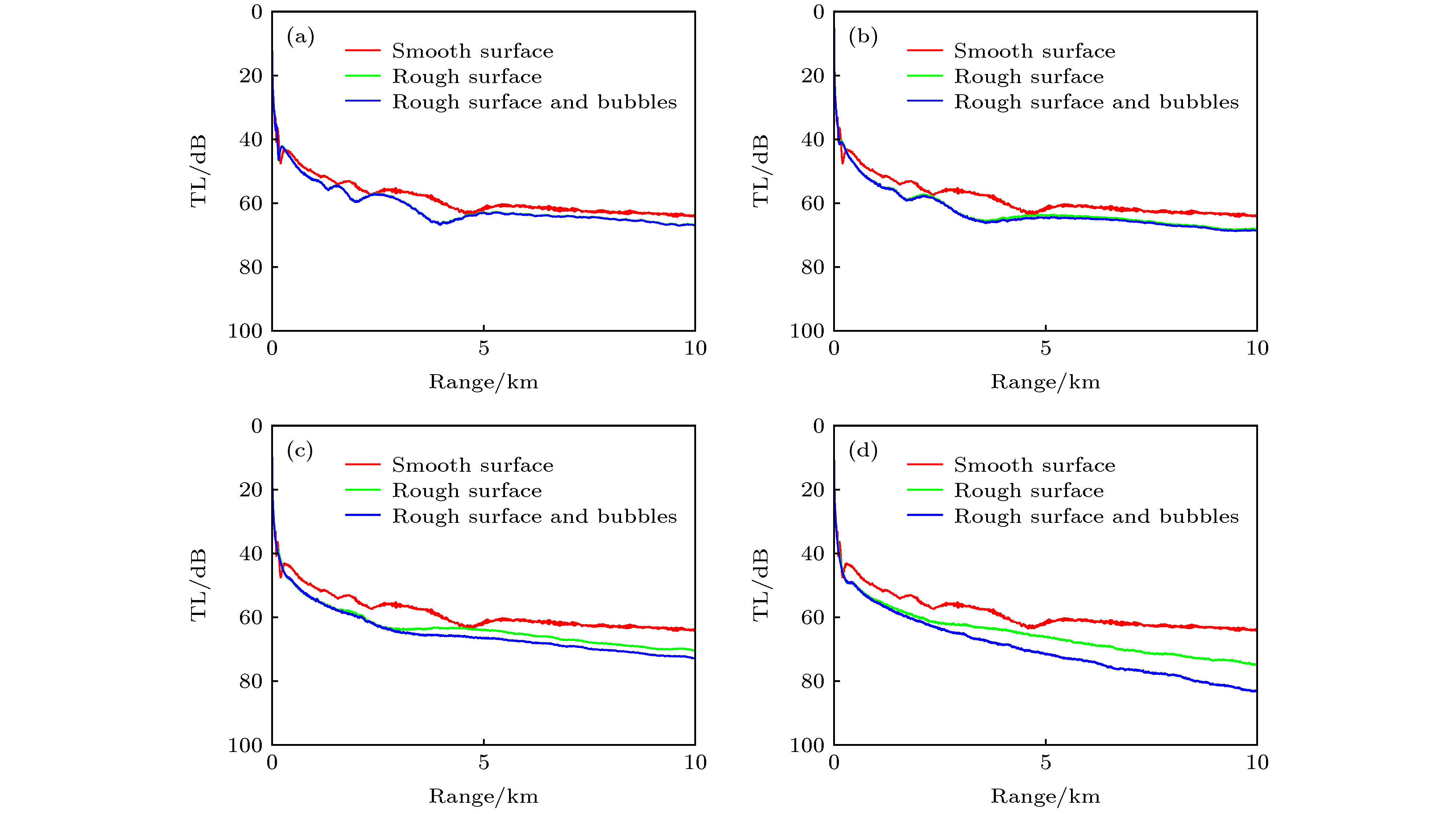 The reflection coefficient of the flat sea surface in the ideal condition to the incident sound wave is –1. The perfect reflection effect does not introduce reflection loss. However, the sea surface is usually rough due to the wind. The wind-generated rough sea surface has not only reflection effect, but also scattering effect on the sound wave. At the same time, the wind-generated bubbles layer also has significant effect on the sound propagation. On the one hand, the bubbles layer can change the sound speed profile and result in the refraction of the incident sound wave. On the other hand, the bubbles layer has scattering effect and absorption effect on the incident sound wave and leads to the sound wave to attenuate. In fact, the rough sea surface and the bubbles layer are two main factors affecting the sound propagation in the windy weather at sea. Many researchers have paid much attention to the effect of the wind-generated rough sea surface on the sound propagation, but few of them have considered the effect of the wind-generated bubbles layer on the sound propagation. Based on the Ramsurf sound propagation model under the rough sea surface, the effects of wind-generated bubbles layer underneath rough sea surface on reflection loss and sound propagation with different wind speeds are analyzed. Based on the Hall-Novarini bubbles population model, the sound speed profile in the bubbles layer is modified and the attenuation coefficient due to scattering and absorption of the bubbles layer is calculated. The simulation results shows that when the wind speed is 10 m/s, the effect of the bubbles layer is significant on reflection loss with the frequencies higher than 2 kHz. In the given underwater acoustic environment, for a frequency of 3 kHz, when the source depth and the receiver depth are both 7 m, the enhancement of the transmission loss due to the bubbles layer is 2.6 dB for a wind speed of 13 m/s, and the enhancement is 8.1 dB for a wind speed of 16 m/s. And when the source depth and the receiver depth are both 18 m, the enhancement of the transmission loss due to the bubbles layer is 2.5 dB for a wind speed of 13 m/s and the enhancement is 4 dB for a wind speed of 16 m/s.