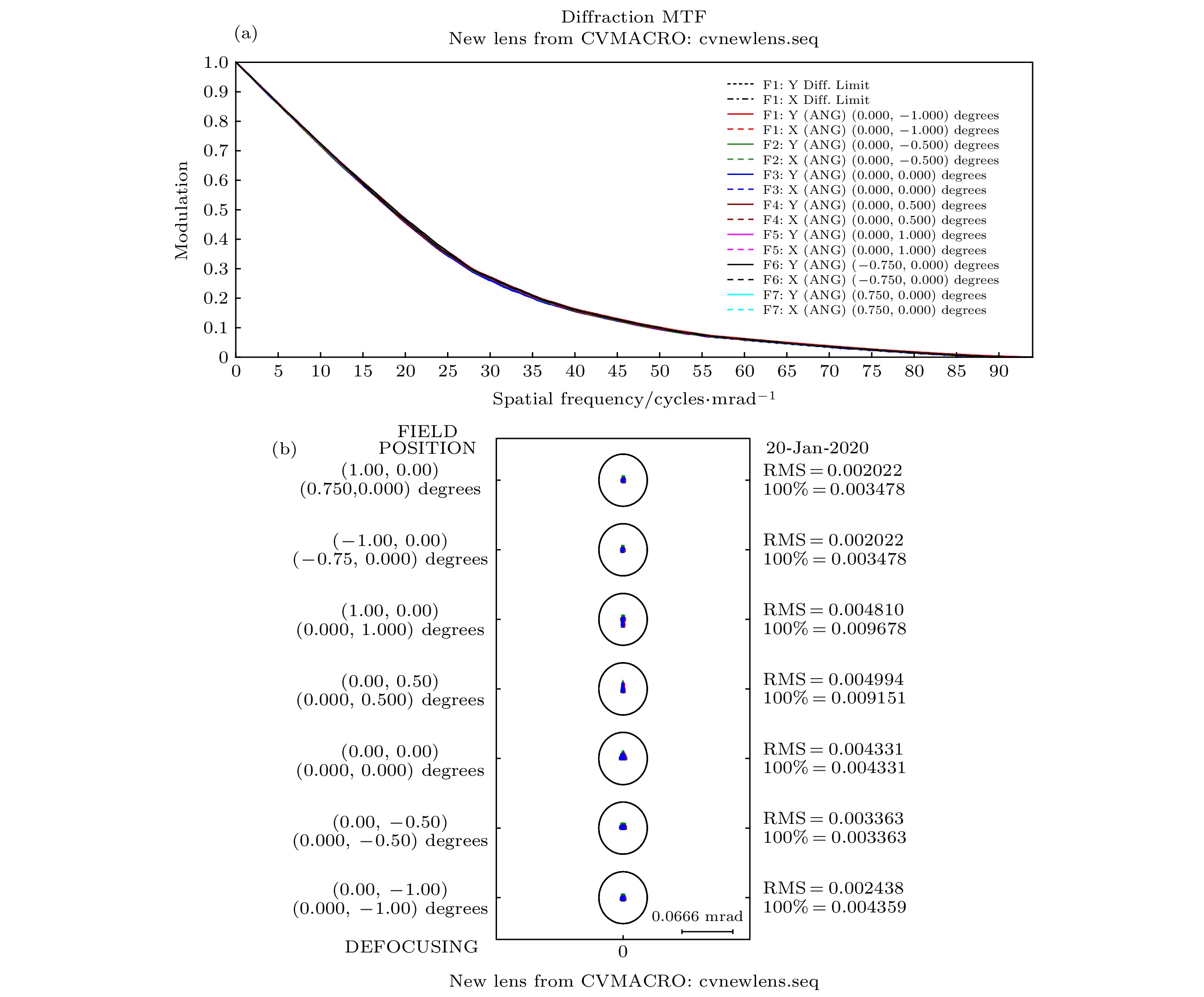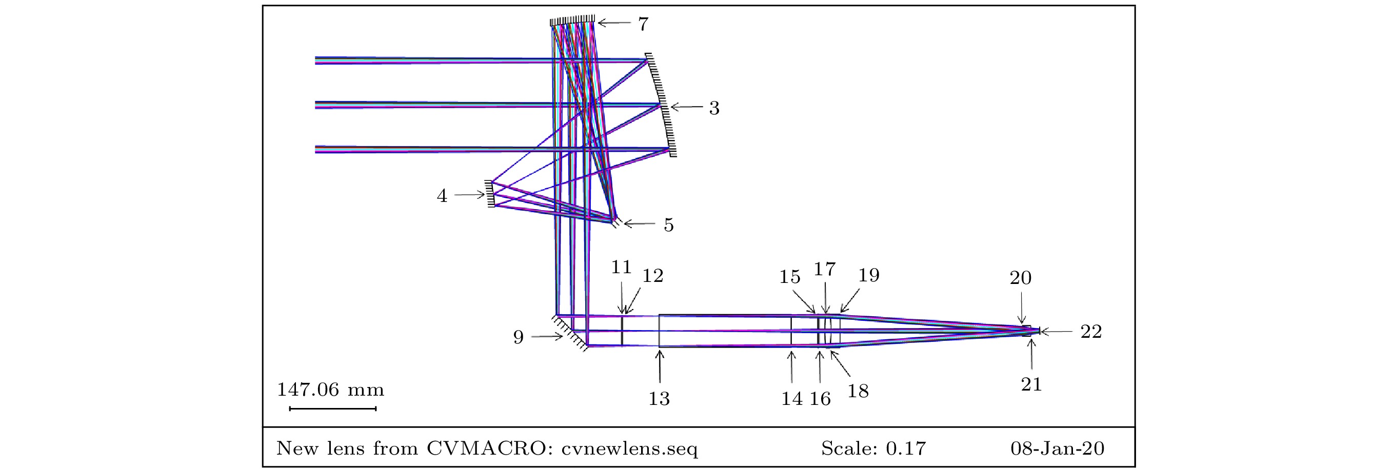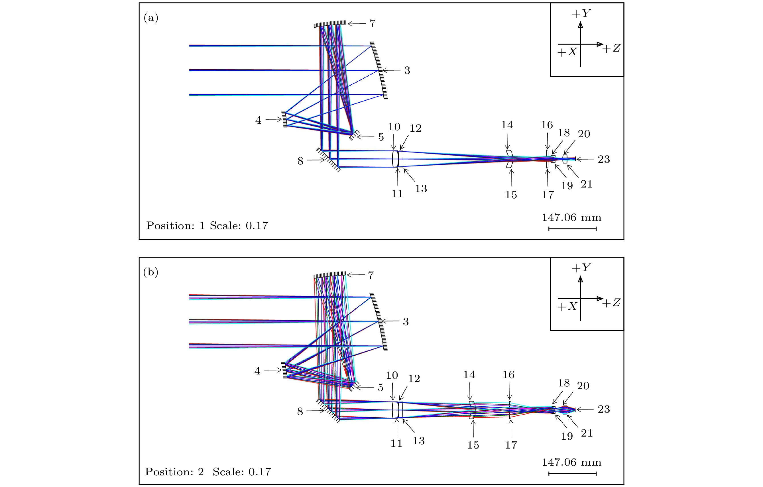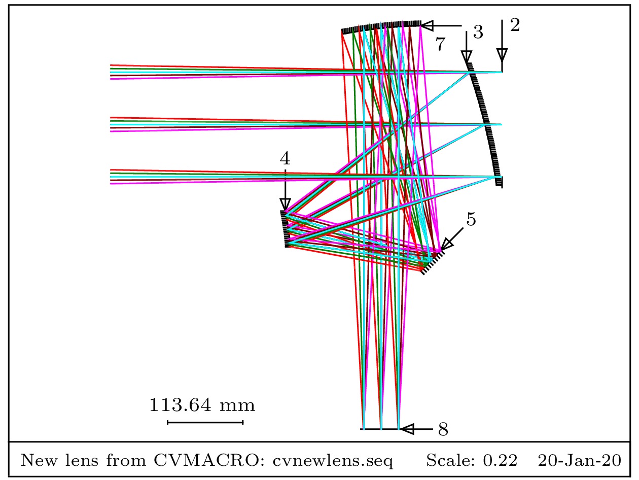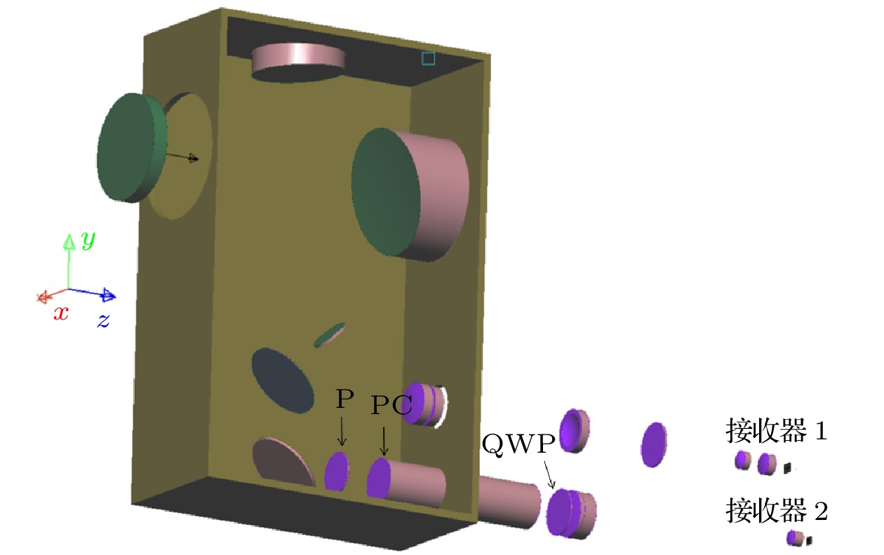 In order to overcome the above shortcomings, in this paper we propose to use polarization imaging lidar and short-wave infrared zoom optical system to construct a dual-mode target detection imaging system by means of common aperture, which can not only reduce the volume of the two systems and solve the coaxial problem of the two systems, but also solve the problems such as the influence of atmospheric conditions (small viewing angle, incident angle and cloud and mist) on imaging quality of polarization modulation imaging lidar and the limitation of low energy of short-wave infrared imaging targets. According to the above ideas, the design and research of polarization imaging lidar and shortwave infrared composite optical system are carried out. The optical design software is used to complete the optical design of the telescope group, shortwave infrared imaging lens group, polarization modulation lens group and the system as a whole. In the telescope group the off-axis three-mirror structure is used to solve the blocking problem of the center of the field of view, and in the shortwave infrared lens group the type of mobile zoom compensation group is used to realize zooming. Analysis of the image quality of the optical system shows that the designed optical system has high imaging quality and its optical design meets the requirements for system design. The optical simulation software is used to simulate the imaging process of the optical system. The results show below. The polarization imaging lidar and shortwave infrared imaging have high quality, the stray light has little influence on the imaging of the system, the target edge imaging is clear, and the independent square targets with a 1-m in diameter can be distinguished. The field of view of the short-wave infrared short-focus mode is 9 times that of the long-focus mode. The shortwave infrared telescopic mode is basically consistent with the field of view of polarization imaging lidar. The received illuminance value of polarization imaging lidar is about 2.4 times that of short-wave infrared long focal length mode. The overall energy distribution of polarization imaging lidar is more balanced, and the imaging effect is better. The method adopted in this paper provides a new idea for studying the polarization modulated imaging lidar. The next step in experimental research is to complete the physical processing, assembly and adjustment, and selection of suitable targets.