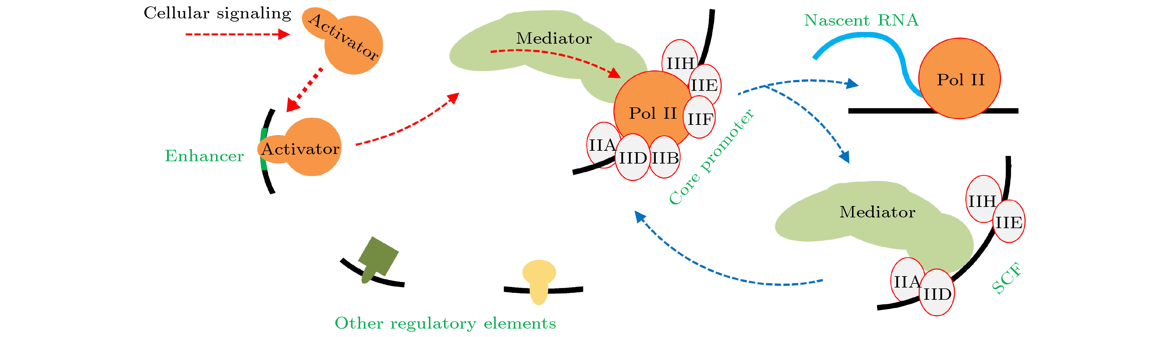 Laws of physics govern all forms of matter movement. However, lives, which are composed of chemical elements which everyone is familiar with, are largely beyond physical description available. This is because the construction of life is not the same as that of general matters, rendering it unknown how physics laws are utilized. In this paper, we present our thinking on the transcriptional apparatus (TA). The TA is a huge molecular machine acting to sense regulatory signals and initiate transcripts at right time and with right rate. The operation of the TA is fundamental to almost all forms of lives. Although great progress has been made in recent years, one often has to face contradictory conclusions from different studies. Additionally, the studies of transcription are divided into several fields, and different fields are increasingly separate and independent. Focusing on eukaryotic transcription, in this review we briefly describe major advances in various fields and present new conflicting view points. Although the structural studies have revealed the main components and architecture of the TA, it is still unclear how the Mediator complex transmits signals from activators to the core transcriptional machinery at the promoter. It is believed that the Mediator functions to recruit RNA polymerase II onto the promoter and promote the entry into transcriptional elongation, which fails to explain how the signal transduction is achieved. On the other hand, the allostery effect of the Mediator allows for signal transmission but is not supported by structural study. It is reported that enhancers, especially supper enhancers, act to recruit activators via forming a so-called liquid drop and phase separation. By contrast, it is suggested that enhancers should cooperate delicately to orchestrate transcription. Results on the kinetics of protein-promoter interaction also contrast with each other, leading to a paradox called “transcriptional clock”. It is then concluded that proteins interact frequently and transiently with promoters and different proteins interact with the promoter at different stages of transcriptional progression. The phenomenon of transcriptional burst questions how the cellular signaling is achieved through such a noisy manner. While the burst frequency or size, or both are potentially modulated by transcriptional activators, more evidence supports the mode of frequency modulation. The technical difficulties in investigating the mechanism of transcription include 1) structural characterization of flexible and/or unstable proteins or protein complexes, 2) measurement of intermolecular kinetics, 3) tracking of single molecule movement, and 4) lack of methodology in theoretical research. We further propose a research strategy based on the ensemble statistical method, and introduce a model for how the TA dynamically operates. The model may act as a benchmark for further investigations. The operating mechanism of the TA should reflect an optimal use of physics laws as a result of long-term biological evolution.
