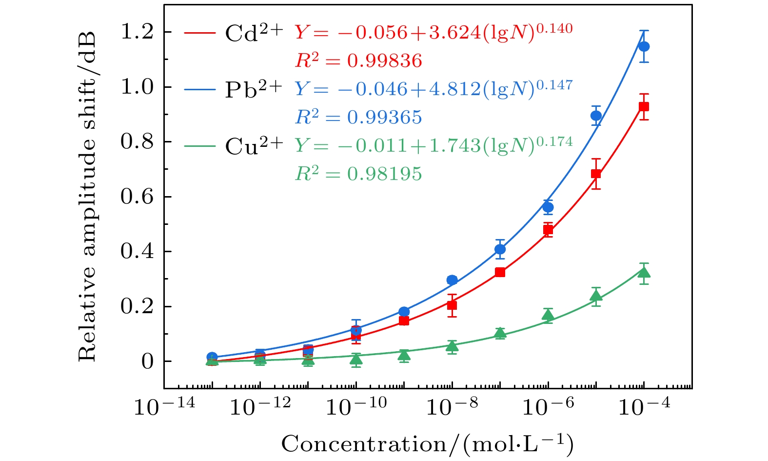 2+ions in water. These heavy metal ions are adsorbed by the GO, and thus causing the effective refractive index to increase. The results show that the adsorption of heavy metal ions makes the interference peaks red-shifted in the transmission spectrum. The lowest detection limit for Pb