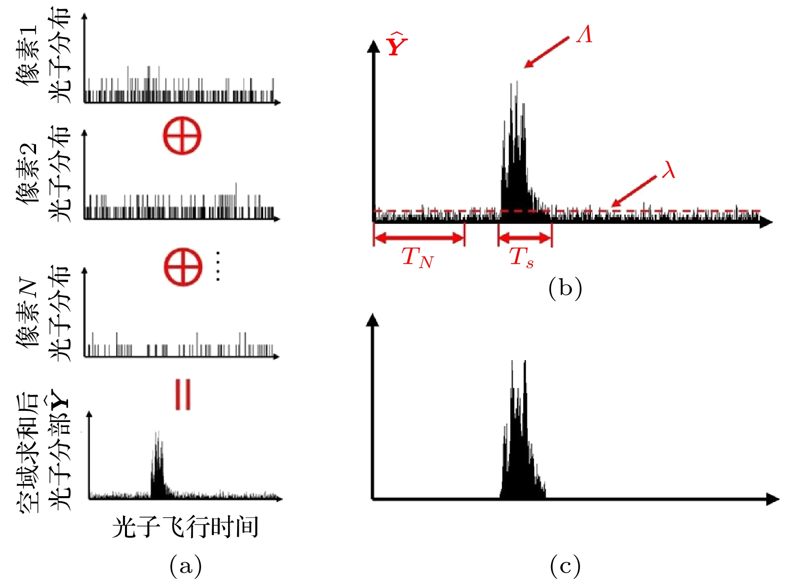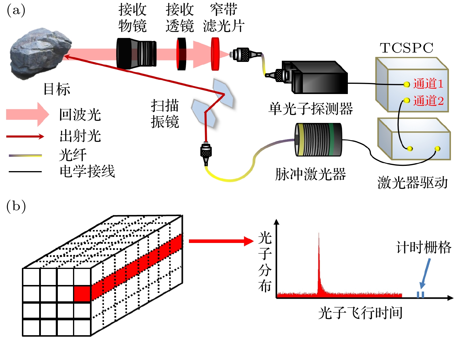 光子计数激光雷达技术具有极高的探测灵敏度与时间分辨率, 是极端条件下高精度目标信息获取的重要手段. 由于该技术通过探测单光子级的回波能量实现对目标信息的三维重建, 因此极易受噪声干扰, 导致成像质量严重降低. 基于高速电子门控的距离选通技术虽然可以有效抑制噪声, 但存在参数设计依靠经验、目标检测区间窄等问题. 本文提出一种在宽目标检测区间条件下的目标信息提取及三维重建方法, 首先通过对三维回波信息的获取机理及其概率模型进行分析, 获取目标信息分布范围并通过算法门控提取有效信息; 再采用高效的图像重建算法进一步提升三维重建的质量, 从而具有比基于纯硬件的去噪方法更强的抑噪能力. 实验结果显示, 在平均像素光子数仅为3.020, 且信号噪声比仅为0.106的极端条件下, 本文提出的目标信息提取方法可将信号噪声比提升19.330倍; 再配合高效的图像重建算法, 距离图像的重建信噪比相比于传统的互相关算法提升了33.520 dB, 大幅提升了强噪声环境下高精度目标信息获取的能力.Single photon LiDAR is considered as one of the most important tools in acquiring target information with high accuracy under extreme imaging conditions, as it offers single photon sensitivity and picosecond timing resolution. However, such technique sense the scene with the photons reflected by the target, thus resulting in severe degradation of image in presence of strong noise. Range gating with high-speed electronics is an effective way to suppress the noise, unfortunately, such technique suffers from manually selecting the parameters and limited gating width. This paper presents a target information extracting and image restoration method under large observation window, which first obtain the depth distribution of the target and extract the information within the range by analyzing the model of signal and noise, then further improve the image quality by adopting advanced image restoration algorithm and henceforth shows better results than those denoising method that purely relying on hardware. In the experiment, photon-per-pixel (PPP) was as low as 3.020 and signal-to-background ratio (SBR) was as low as 0.106, the proposed method is able to improve SBR with a factor of 19.330. Compared to classical algorithm named cross correlation, the reconstruction signal to noise ratio (RSNR) increased 33.520dB by further cooperating with advanced image restoration algorithm, thus improved the ability of sensing accurate target information under extreme cases.