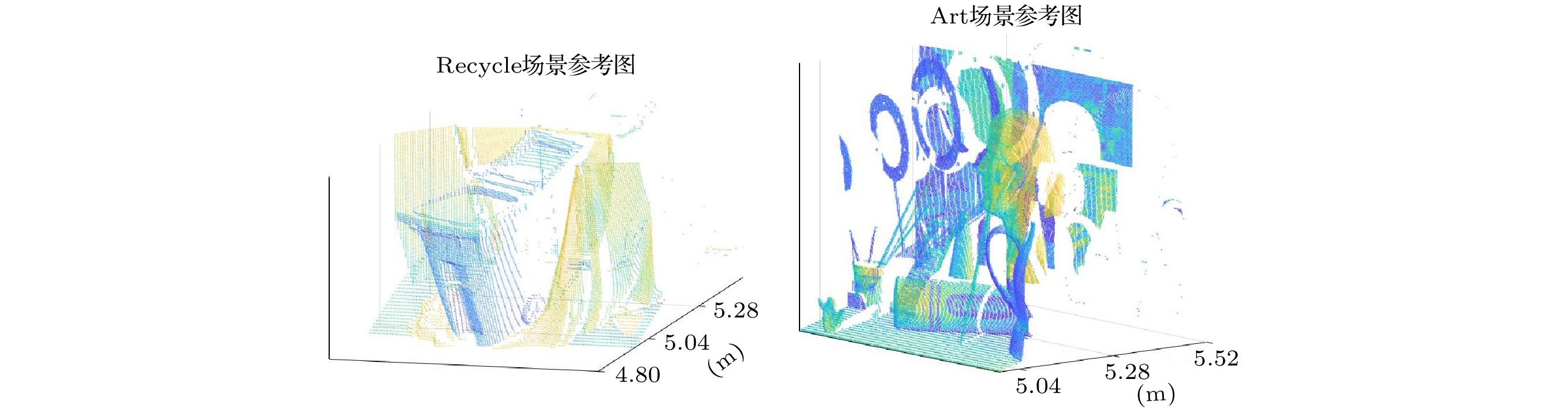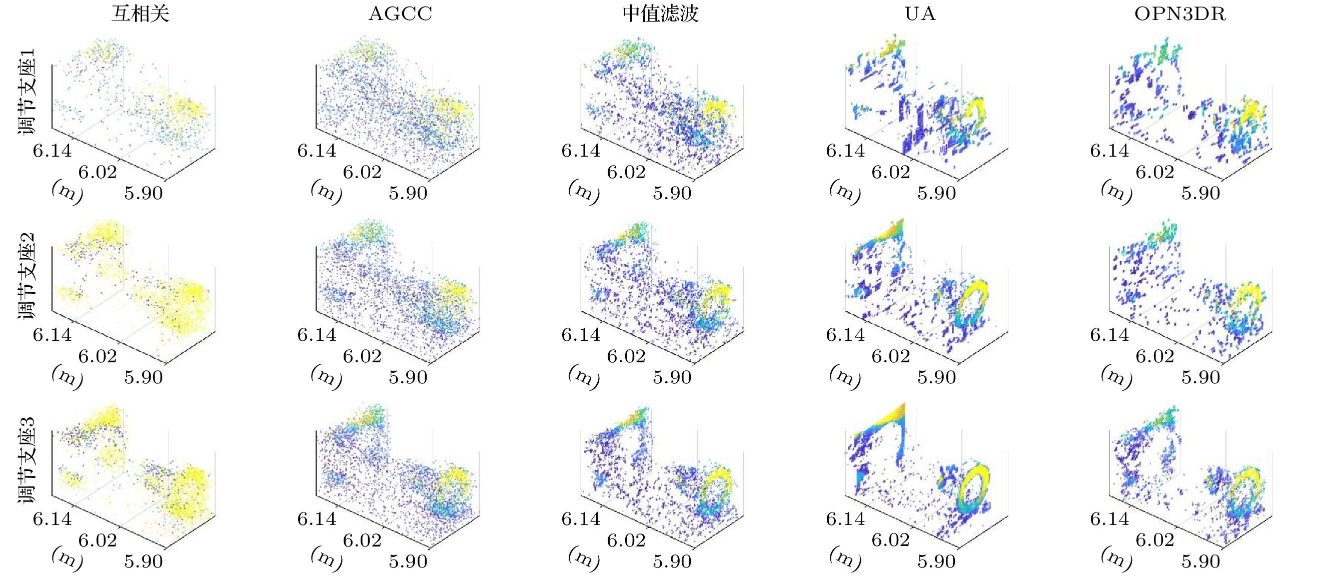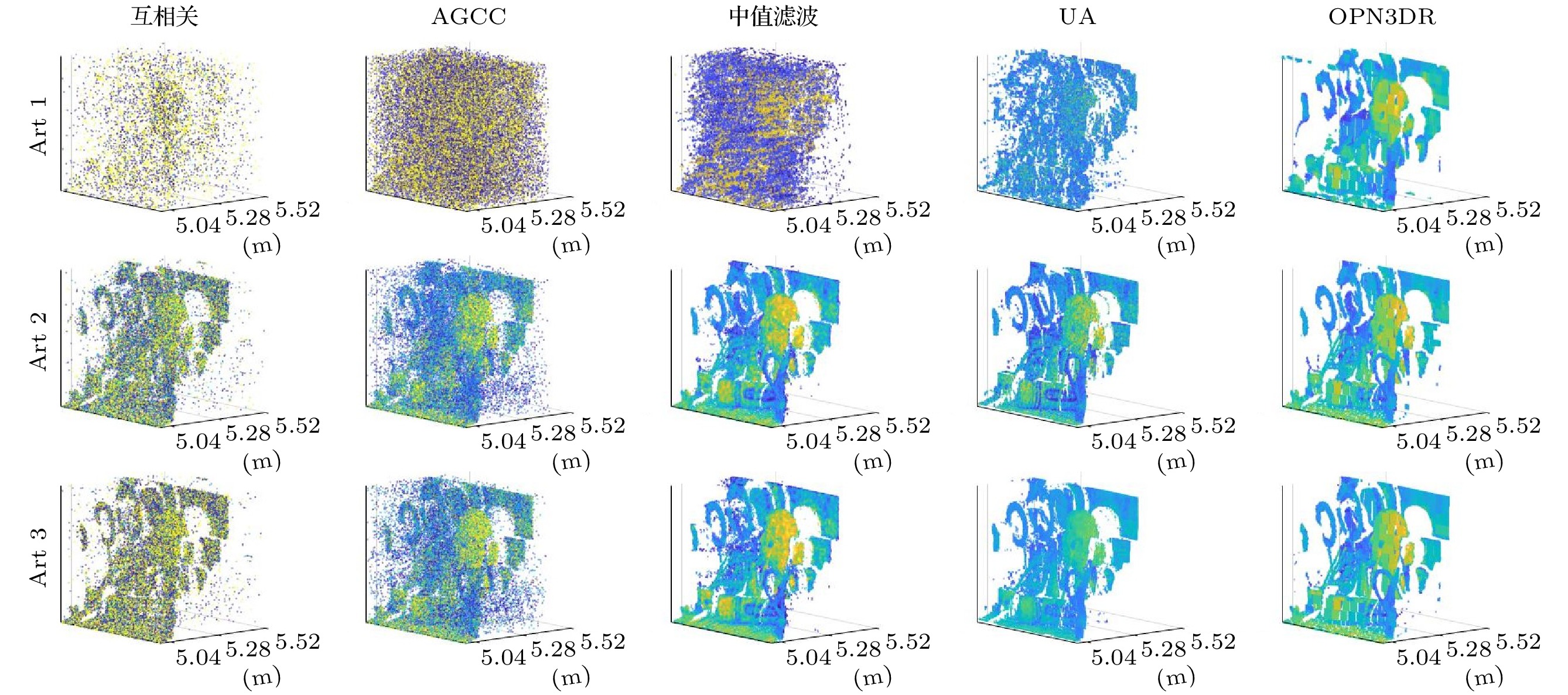 16: $ {\boldsymbol{\zeta}} \leftarrow \{[{\boldsymbol{\zeta}}-\sigma] \cup [{\boldsymbol{\zeta}}+\sigma\} $场景 Recycle Art 调节支座 Recycle1 Recycle2 Recycle3 Art1 Art2 Art3 调节支座1 调节支座2 调节支座3 PPP 0.951 6.226 12.727 0.833 4.664 11.553 3.020 30.044 150.144 SBR 0.581 0.127 0.031 0.013 0.114 0.014 0.106 0.104 0.104 $\textrm{SBR}^{’}$ 6.435 1.431 0.363 0.222 1.931 0.250 2.049 2.050 2.029 NRR ${11.076}$ ${11.268}$ ${11.710}$ ${17.077}$ ${16.939}$ ${17.857}$ ${19.330}$ ${19.712}$ ${19.510}$ 场景 评价对象 Recycle Art 调节支座 Recycle1 Recycle2 Recycle3 Art1 Art2 Art3 调节支座1 调节支座2 调节支座3 互相关 距离图 $-9.743$ $-8.533$ $-8.231$ $-15.597$ $-10.482$ $-10.848$ $-4.932$ $-3.023$ $-1.338$ 反射率图 $-4.101$ $-0.908$ $-3.691$ $-21.453$ $-3.504$ $-8.024$ $4.533$ $4.687$ $4.698$ AGCC 距离图 $11.524$ $17.961$ $17.577$ $12.862$ $19.789$ $19.633$ $22.352$ $24.751$ $26.369$ 反射率图 $0.114$ $6.433$ $6.062$ $-7.806$ $4.175$ $3.457$ $5.324$ $7.504$ $7.731$ 中值滤波 距离图 $13.954$ ${22.304}$ ${21.881}$ $18.552$ $27.340$ $26.903$ $24.389$ $25.909$ $26.788 $ 反射率图 $5.844$ $12.608$ $12.284$ $2.316$ ${10.584}$ $10.261$ $8.383$ $9.500$ $9.571$ UA 距离图 ${20.768}$ $21.318$ $21.321$ $20.519$ $24.761$ $24.764$ ${28.588}$ ${28.741}$ ${29.199}$ 反射率图 $3.304$ ${16.755}$ ${18.760}$ $5.513$ $10.034$ ${11.122}$ ${7.926}$ ${9.677}$ ${9.890}$ OPN3DR 距离图 $20.075$ $21.430$ $21.172$ ${22.767}$ ${27.453}$ ${27.397}$ $25.726$ $26.801$ $28.298$ 反射率图 ${11.093}$ $15.812$ $15.380$ ${8.910}$ $10.448$ $10.255$ $7.915$ $8.979$ $9.004$ 场景 Recycle Art 调节支座 ${\rm{Recycle1}}$ ${\rm{Recycle2}}$ ${\rm{ Recycle3}}$ ${\rm{Art1}}$ ${\rm{ Art2 }}$ ${\rm{Art3}}$ 调节支座1 调节支座2 调节支座3 互相关 0.679 0.690 0.711 2.663 2.693 2.720 0.273 0.260 0.286 AGCC 0.085 0.085 0.085 0.220 0.224 0.218 0.023 0.024 0.024 中值滤波 0.095 0.096 0.096 0.235 0.239 0.234 0.035 0.035 0.036 UA 6.290 7.759 10.787 20.335 13.517 19.832 4.320 5.073 8.711 OPN3DR 1.422 1.344 1.986 5.464 5.518 5.228 0.145 0.228 0.724 场景 评价对象 距离图RSNR 反射率图RSNR 运行