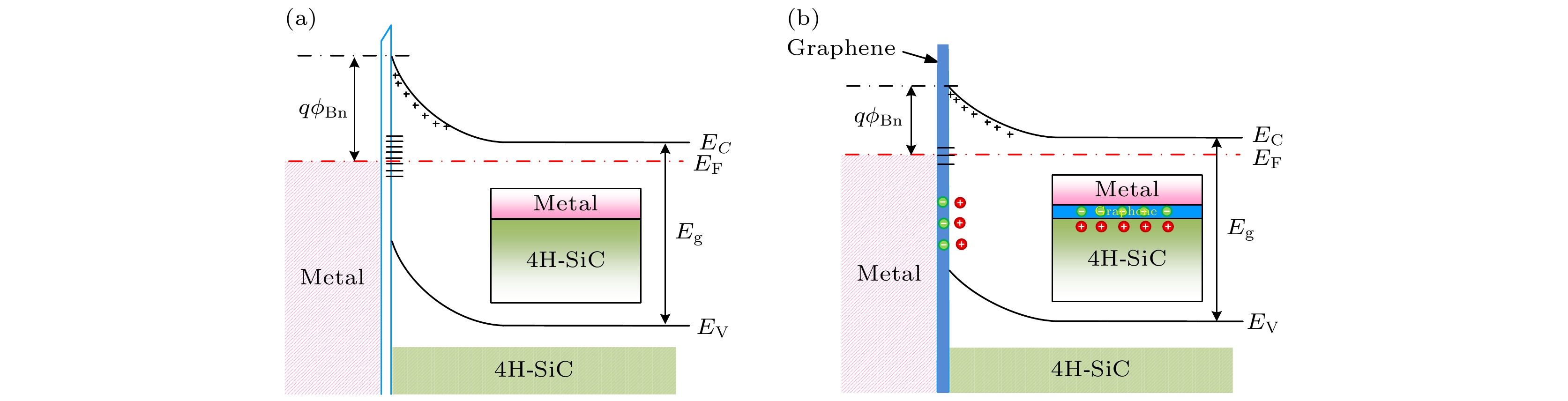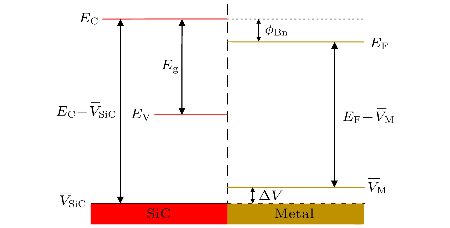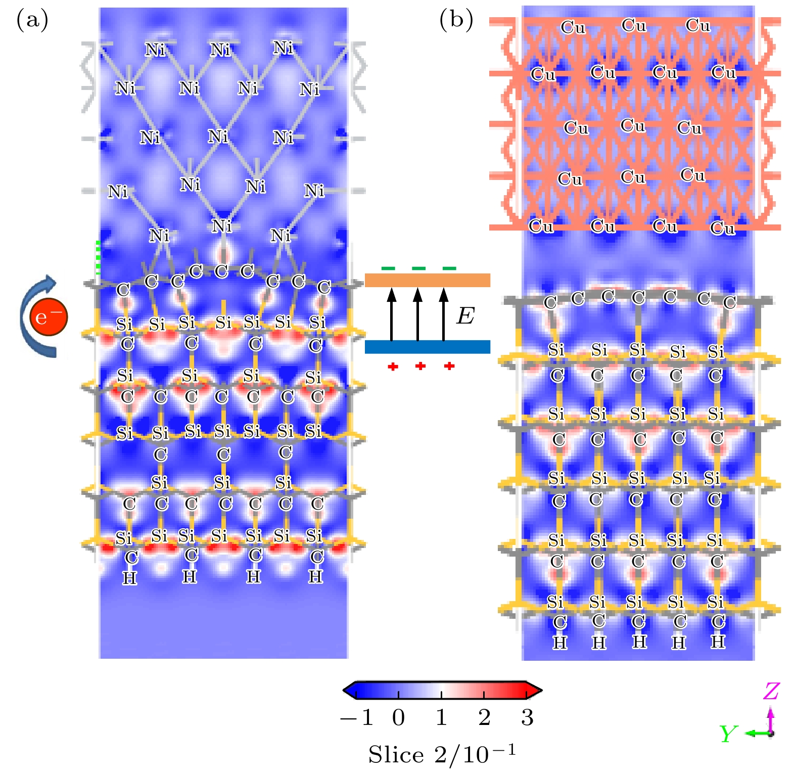 由于SiC禁带宽度大, 在金属/SiC接触界面难以形成较低的势垒, 制备良好的欧姆接触是目前SiC器件研制中的关键技术难题, 因此, 研究如何降低金属/SiC接触界面的肖特基势垒高度(SBH)非常重要. 本文基于密度泛函理论的第一性原理赝势平面波方法, 结合平均静电势和局域态密度计算方法, 研究了石墨烯作为过渡层对不同金属 (Ag, Ti, Cu, Pd, Ni, Pt)/SiC接触的SBH的影响. 计算结果表明, 单层石墨烯可使金属/SiC接触的SBH降低; 当石墨烯为2层时, SBH进一步降低且Ni, Ti接触体系的SBH呈现负值, 说明接触界面形成了良好的欧姆接触; 当石墨烯层数继续增加, SBH不再有明显变化. 通过分析接触界面的差分电荷密度以及局域态密度, SBH降低的机理可能主要是石墨烯C原子饱和了SiC表面的悬挂键并降低了金属诱生能隙态对界面的影响, 并且接触界面的石墨烯及其与金属相互作用形成的混合相具有较低的功函数. 此外, SiC/石墨烯界面形成的电偶极层也可能有助于势垒降低.In the production of SiC electronic devices, one of the main challenges is the fabrication of good Ohmic contacts due to the difficulty in finding the metals with low Schottky barriers of wide band gap SiC. Therefore, reducing the Schottky barrier height (SBH) at the metal/SiC interface is of great importance. In this paper, the effects of graphene intercalation on the SBH in different metals (Ag, Ti, Cu, Pd, Ni, Pt)/4H-SiC interfaces are studied by combining the average electrostatic potential and local density of states calculation methods based on first-principles plane wave pseudopotential density functional theory. The calculation results show that single-layer graphene intercalation can reduce the SBH of metal/4H-SiC contact. When the two layers of graphene are inserted, the SBH are further reduced. Especially, the contact between Ni and Ti exhibits negative SBH values, inferring that good Ohmic contacts are formed. When layers of graphene continue to increase, the SBH no longer changes obviously. By analyzing the differential charge density and the local density of states of the interface, the mechanism of SBH reduction may be that the dangling bonds on the SiC surface are saturated by the graphene C atoms and the influence of the metal-induced energy gap state at the interface is reduced, thereby reducing the interface state density. In addition, graphene and the corresponding new phases at the interface have low work functions. Moreover, an interfacial electric dipole layer may be formed at the SiC/graphene interface which also contributes to barrier reduction.