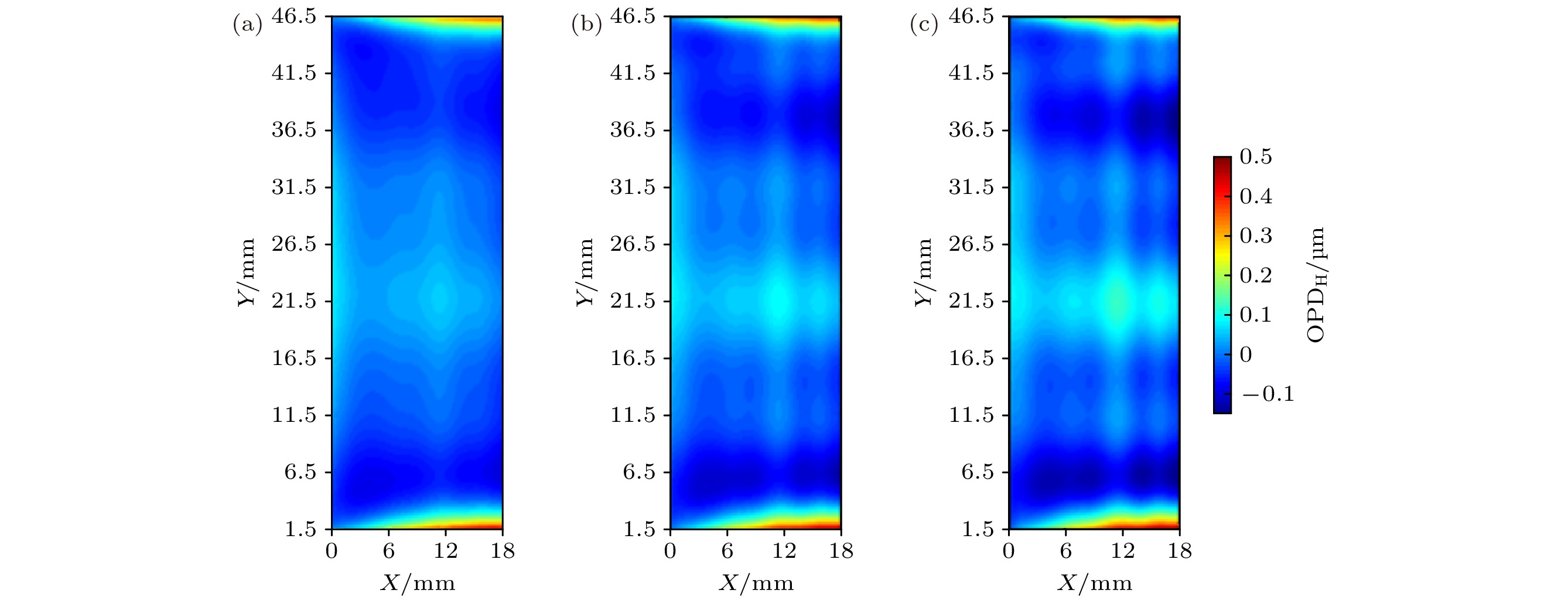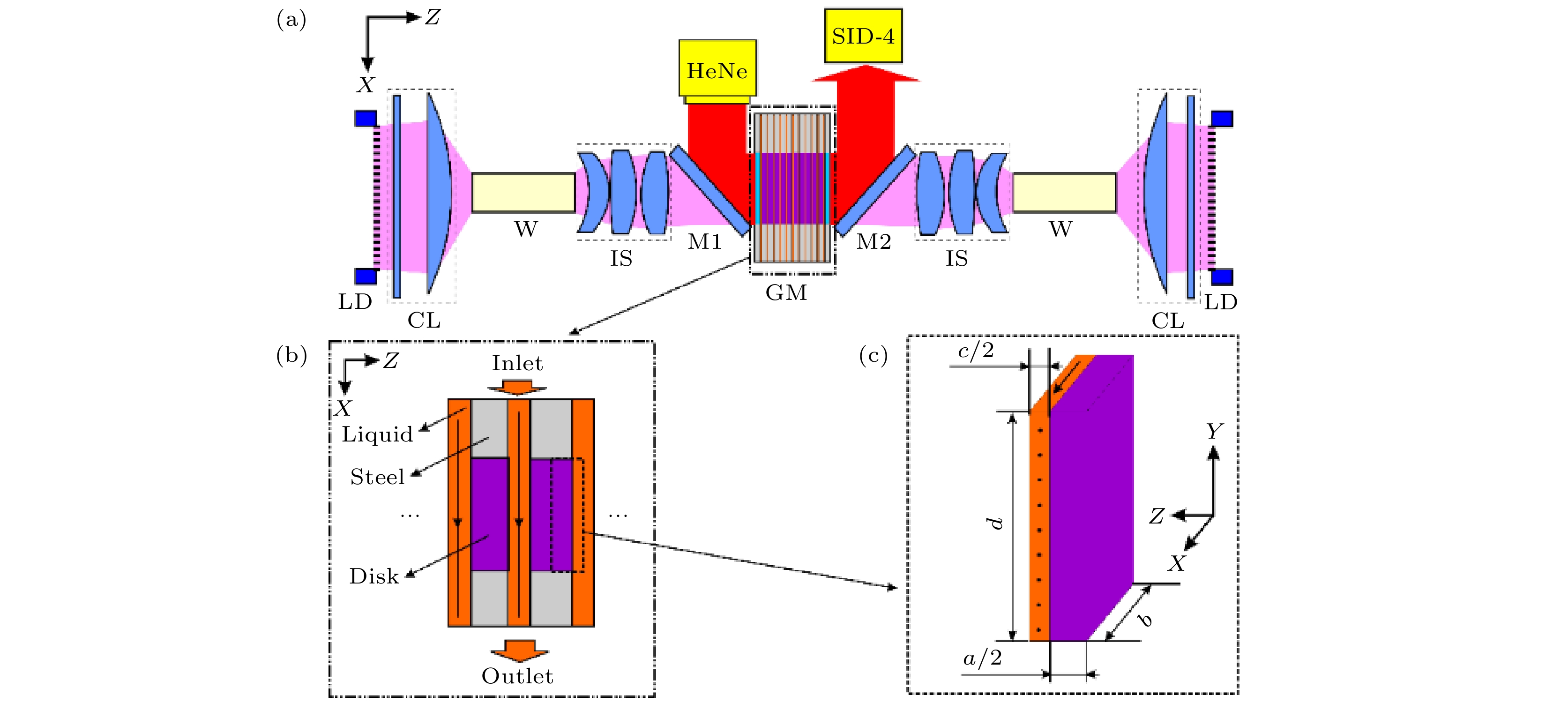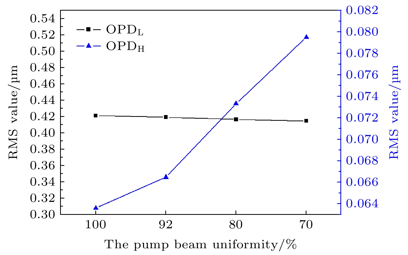 近年来, 直接液体冷却薄片激光器因其体积功率比小, 热管理能力强等优势而成为研究热点. 本文建立了一套直接液体冷却薄片激光器波前畸变的分析方法. 应用该方法研究了. 计算分析了均匀性为92%, 80%和70%, 且总的抽运功率不变时, 激光器高阶像差分布情况. 随着均匀性逐渐减弱, 激光器中高阶像差逐渐增强, 低阶像差量基本保持不变. 实验中, 设计加入波导和未加入波导结构, 构建了均匀性为92%和70%的抽运光分布, 分别测量了两种情况下的波前抖动情况以及波前畸变分布, 抽运功率为5 kW时, 测量获得了整个增益模块的光程差高阶分量(OPD H), 其畸变量均方根(RMS)值为0.66 μm和0.79 μm, 实验结果和理论分析结果基本趋势一致.In recent years, the direct-liquid-cooled thin-disk lasers have become ahot research topic due to their advantages of extremely small volume to output power ratio and strong thermal management ability. A method of analyzing the wavefront aberration of the direct-liquid-cooled thin-disk laser is established in this paper. The influence of pumping light uniformity on the wavefront aberration is investigated by this method. The high order aberration distribution of the laser beam is calculated, when the uniformity is 92%, 80% and 70%, respectively. With the decrease of beam uniformity, the higher order aberrationsincrease gradually, while the low order aberrations remain basically unchanged. Experimentally, the pumping beam distributions respectively with uniformity of 92% and 70% are designed with and without using the waveguide structure. The wavefront jitter and wavefront aberration distribution of the whole gain module are measured in these two cases. The pump power is kept at 5 kW. The higher order of optical path difference (OPD H) values of the whole gain module are measured to be 0.66 μm and 0.79 μm, respectively. The experimental results are in agreement with the theoretical analyses.