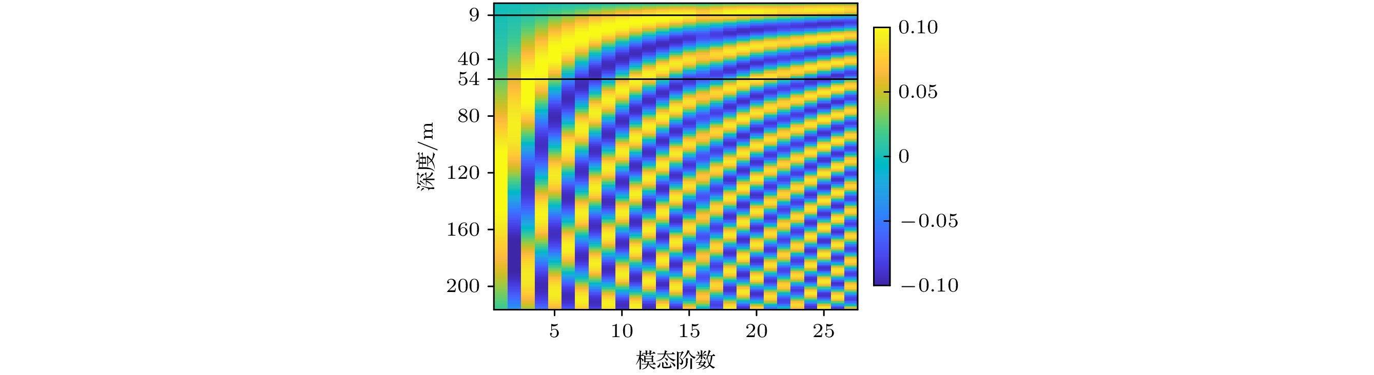 针对浅海负跃层波导中的声源深度判别问题, 通过研究不同深度声源信号到达接收阵的简正波结构特征, 提出了一种利用互相关输出峰值迁移曲线的声源深度判别方法. 该方法利用浅海负跃层中主导简正波类型由声源深度决定这一先验信息, 根据峰值迁移曲线中互相关时延在0时刻的位置进行声源深度判别. 首先, 利用垂直线列阵波束输出与单阵元接收信号做互相关处理, 得到互相关时延—俯仰角输出二维图. 然后, 在图中提取不同时延上角度维峰值, 根据时延小于等于0、大于0的情况对所提取的峰值点进行分段线性拟合, 得到互相关输出峰值迁移曲线. 最后, 以曲线位于互相关时延为0时的位置进行声源深度判断. 理论分析表明, 曲线受波导中声速随深度变化的影响较小, 互相关时延0时刻位置的判别阈值由低阶简正波决定, 区分声源深度的区间由跃层的位置和厚度决定, 且跃层上下声速差越大越有利于声源深度判别. 仿真实验和海试数据分析结果表明, 该方法可有效进行声源深度判别, 并且无需模态分离、声源相对接收阵移动、精确声速剖面测量等前提条件.In this paper, the peak migration line of cross-correlation output is utilized to discriminate the depth of an underwater acoustic source in shallow water environment with a negative thermocline through studying the modal arrival structure of the source at different depths. The discrimination can be done according to the position of the migration line when the cross-correlation delay is zero since the type of dominant normal mode is determined by the depth of the source. Firstly, using the beam output of a vertical linear array and the received signal of a single array element to do cross-correlation processing, a two-dimensional intensity image of cross-correlation delay versus elevation angle is obtained. Then, the peaks in the angle domain at different delays can be extracted from the image. The cross-correlation peak migration line can be achieved by piecewise linear fitting which is divided into two parts corresponding to the delay being less than or equal to zero and the delay being more than zero, respectively. Finally, the source depth is determined by the position of the curve where the cross-correlation time delay is zero. Theoretical analysis shows that the migration line is little influenced by the sound velocity profile (SVP) varying with depth, the discrimination threshold is determined by the lower-order normal modes, the identification region is determined by the thickness and depth of the thermocline and the higher strength of the thermocline is instrumental in distinguishing. The numerical results and the experimental results prove the method's effectiveness which can be implemented without SVP details or mode separation, or source movement.