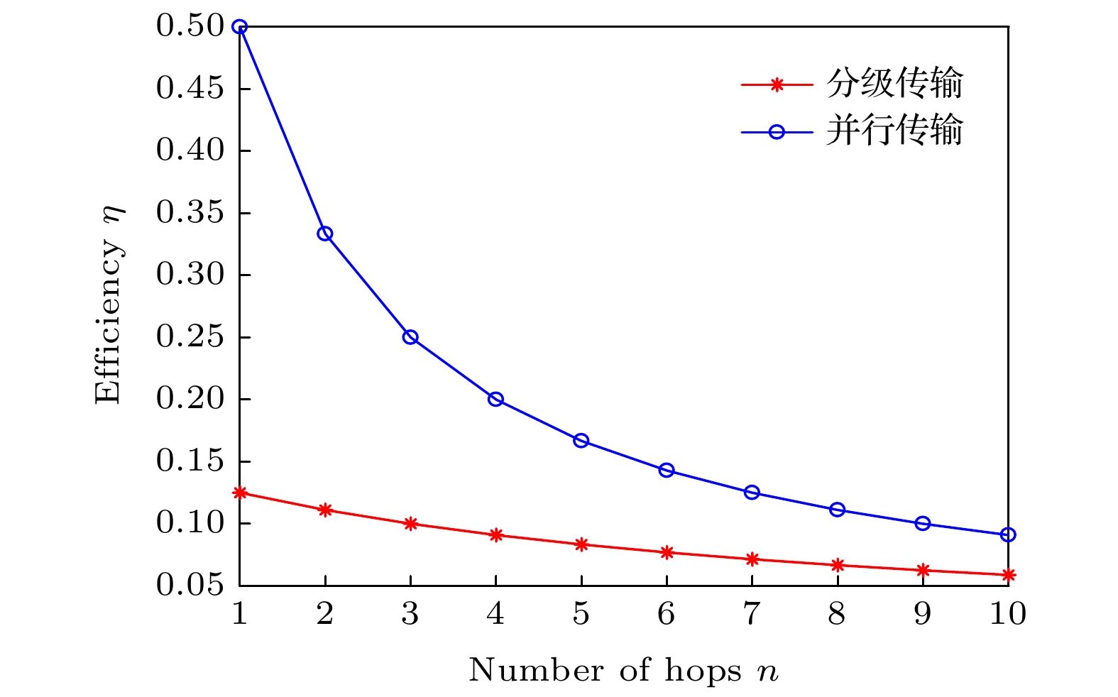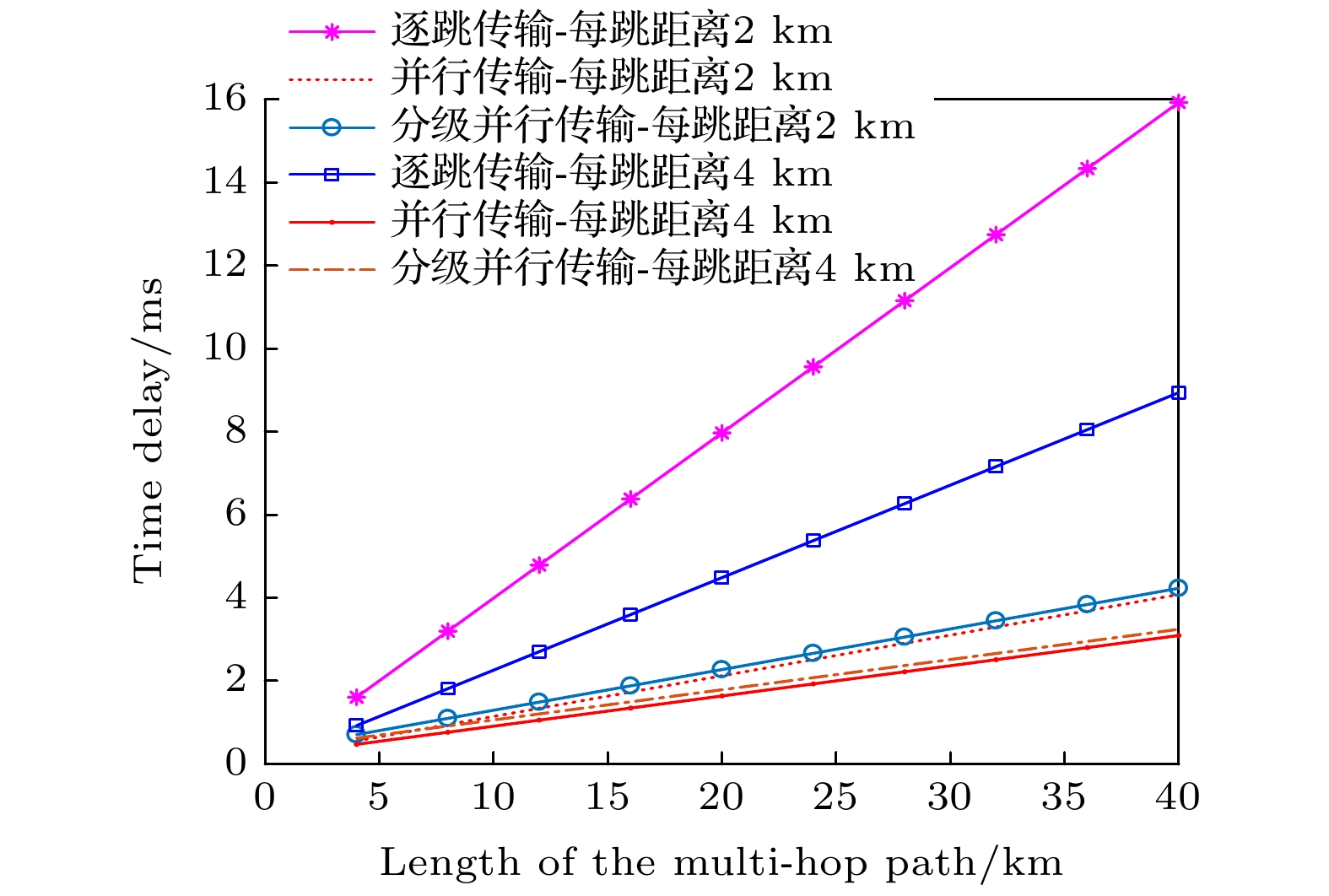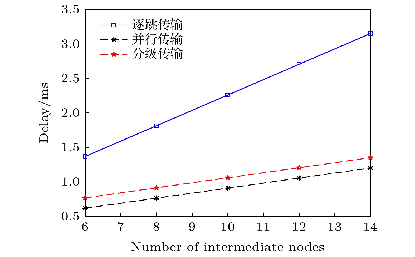 基于纠缠交换方法进行多跳量子信息传输,是实现远距离量子网络通信的基本方式之一. 传统的多跳量子网络通常使用单自由度极化光子纠缠态作为量子信道, 信息传输容量较低且容易受到噪声的干扰. 本文提出一种基于超纠缠的高效量子网络多跳纠缠交换方法,利用极化-空间模式两自由度的纠缠光子, 建立超纠缠量子多跳信息传输通道. 以远程超纠缠隐形传态的信道建立需求为例, 首先给出了基础的逐跳超纠缠交换方案, 为降低该方案的端到端超纠缠建立时延, 提出在中间量子节点进行同时测量的并行超纠缠交换方案. 在此基础上, 为降低并行超纠缠交换的经典信息开销, 进一步提出一种分级并行超纠缠交换方案. 理论分析及仿真结果表明该方案的纠缠建立时延接近于并行超纠缠交换方案, 但可以减少经典信息传输量, 在一定程度上实现两者的平衡. 相比传统的纠缠交换方法, 本文方案有利于解决远程超纠缠通信的需求,对未来构建更高效率的量子网络有积极意义.Entanglement swapping (ES) based multi-hop quantum information transmission is a fundamental way to realize long-distance quantum communication. However, in the conventional quantum networks, the entanglement in one degree of freedom (DOF) of photon system is usually used as a quantum channel, showing disadvantages of low capacity and susceptibility to noise. In this paper, we present an efficient multi-hop quantum hyperentanglement swapping (HES) method based on hyperentanglement, which utilizes the entangled photos in polarization and spatial-mode DOFs to establish the hyperentangled multi-hop quantum channel. Taking long-distance hyperentanglement based quantum teleportation for example, we first describe a basic hop by hop HES scheme. Then, in order to reduce the end-to-end delay of this scheme, we propose a simultaneous HES (SHES) scheme, in which the intermediate quantum nodes perform hyperentangled Bell state measurements concurrently. On the basis of this scheme, we further put forward a hierarchical SHES (HSHES) scheme that can reduce the classical information cost. Theoretical analysis and simulation results show that the end-to-end delay of HSHES is similar to that of SHES, meanwhile, the classical information cost of HSHES is much lower than that of SHES, showing a better tradeoff between the two performance metrics. Compared with the traditional ES methods, the scheme proposed in this paper is conductive to meeting the requirements for long-distance hyperentanglement based quantum communication, which has positive significance for building more efficient quantum networks in the future.