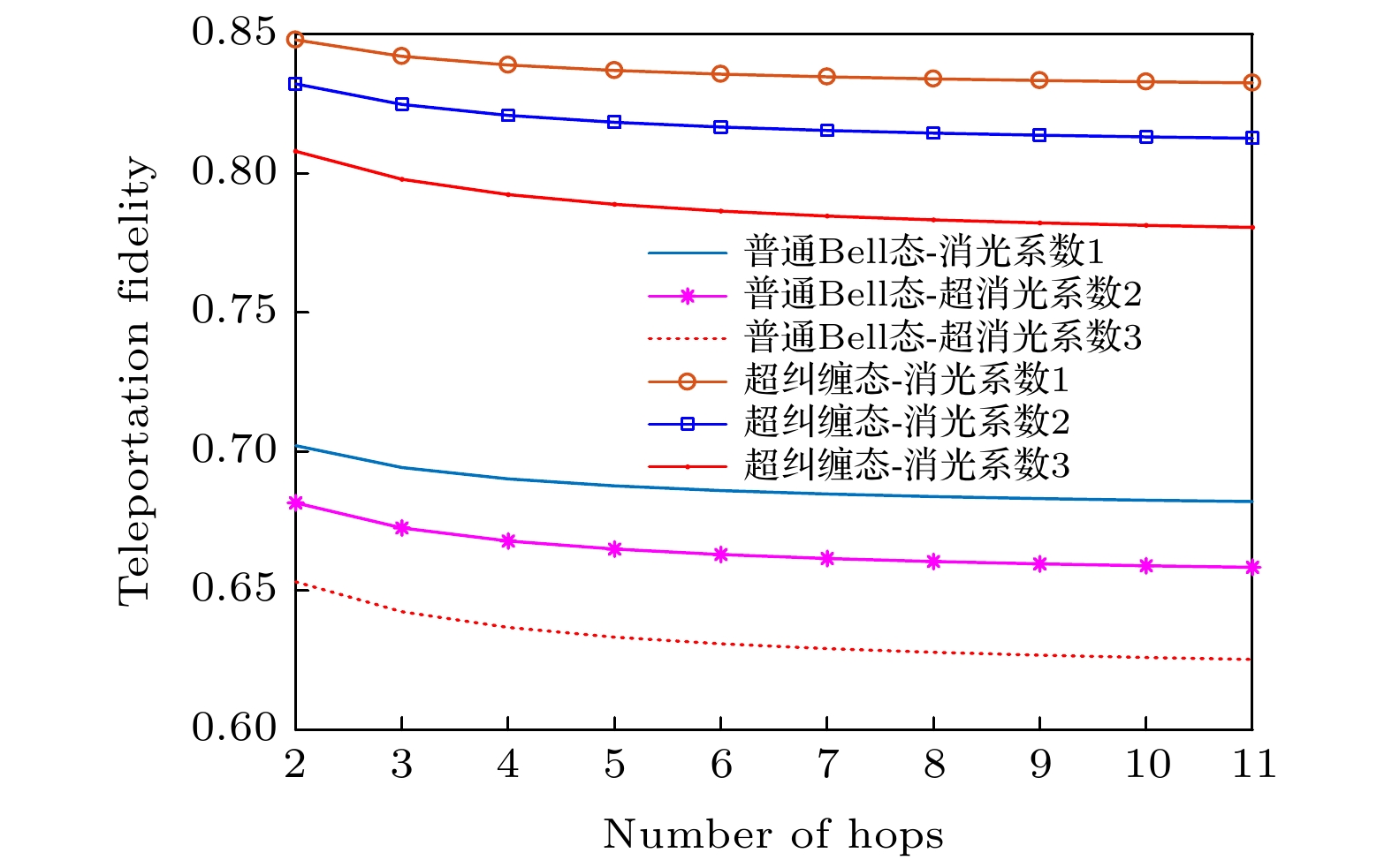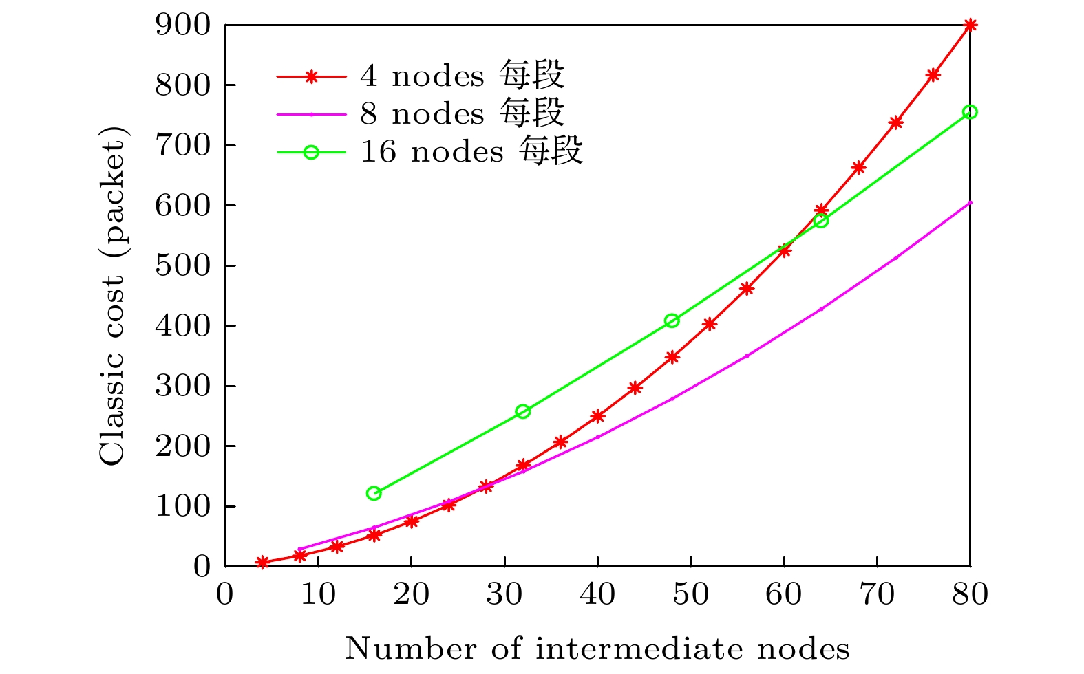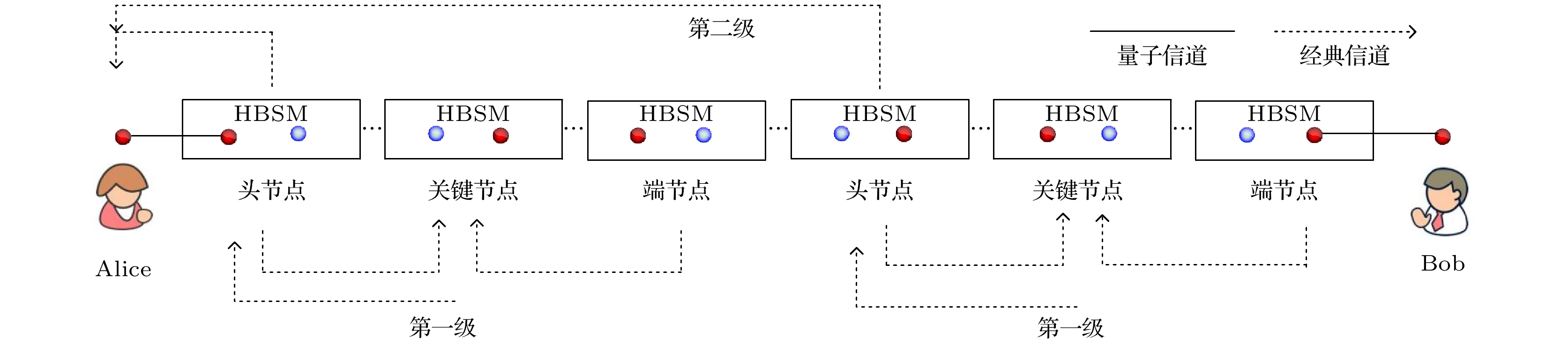 基于纠缠交换方法进行多跳量子信息传输,是实现远距离量子网络通信的基本方式之一. 传统的多跳量子网络通常使用单自由度极化光子纠缠态作为量子信道, 信息传输容量较低且容易受到噪声的干扰. 本文提出一种基于超纠缠的高效量子网络多跳纠缠交换方法,利用极化-空间模式两自由度的纠缠光子, 建立超纠缠量子多跳信息传输通道. 以远程超纠缠隐形传态的信道建立需求为例, 首先给出了基础的逐跳超纠缠交换方案, 为降低该方案的端到端超纠缠建立时延, 提出在中间量子节点进行同时测量的并行超纠缠交换方案. 在此基础上, 为降低并行超纠缠交换的经典信息开销, 进一步提出一种分级并行超纠缠交换方案. 理论分析及仿真结果表明该方案的纠缠建立时延接近于并行超纠缠交换方案, 但可以减少经典信息传输量, 在一定程度上实现两者的平衡. 相比传统的纠缠交换方法, 本文方案有利于解决远程超纠缠通信的需求,对未来构建更高效率的量子网络有积极意义.Entanglement swapping (ES) based multi-hop quantum information transmission is a fundamental way to realize long-distance quantum communication. However, in the conventional quantum networks, the entanglement in one degree of freedom (DOF) of photon system is usually used as a quantum channel, showing disadvantages of low capacity and susceptibility to noise. In this paper, we present an efficient multi-hop quantum hyperentanglement swapping (HES) method based on hyperentanglement, which utilizes the entangled photos in polarization and spatial-mode DOFs to establish the hyperentangled multi-hop quantum channel. Taking long-distance hyperentanglement based quantum teleportation for example, we first describe a basic hop by hop HES scheme. Then, in order to reduce the end-to-end delay of this scheme, we propose a simultaneous HES (SHES) scheme, in which the intermediate quantum nodes perform hyperentangled Bell state measurements concurrently. On the basis of this scheme, we further put forward a hierarchical SHES (HSHES) scheme that can reduce the classical information cost. Theoretical analysis and simulation results show that the end-to-end delay of HSHES is similar to that of SHES, meanwhile, the classical information cost of HSHES is much lower than that of SHES, showing a better tradeoff between the two performance metrics. Compared with the traditional ES methods, the scheme proposed in this paper is conductive to meeting the requirements for long-distance hyperentanglement based quantum communication, which has positive significance for building more efficient quantum networks in the future.