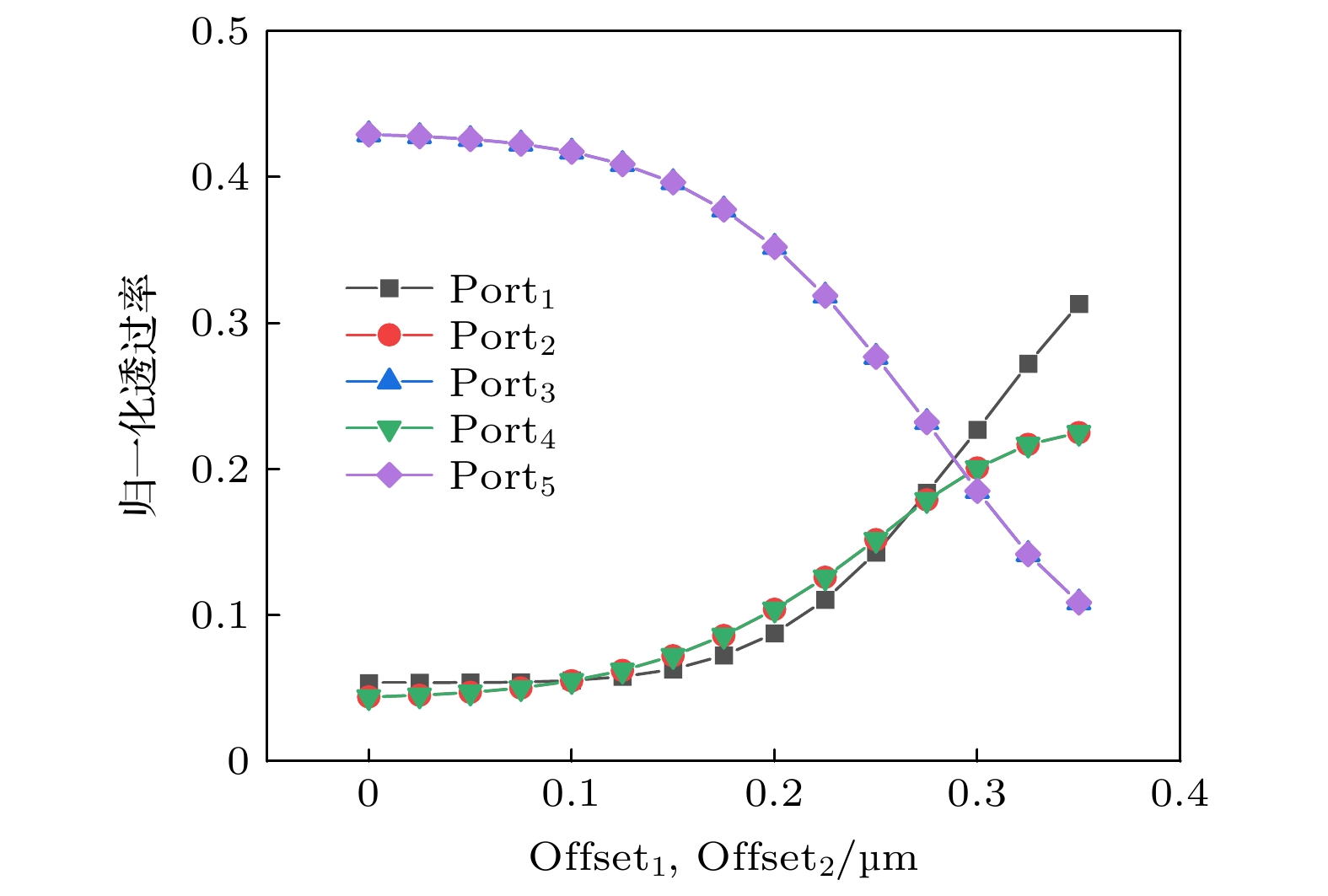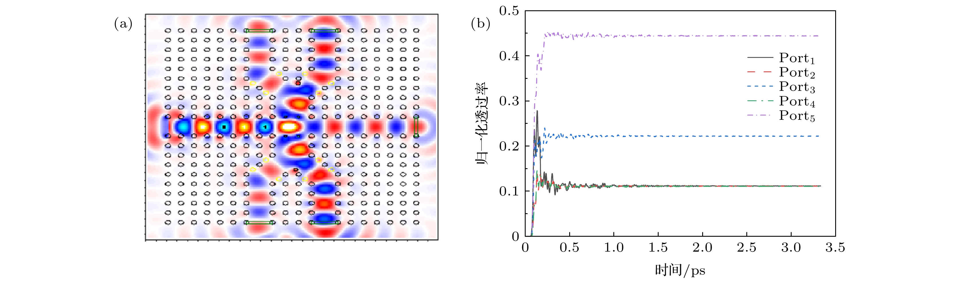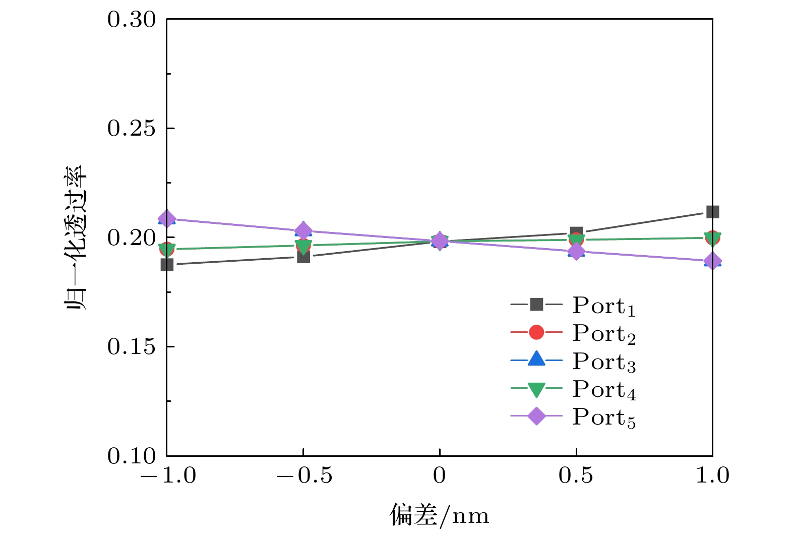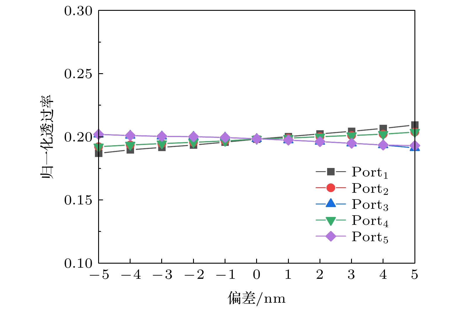1to the upper Y-junction waveguide and lower Y-junction waveguide can be controlled by optimizing the radius of the dielectric rod in the coupling region. The transmittance of the five output ports can be controlled in proportion by optimizing the lateral offset of the regulating dielectric rods. The total transmittance of the five output ports can be improved, and the output of each port can be adjusted by optimizing the radius of the regulating dielectric rod. Then, according to the specific target of the splitting ratio, using downhill-simplex algorithm, the 1×5 beam splitter with different splitting ratio can be reversely designed by optimizing the radius of the coupling dielectric rod and the radius and the lateral offset of the regulating dielectric rod within the selected optimization range. The total transmittance of the 1×5 beam splitter is above 99%, the additional loss is less than 0.044 dB, and the response time is less than 1ps. Besides, to determine the allowable error range of each optimization variable in actual processing, the machining error of the 1×5 beam splitter is analyzed, which provides a theoretical reference for fabricating the device. Owing to the advantages of flexible splitting ratio design, high optimization efficiency, small size and excellent performance, the proposed 1×5 beam splitter will have broad application prospects in the field of photonic integrated circuits and so on.