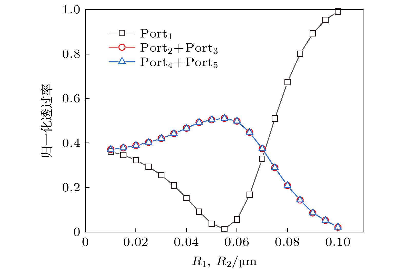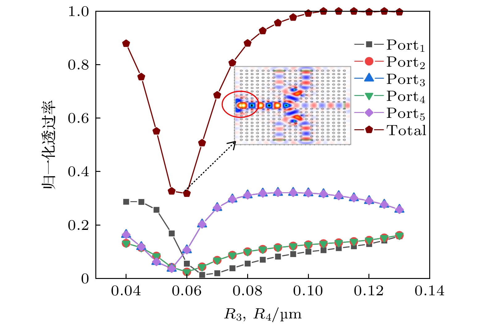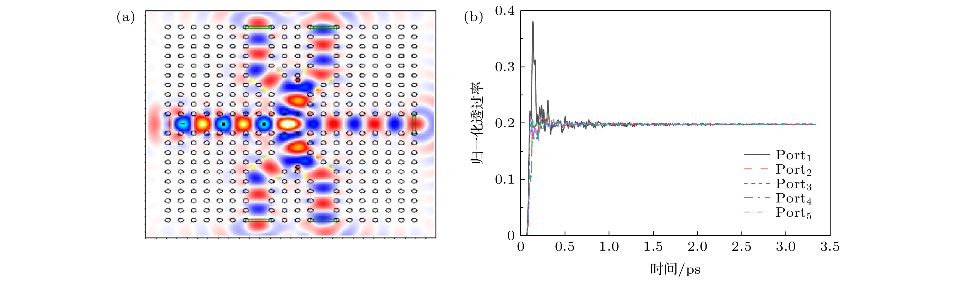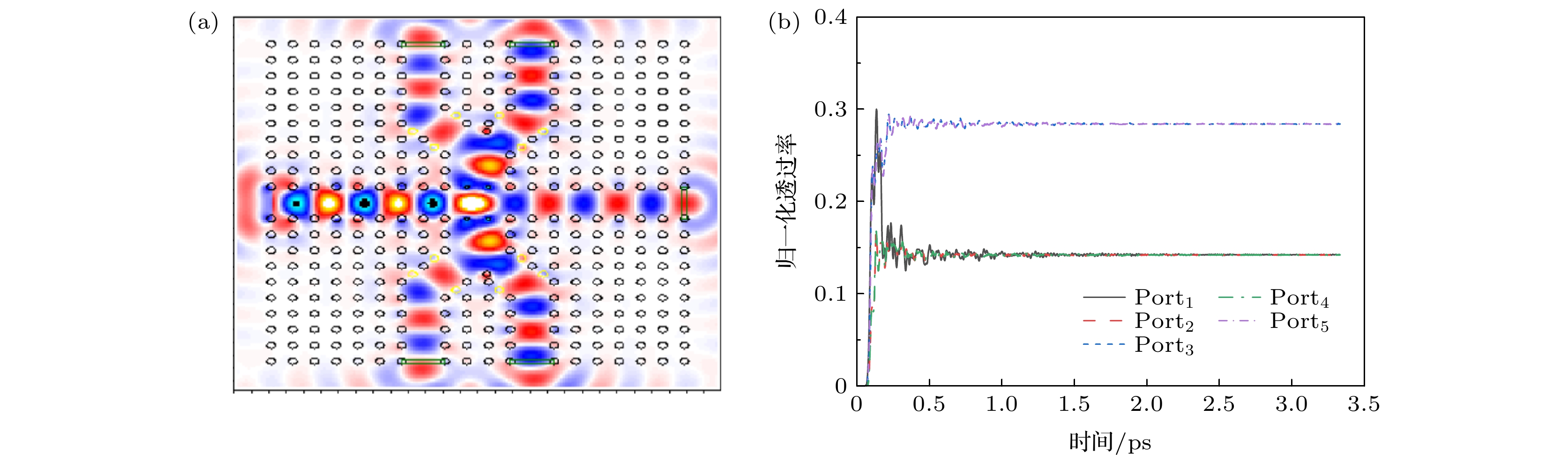 1to the upper Y-junction waveguide and lower Y-junction waveguide can be controlled by optimizing the radius of the dielectric rod in the coupling region. The transmittance of the five output ports can be controlled in proportion by optimizing the lateral offset of the regulating dielectric rods. The total transmittance of the five output ports can be improved, and the output of each port can be adjusted by optimizing the radius of the regulating dielectric rod. Then, according to the specific target of the splitting ratio, using downhill-simplex algorithm, the 1×5 beam splitter with different splitting ratio can be reversely designed by optimizing the radius of the coupling dielectric rod and the radius and the lateral offset of the regulating dielectric rod within the selected optimization range. The total transmittance of the 1×5 beam splitter is above 99%, the additional loss is less than 0.044 dB, and the response time is less than 1ps. Besides, to determine the allowable error range of each optimization variable in actual processing, the machining error of the 1×5 beam splitter is analyzed, which provides a theoretical reference for fabricating the device. Owing to the advantages of flexible splitting ratio design, high optimization efficiency, small size and excellent performance, the proposed 1×5 beam splitter will have broad application prospects in the field of photonic integrated circuits and so on.