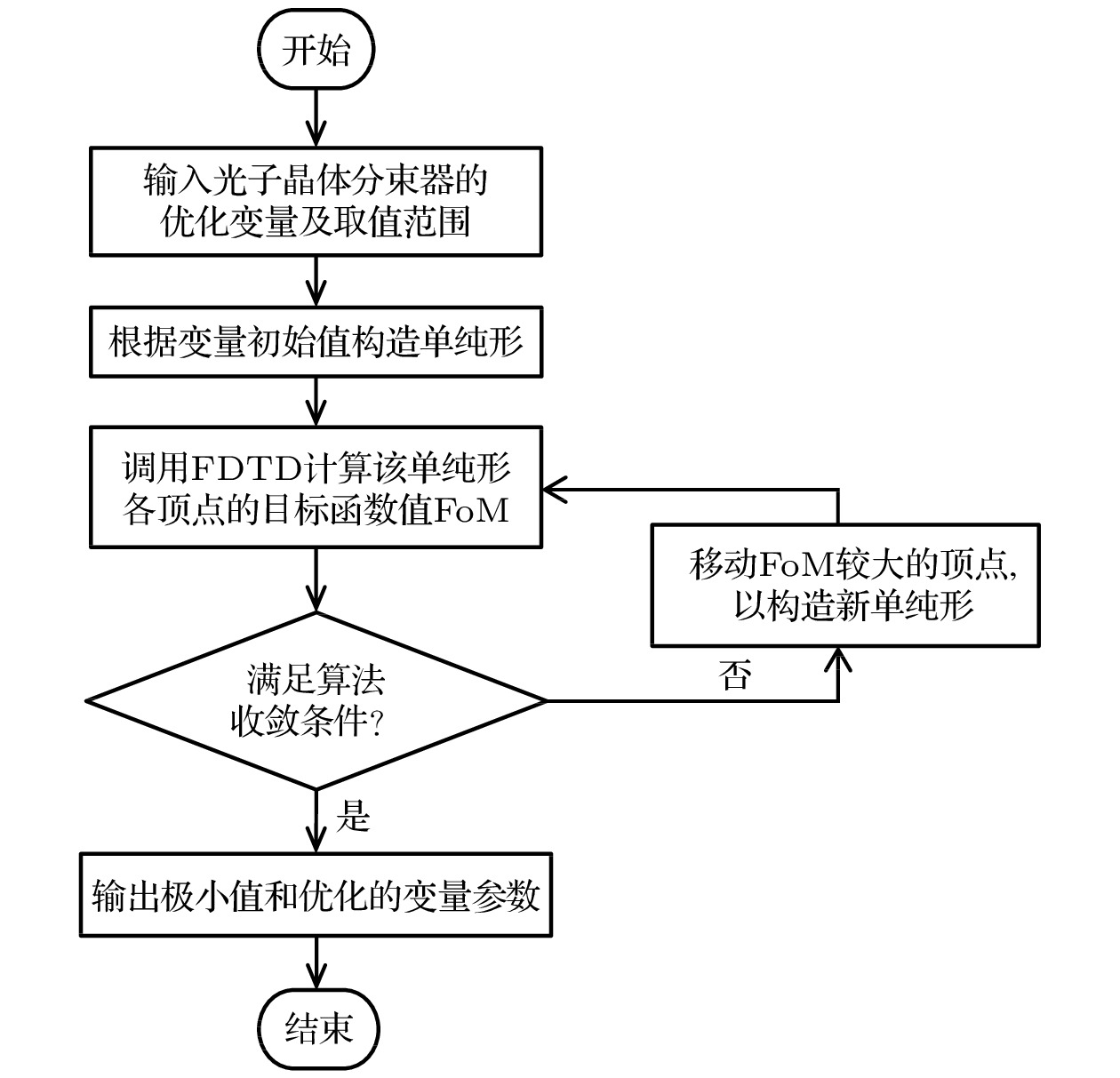 Beam splitter, whose main function is to achieve the splitting, combining and routing of optical signals, is an important component of photonic integrated circuits, passive optical network and other fields. Compared with the conventional beam splitter, photonic crystal beam splitter, which has the virtues of smaller size and higher transmission efficiency, is very suitable for high-density and large-scale integration. The traditional control variable method often used in the optimal design of photonic crystal beam splitter is time-consuming and inefficient. When parameter variables are large, it is difficult for beam splitter to achieve the optimal splitting performance. In addition, it is hard to realize flexible design of beam splitting ratio when optimizing multi-channel photonic crystal beam splitter by this method. In this paper, a novel photonic crystal 1×5 beam splitter, in which two special Y-junction waveguides are introduced into a completely two-dimensional square lattice silicon, is proposed and optimally designed by using downhill-simplex algorithm. Firstly, to determine the optimization range of each variable, the influences of the radius of the dielectric rod in the coupling region and the radius and the lateral offset of the regulating dielectric rod in the center of the two Y-junction waveguides on the five output ports of the 1×5 beam splitter are explored respectively by the plane wave expansion method and finite difference time domain method. The results show that the optical energy coupled from the main waveguide W