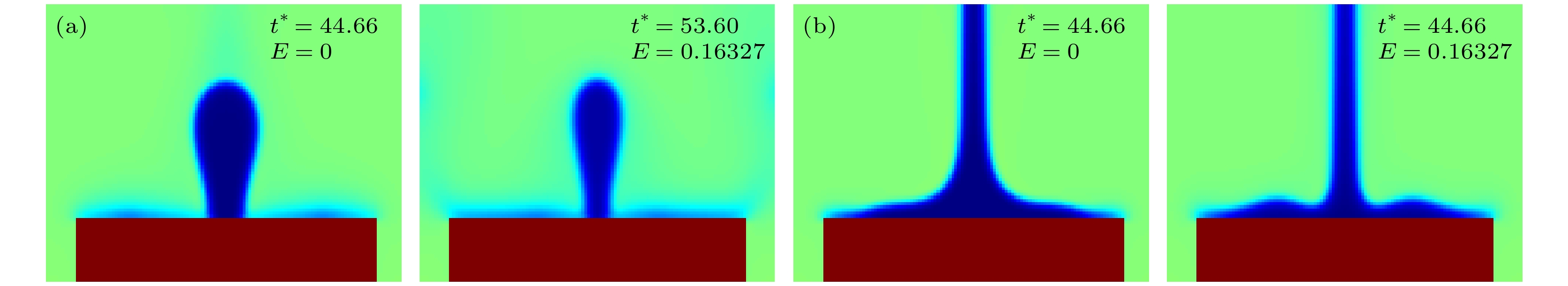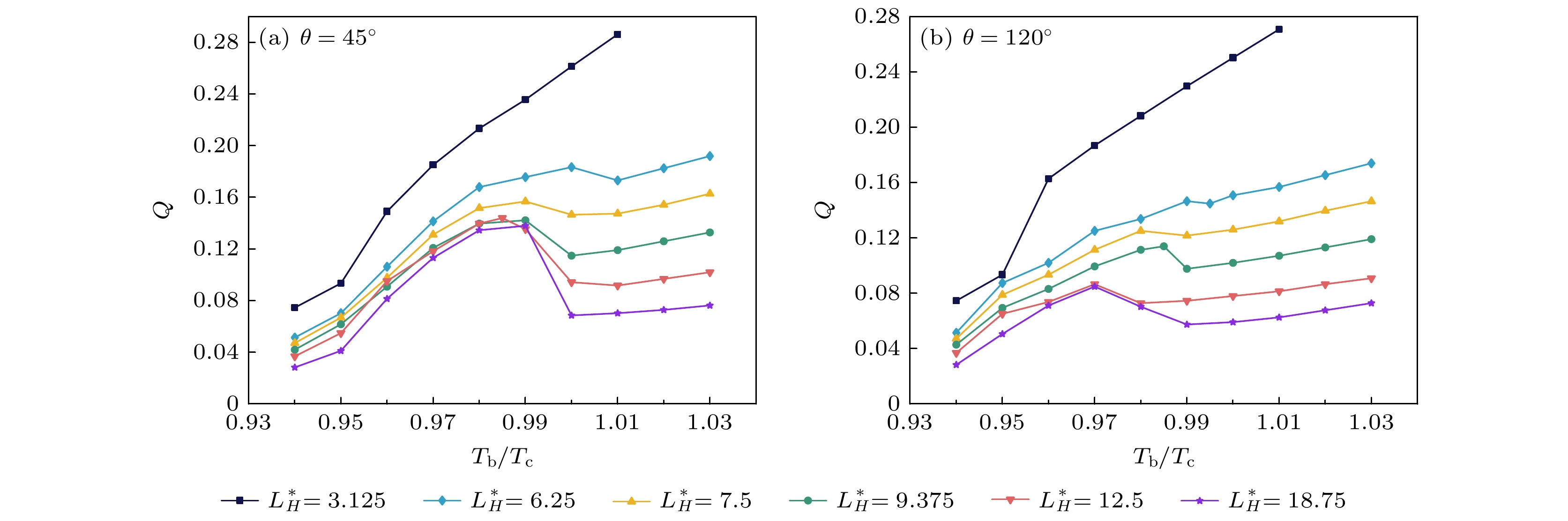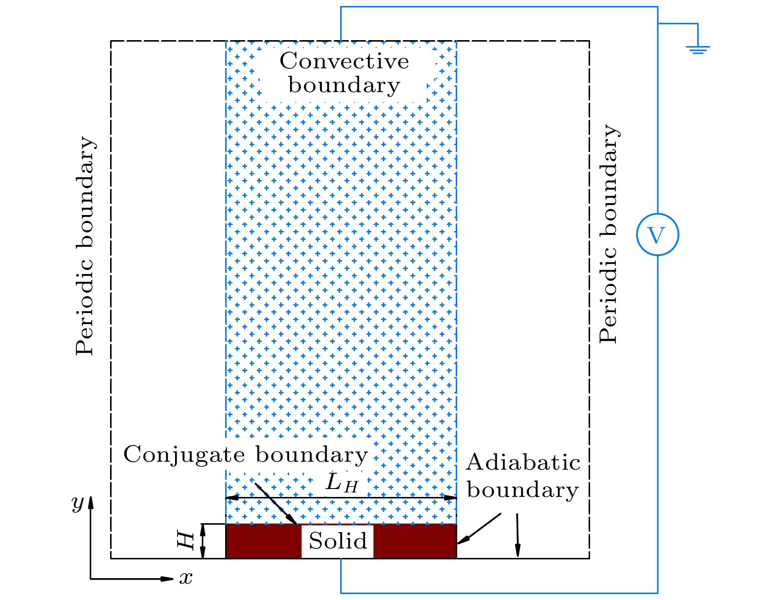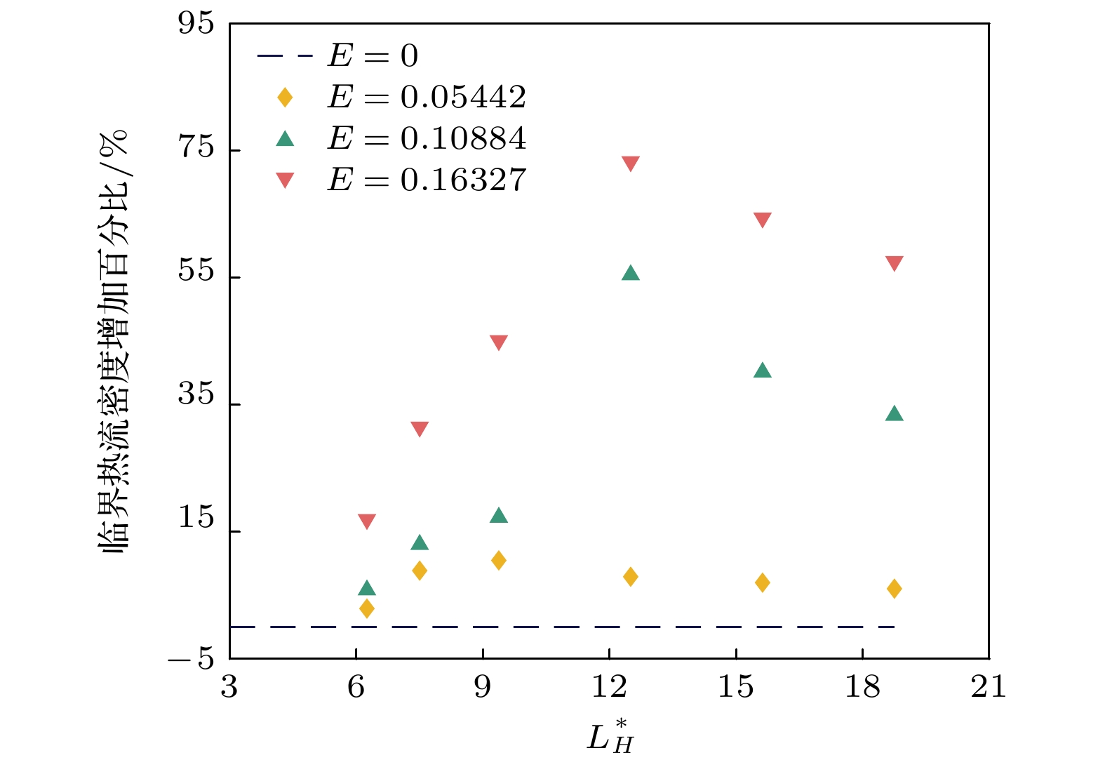$L_H^*\leqslant6.25$ 时, 由于加热器尺寸较小, 沸腾过程中加热器表面产生的气泡相互作用力弱, 此情况下电场的存在使得气泡体积减小, 沸腾被抑制. 当加热器长度$6.25< L_H^*\leqslant $ $ 9.375$ 时, 均匀电场均能提高临界热流密度(critical heat flux, CHF), 且在此加热器长度范围内, CHF提高的百分比随着电场强度的增大而增大. 这是因为$6.25 时, 更长的加热器为气泡的生成提供了充分的空间, 气泡之间的相互作用力较强, 均匀电场作用下的气泡间距增大, 气泡数量增加, 且CHF提高百分比逐渐增大; 当$L_H^*>9.375$ 时, 再润湿阻力随着加热器长度的增大而增大, 导致沸腾过程中产生的蒸气在电场力作用下容易被紧贴于加热表面, 增加了固体与流体之间的换热热阻, 并在气泡根部形成不利于气泡向中间移动的涡, 减缓了加热表面热流体与两侧较冷流体的热质交换, CHF提高的百分比随着加热器长度的增大逐渐减小. 对于疏水表面, 随着长度的增大, CHF提高百分比同样为先增大后减小, 然而其阈值增大.The phase change lattice Boltzmann (LB) model combined with the electric field model is employed to investigate the heat transfer performance of saturated pool boiling. Particular attention is paid to the influence of heater surface wettability and heater length on bubble behaviors, including generation, merging, and fracture during boiling in a uniform electric field. Moreover, the effects of the bubble behavior on heat transfer performance are also investigated. The study results indicate that the enhancement of boiling heat transfer by the electric field is dependent on both the heater length and the wettability. In the case of a hydrophilic surface, when the heater length$L_H^*\leqslant 6.25$ , the bubble interaction force generated on the heater surface during boiling is weak due to the small size of the heater. Thus the effect of a uniform electric field on the bubble dynamic behaviors is mainly manifested by reducing the bubble size. As a result, the whole boiling phase is suppressed in this case. In the case of$6.25 < L_H^*\leqslant9.375$ , the uniform electric field enhances the critical heat flux (CHF), and the enhancement degree increases with electric field strength increasing. This can be attributed to the longer heater providing sufficient space for bubble generation, resulting in increased bubble nucleation sites and stronger interaction forces between bubbles. On the other hand, the distance between adjacent bubbles increases with the heater length increasing,thus further contributing to the improved CHF percentage. When$L_H^*>9.375$ , the rewetting resistance increases with heater length increasing. So the vapor generated in the boiling process is prone to be closely adhered to the heating surface under the action of electric field force, forming a thin layer of vapor on the heater surface. The vapor not only increases the heat transfer thermal resistance between the solid and the fluid but also creates no vortex near the bubble. This is not conducive to the movement of the bubble to the middle of the heater, thereby slowing down the heat mass exchange between the hot fluid on the heating surface and the colder fluid on both sides. As a result, the improved percentage of CHF decreases gradually with the increase in the heater length. In the case of hydrophobic surfaces, the increased percentage of CHF initially increases with heater length increasing and then decreases. However, comparing with the hydrophilic surface, the increase of the heater source length corresponds to the beginning of the decrease of critical heat flux.[1] [2] [3] [4] [5] [6] [7] [8] [9] [10] [11] [12] [13] [14] [15] [16] [17] [18] [19] [20] [21] [22] [23] [24] [25] [26] [27] [28] [29] [30] [31] [32] [33] [34] [35] [36] [37] [38] [39] [40] -