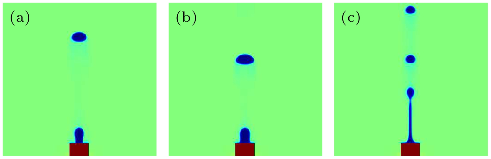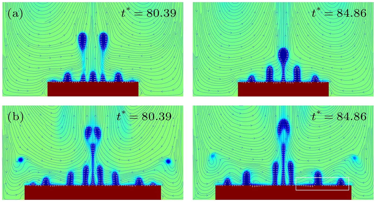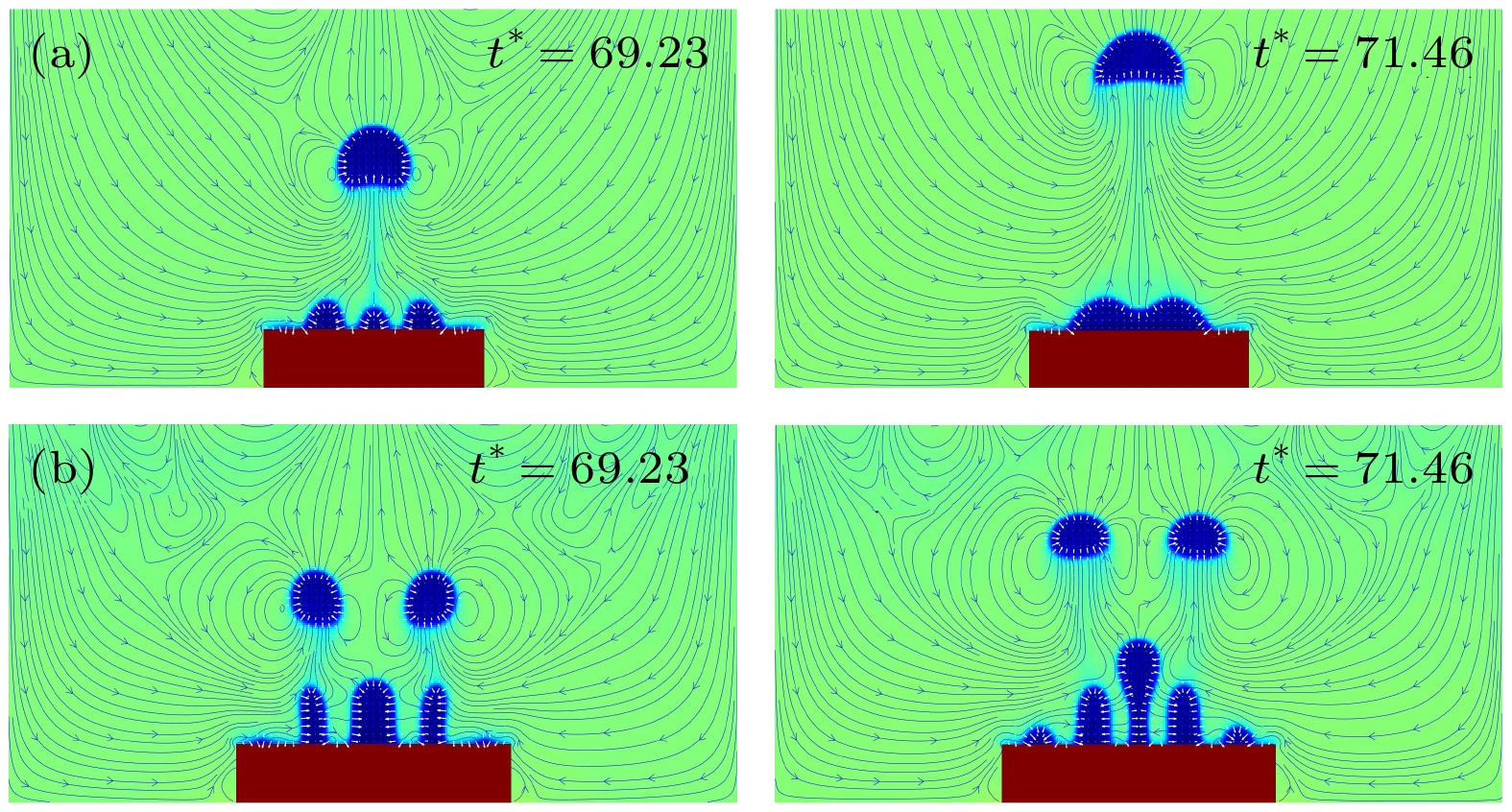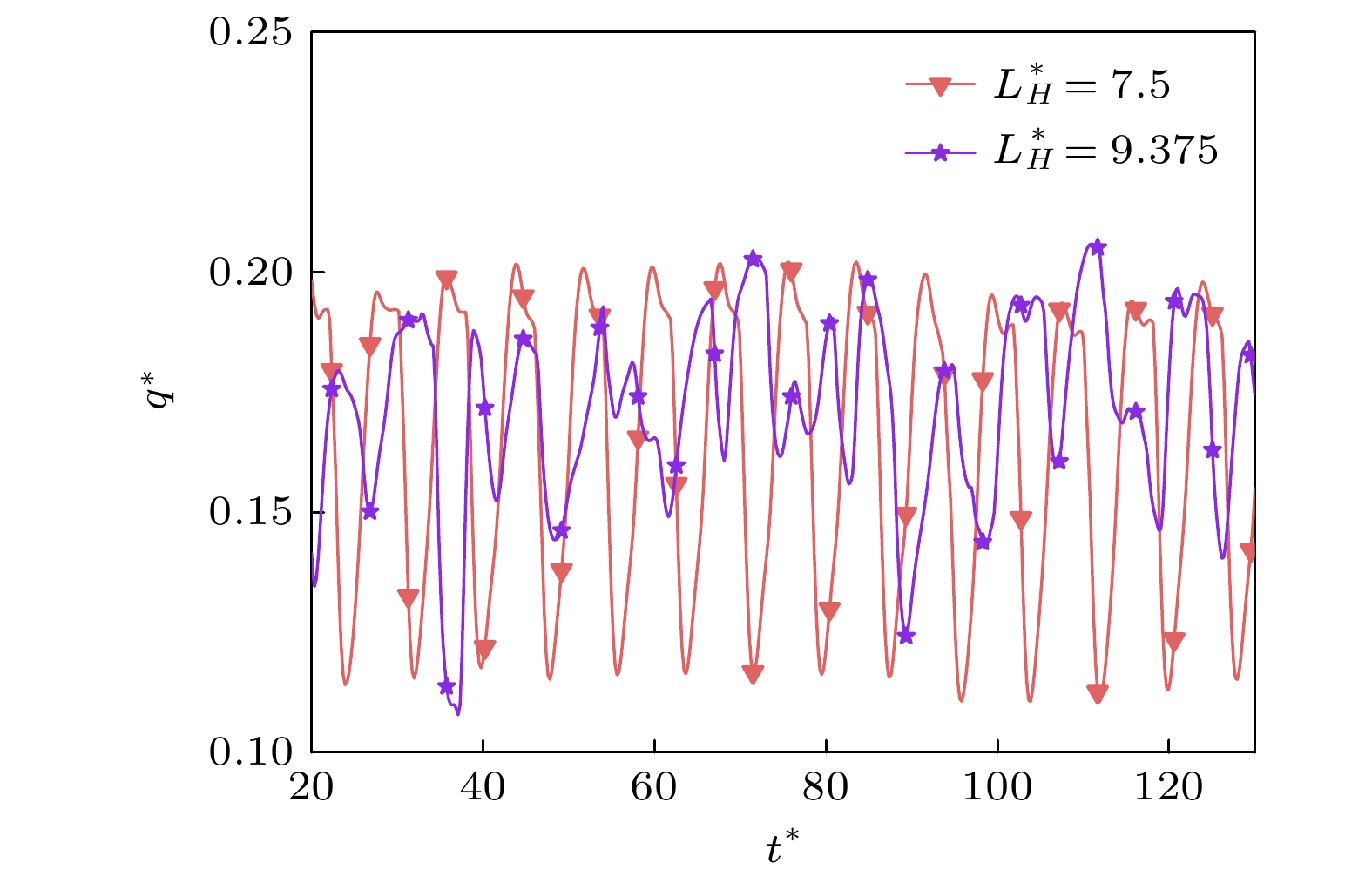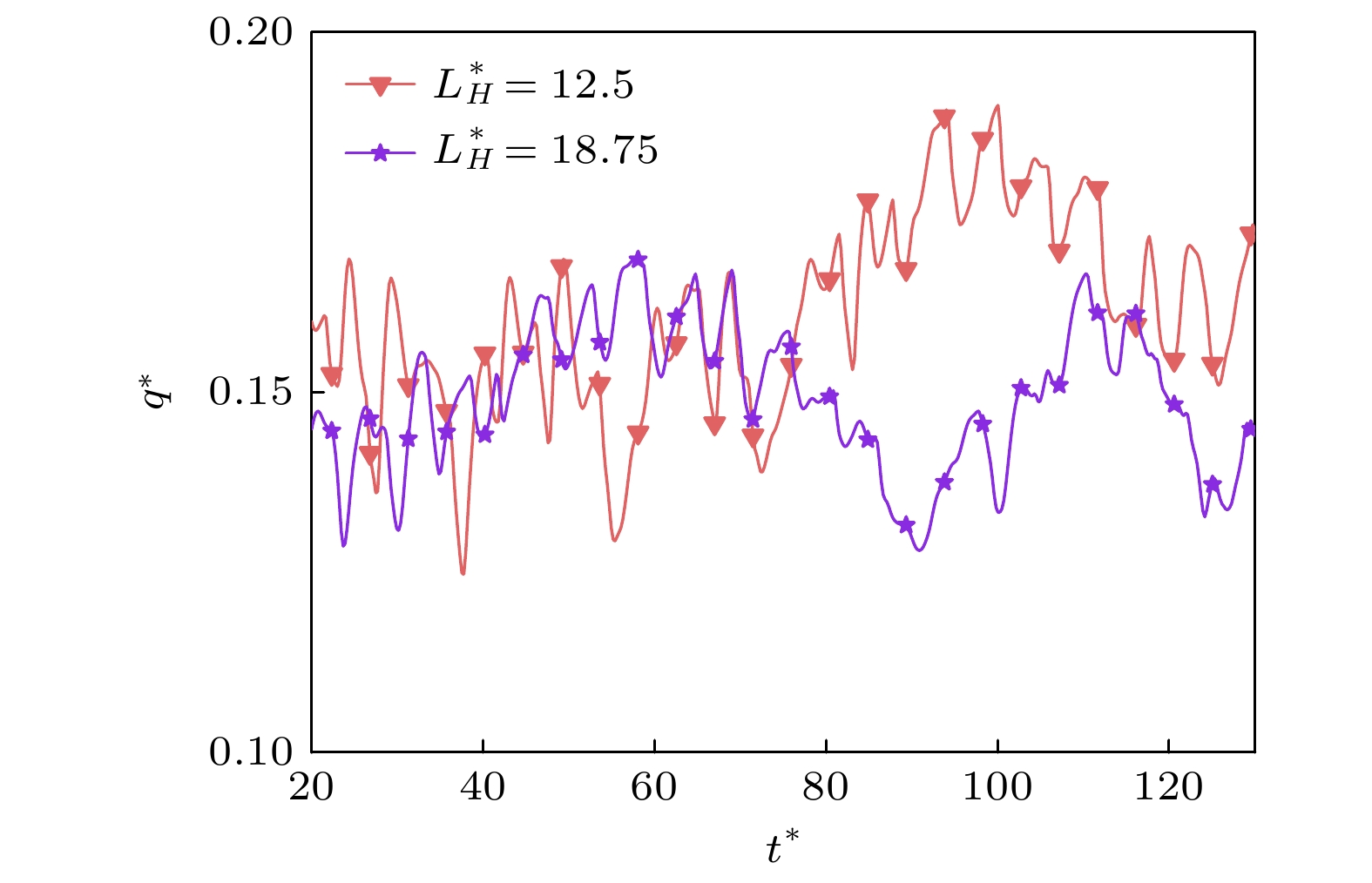 $L_H^*\leqslant6.25$ 时, 由于加热器尺寸较小, 沸腾过程中加热器表面产生的气泡相互作用力弱, 此情况下电场的存在使得气泡体积减小, 沸腾被抑制. 当加热器长度$6.25< L_H^*\leqslant $ $ 9.375$ 时, 均匀电场均能提高临界热流密度(critical heat flux, CHF), 且在此加热器长度范围内, CHF提高的百分比随着电场强度的增大而增大. 这是因为$6.25 时, 更长的加热器为气泡的生成提供了充分的空间, 气泡之间的相互作用力较强, 均匀电场作用下的气泡间距增大, 气泡数量增加, 且CHF提高百分比逐渐增大; 当$L_H^*>9.375$ 时, 再润湿阻力随着加热器长度的增大而增大, 导致沸腾过程中产生的蒸气在电场力作用下容易被紧贴于加热表面, 增加了固体与流体之间的换热热阻, 并在气泡根部形成不利于气泡向中间移动的涡, 减缓了加热表面热流体与两侧较冷流体的热质交换, CHF提高的百分比随着加热器长度的增大逐渐减小. 对于疏水表面, 随着长度的增大, CHF提高百分比同样为先增大后减小, 然而其阈值增大.The phase change lattice Boltzmann (LB) model combined with the electric field model is employed to investigate the heat transfer performance of saturated pool boiling. Particular attention is paid to the influence of heater surface wettability and heater length on bubble behaviors, including generation, merging, and fracture during boiling in a uniform electric field. Moreover, the effects of the bubble behavior on heat transfer performance are also investigated. The study results indicate that the enhancement of boiling heat transfer by the electric field is dependent on both the heater length and the wettability. In the case of a hydrophilic surface, when the heater length$L_H^*\leqslant 6.25$ , the bubble interaction force generated on the heater surface during boiling is weak due to the small size of the heater. Thus the effect of a uniform electric field on the bubble dynamic behaviors is mainly manifested by reducing the bubble size. As a result, the whole boiling phase is suppressed in this case. In the case of$6.25 < L_H^*\leqslant9.375$ , the uniform electric field enhances the critical heat flux (CHF), and the enhancement degree increases with electric field strength increasing. This can be attributed to the longer heater providing sufficient space for bubble generation, resulting in increased bubble nucleation sites and stronger interaction forces between bubbles. On the other hand, the distance between adjacent bubbles increases with the heater length increasing,thus further contributing to the improved CHF percentage. When$L_H^*>9.375$ , the rewetting resistance increases with heater length increasing. So the vapor generated in the boiling process is prone to be closely adhered to the heating surface under the action of electric field force, forming a thin layer of vapor on the heater surface. The vapor not only increases the heat transfer thermal resistance between the solid and the fluid but also creates no vortex near the bubble. This is not conducive to the movement of the bubble to the middle of the heater, thereby slowing down the heat mass exchange between the hot fluid on the heating surface and the colder fluid on both sides. As a result, the improved percentage of CHF decreases gradually with the increase in the heater length. In the case of hydrophobic surfaces, the increased percentage of CHF initially increases with heater length increasing and then decreases. However, comparing with the hydrophilic surface, the increase of the heater source length corresponds to the beginning of the decrease of critical heat flux.[1] [2] [3] [4] [5] [6] [7] [8] [9] [10] [11] [12] [13] [14] [15] [16] [17] [18] [19] [20] [21] [22] [23] [24] [25] [26] [27] [28] [29] [30] [31] [32] [33] [34] [35] [36] [37] [38] [39] [40] -