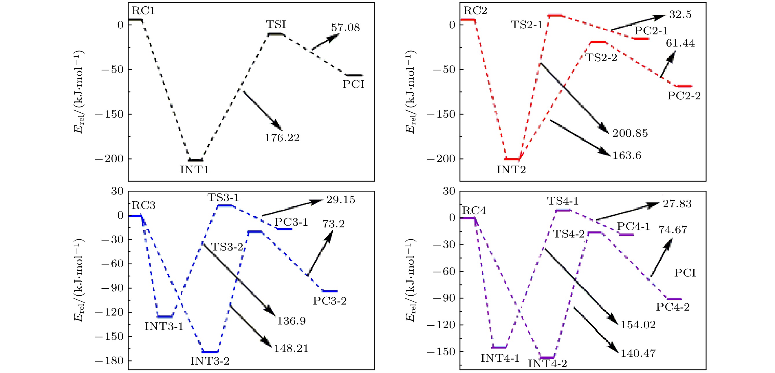 n= 1–4) clusters and their P-doped clusters at the 6-31G(d,p) basis set level are carried out, and their corresponding most stable configurations are obtained. The distribution and stability of the frontier orbitals of the relevant reactants are calculated. Using the same method and basis set, the theoretical calculation and analysis of the reaction mechanism between P-doped (LiNH