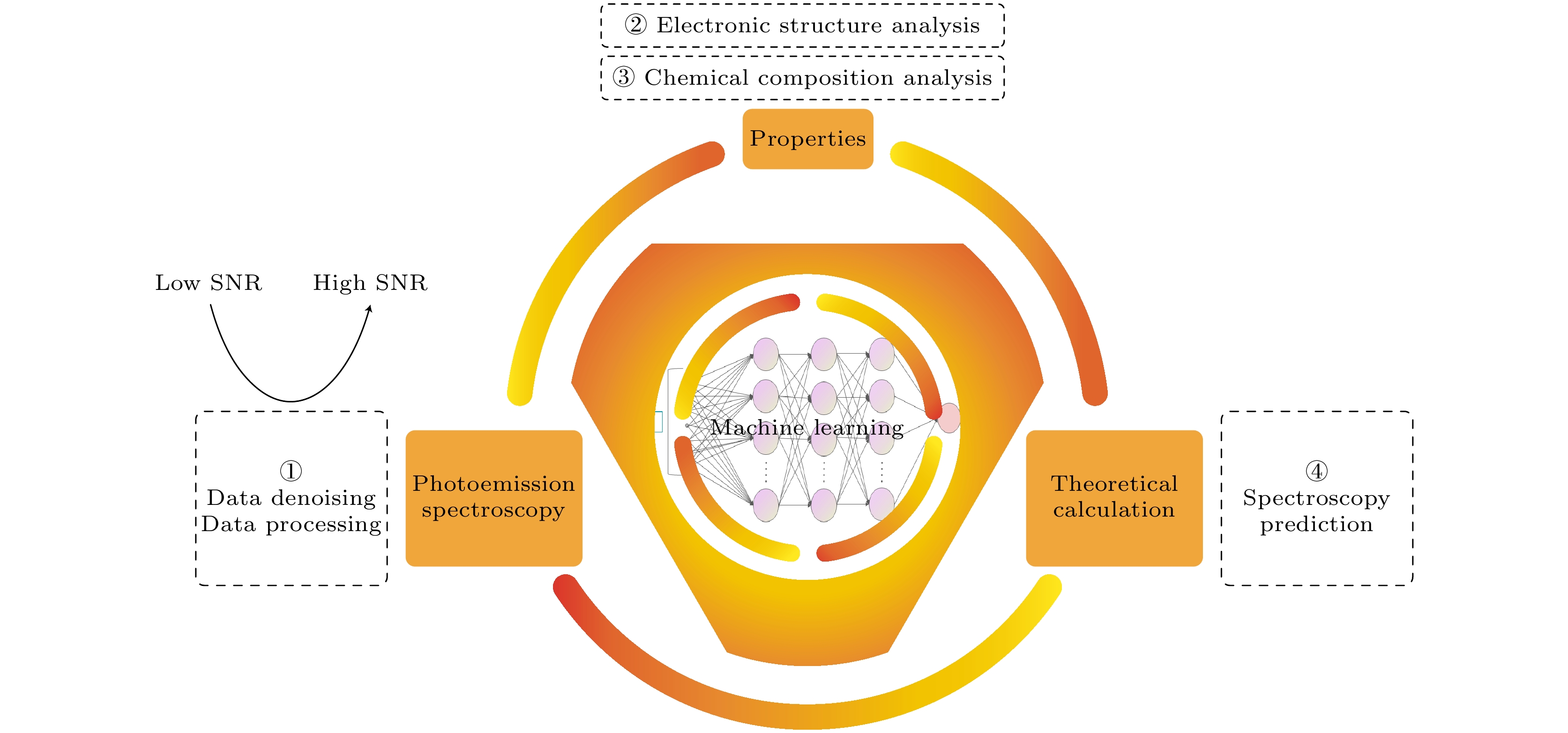 Photoelectron spectroscopy serves as a prevalent characterization technique in the field of materials science. Especially, angle-resolved photoelectron spectroscopy (ARPES) provides a direct method for determining the energy-momentum dispersion relationship and Fermi surface structure of electrons in a material system, therefore ARPES has become a potent tool for investigating many-body interactions and correlated quantum materials. With the emergence of technologies such as time-resolved ARPES and nano-ARPES, the field of photoelectron spectroscopy continues to advance. Meanwhile, the development of synchrotron radiation facilities has led to an increase of high-throughput and high-dimensional experimental data. This highlights the urgency for developing more efficient and accurate data processing methods, as well as extracting deeper physical information. In light of these developments, machine learning will play an increasingly significant role in various fields, including but not limited to ARPES. This paper reviews the applications of machine learning in photoelectron spectroscopy, mainly including the following three aspects. 1) Data Denoising Machine learning can be utilized for denoising photoelectron spectroscopy data. The denoising process via machine learning algorithms can be divided into two methods. Neither of the two methods need manual data annotation. The first method is to use noise generation algorithms to simulate experimental noise, so as to obtain effective low signal-to-noise ratio data pair to high signal-to-noise ratio data pair. And the second method is to extract noise and clean spectral data. 2) Electronic Structure and Chemical Composition Analysis Machine learning can be used for analyzing electronic structure and chemical composition. (Angle-resolved) photoelectron spectroscopy contains abundant information about material structure. Information such as energy band structure, self-energy, binding energy, and other condensed matter data can be rapidly acquired through machine learning schemes. 3) Prediction of Photoelectron Spectroscopy The electronic structure information obtained by combining first-principles calculation can also predict the photoelectron spectroscopy. The rapid acquisition of photoelectron spectroscopy data through machine learning algorithms also holds significance for material design. Photoelectron spectroscopy holds significant importance in the study of condensed matter physics. In the context of the development of synchrotron radiation, the construction of an automated data acquisition and analysis system can play a pivotal role in studying condensed matter physics. In addition, adding more physical constraints to the machine learning model will improve the interpretability and accuracy of the model. There exists a close relationship between photoelectron spectroscopy and first-principles calculations of electronic structure properties. The integration of these two through machine learning is anticipated to significantly contribute to the study of electronic structure properties. Furthermore, as machine learning algorithms continue to evolve, the application of more advanced machine learning algorithms in photoelectron spectroscopy research is expected. Building automated data acquisition and analysis systems, designing comprehensive workflows based on machine learning and first-principles methods, and integrating new machine learning techniques will help accelerate the progress of photoelectron spectroscopy experiments and facilitate the analysis of electronic structure properties and microscopic physical mechanisms, thereby advancing the frontier research in quantum materials and condensed matter physics. [1] [2] [3] [4] [5] [6] [7] [8] [9] [10] [11] [12] [13] [14] [15] [16] [17] [18] [19] [20] [21] [22] [23] [24] [25] [26] [27] [28] [29] [30] [31] [32] [33] [34] [35] [36] [37] [38] [39] [40] [41] [42] [43] [44] [45] [46] [47] [48] [49] [50] [51] [52] [53] [54] [55] [56] [57] [58] [59] [60] [61] [62] [63] [64] [65] [66] [67] [68] [69] [70] [71] [72] [73] [74] [75] [76] [77] [78] [79] [80] [81] [82] [83] [84] [85] [86] [87] [88] [89] [90] [91] [92] [93] [94] [95] [96] [97] [98] [99] [100] [101] [102] [103] [104] [105] [106] [107] [108] [109] [110] [111] [112] [113] [114] [115] [116] [117] [118] [119] [120] [121] [122] [123] [124] [125] [126] [127] [128] [129] [130] [131] [132] [133] [134] [135] [136] [137] [138] [139] [140] [141] [142] [143] [144] [145] [146] -