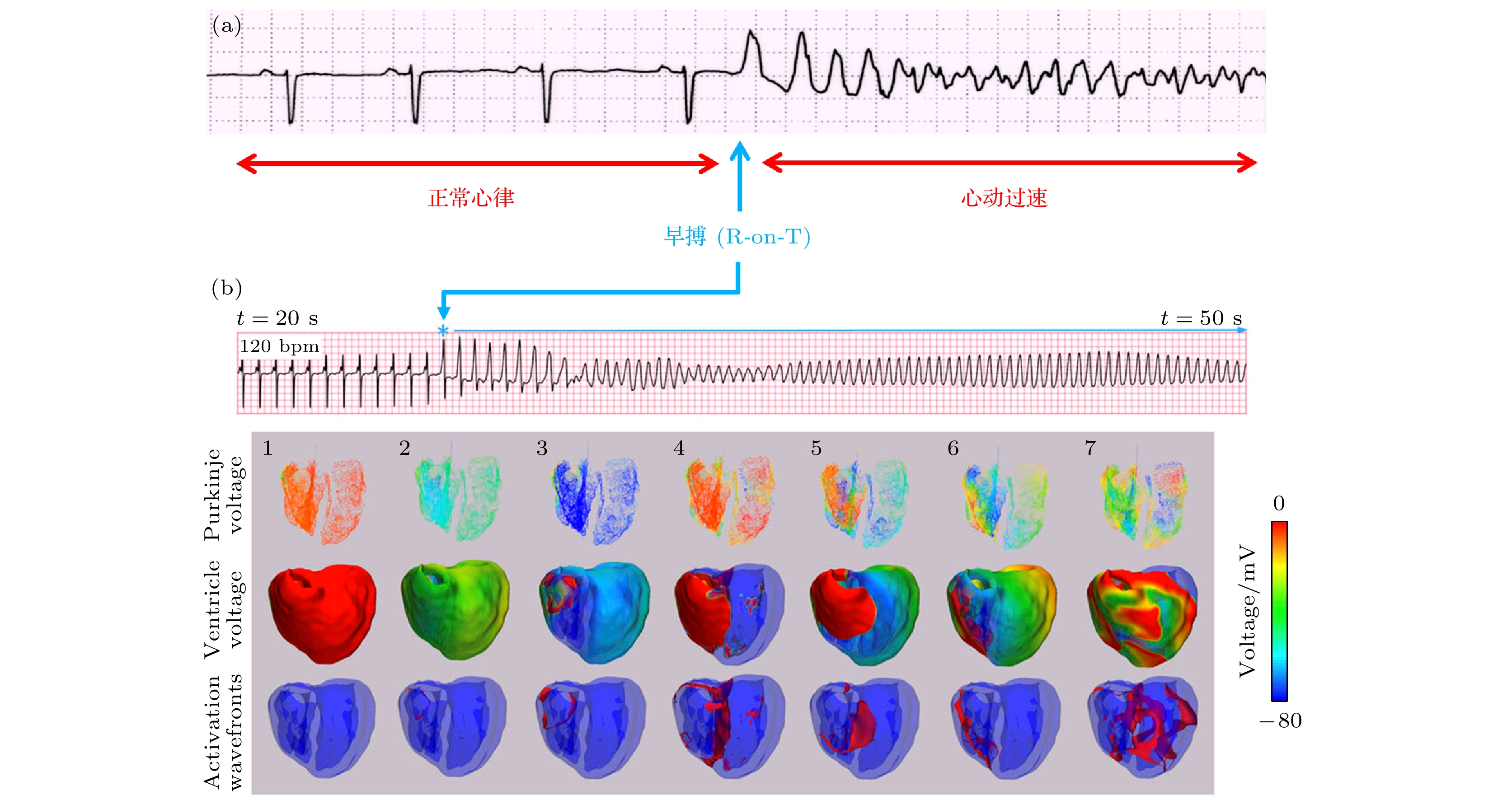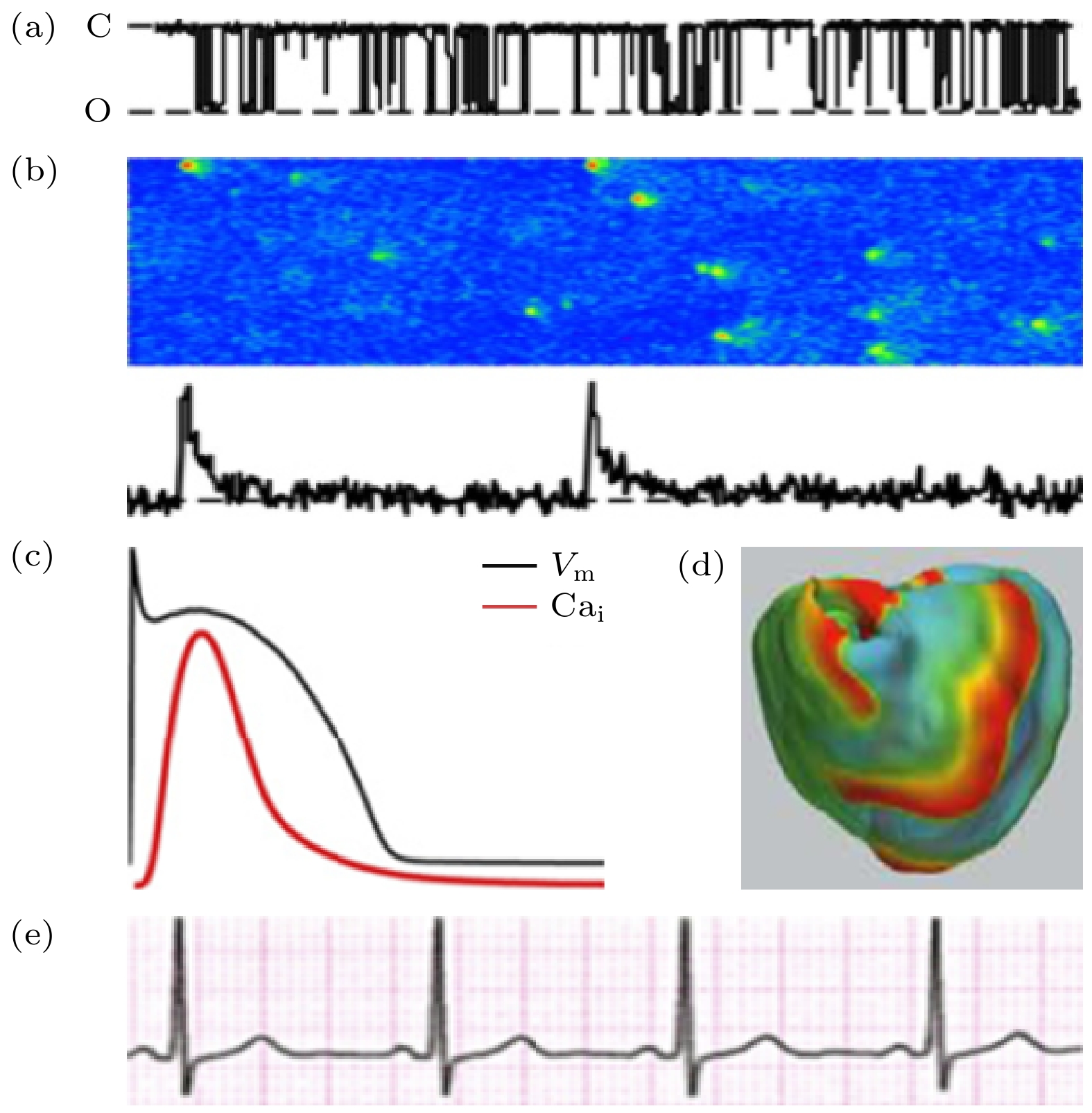 心律失常是当前生物物理交叉学科中发展得比较成熟的一个分支, 在实验和理论方面均取得了丰硕的成果. 近年来, 随着实验数据的积累, 人们在多个尺度上发现了更丰富多样的心律失常诱因, 这对物理学的研究提出了新的需求和挑战. 因此, 心肌系统的多尺度建模、计算和动力学分析是心律失常领域进一步发展的关键. 本文旨在对这个课题进行一个阶段性的回顾, 扼要介绍心肌多尺度建模的基本理念和方法, 并以尺度为脉络, 介绍近年来在心律失常机制理论方面取得的若干重要成果. 现有成果表明, 非线性动力学、斑图动力学和统计物理对心律失常的基本认识和理论的发展具有重要的意义. 未来的研究应在拓展模型尺度(向更微观和宏观方向拓展模型), 解决心律失常基础动力学问题(如非均匀系统的稳定性、斑图的相变理论), 以及解决更复杂而基本的生理医学问题(如心率变异、人群心律失常发生概率风险的评估)等方面继续深入探索.Biological systems are complex systems that are regulated on multiple scales, with dynamics ranging from random molecular fluctuations to spatiotemporal wave dynamics and periodic oscillations. To understand the underlying mechanisms and link the dynamics on a molecular scale to those on a tissue scale and an organ scale, the research approaches to integrating computer modeling and simulation, nonlinear dynamics, and experimental and clinical data have been widely used. In this article, we review how these approaches have been used to investigate the multiscale cardiac excitation dynamics, particularly the genesis of cardiac arrhythmias that can lead to sudden death. The specific topics covered in this review are as follows: i) mechanisms of formation of intracellular calcium sparks and waves on a subcellular scale, which can be described by the stochastic transitions between the two stable states of a bistable system and the second order phase transition, respectively; ii) mechanisms of triggered activities on a cellular scale resulting from transmembrane voltage and intracellular calcium cycling and their coupling, some of which can be well described by the bifurcation theories of the nonlinear dynamical system; iii) mechanisms for the genesis of arrhythmias on a tissue scale induced by the triggered activities, which can be regarded as dynamical instability-induced pattern formation in heterogeneous excitable media; and iv) manifestations of the excitation dynamics and transitions in the whole heart (on an organ scale) in electrocardiogram to bridge the spatiotemporal wave dynamics to clinical observations. These results indicate that nonlinear dynamics, pattern formation, and statistical physics are the fundamental components in establishing a theoretical framework for understanding cardiac arrhythmias.