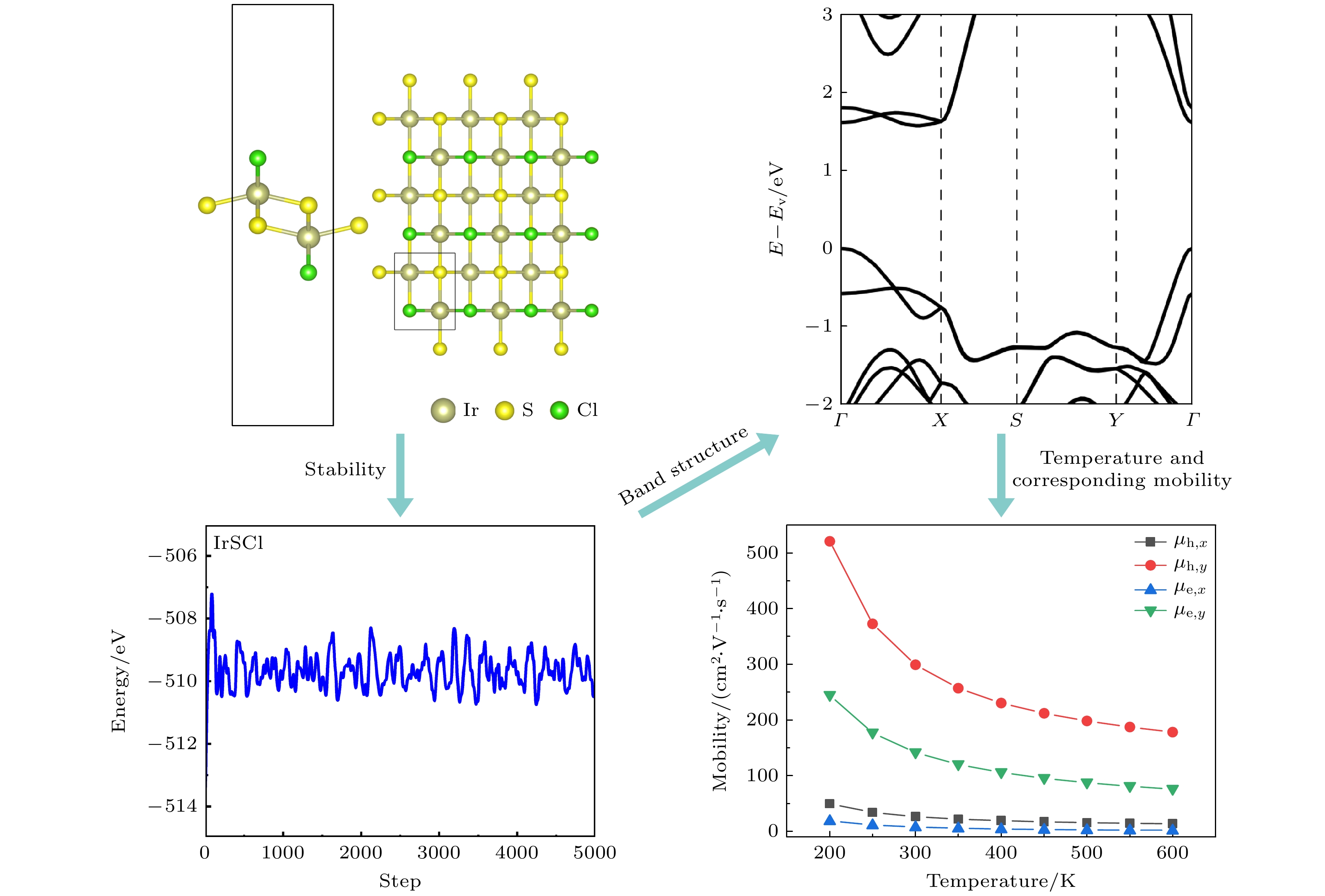 基于密度泛函理论的第一性原理计算方法, 系统研究了单层IrSCl和IrSI材料的载流子输运特性. 声子谱计算无虚频, 表明材料结构稳定, 且分子动力学模拟验证了其在300 K下的热稳定性. 结果显示, 这两种材料均为间接带隙半导体, 且在不同泛函下的带隙计算结果分别为: 单层IrSCl在PBE和HSE06泛函下的带隙.为0.37 eV和1.58 eV, 单层IrSI的带隙为0.23 eV和1.36 eV. 在双轴拉伸应变下, IrSCl和IrSI的带隙逐渐减小. 在应变6%时, 带隙分别降至0.05 eV和0.01 eV (PBE). 基于形变势理论预测, 室温下单层IrSCl和IrSI的最大载流子迁移率分别407.77 cm 2/(V·s)和202.64 cm 2/(V·s). 同时, 基于玻尔兹曼输运方程的计算结果显示, 室温下单层IrSCl和IrSI的载流子迁移率最大值分别299.15 cm 2/(V·s)和286.41 cm 2/(V·s). 这些结果表明, IrSCl和IrSI单层材料在纳米电子器件领域具有潜在的应用价值.Carrier mobility is a key parameter determining the response speed of charge carriers to electric fields in nanoelectronic devices. This study aims to investigate the charge carrier transport properties of monolayer IrSCl and IrSI. Using first-principles calculations based on density functional theory, we systematically investigate the electronic structure and transport properties of monolayer IrSCl and IrSI. The phonon dispersion calculations indicate that both IrSCl and IrSI exhibit no imaginary frequencies, confirming their structural stability. Furthermore, molecular dynamics simulations demonstrate that these materials maintain thermal stability at room temperature (300 K). The evaluation of the bandgap by using the Perdew-Burke-Ernzerhof (PBE) functional and the hybrid HSE06 functional shows that both IrSCl and IrSI are indirect bandgap semiconductors. The bandgap values for monolayer IrSCl are 0.37 eV and 1.58 eV under the PBE functional and the HSE06 functional, respectively, while those for monolayer IrSI are 0.23 eV and 1.36 eV under the PBE functional and the HSE06 functional, respectively. We further investigate the effects of biaxial tensile strain on the bandgap. The bandgap of IrSCl and IrSI decrease with the increase of strain, respectively reaching 0.05 eV and 0.01 eV under the PBE functional at a strain of 6%, indicating a strain-induced transition to metallic behavior. According to deformation potential theory and the Boltzmann transport equation, we calculate the carrier mobility for each of monolayer IrSCl and IrSI. The predicted maximum carrier mobility at room temperature is 407.77 cm 2/(V·s) for monolayer IrSCl, and 202.64 cm 2/(V·s) for monolayer IrSI. Additionally, the results from the Boltzmann transport equation show that the highest mobility is 299.15 cm 2/(V·s) for IrSCl and 286.41 cm 2/(V·s) for IrSI. These findings suggest that both IrSCl and IrSI possess favorable electronic and transport properties, thus they have become promising candidates for future applications in the field of two-dimensional nanoelectronic devices. Notably, the combination of a moderate bandgap and high carrier mobility at room temperature indicates their potential applications in the fields of transistors, sensors, and other electronic components. This study provides valuable insights into the material properties of IrSCl and IrSI, contributing to the design of novel two-dimensional materials for electronic applications.