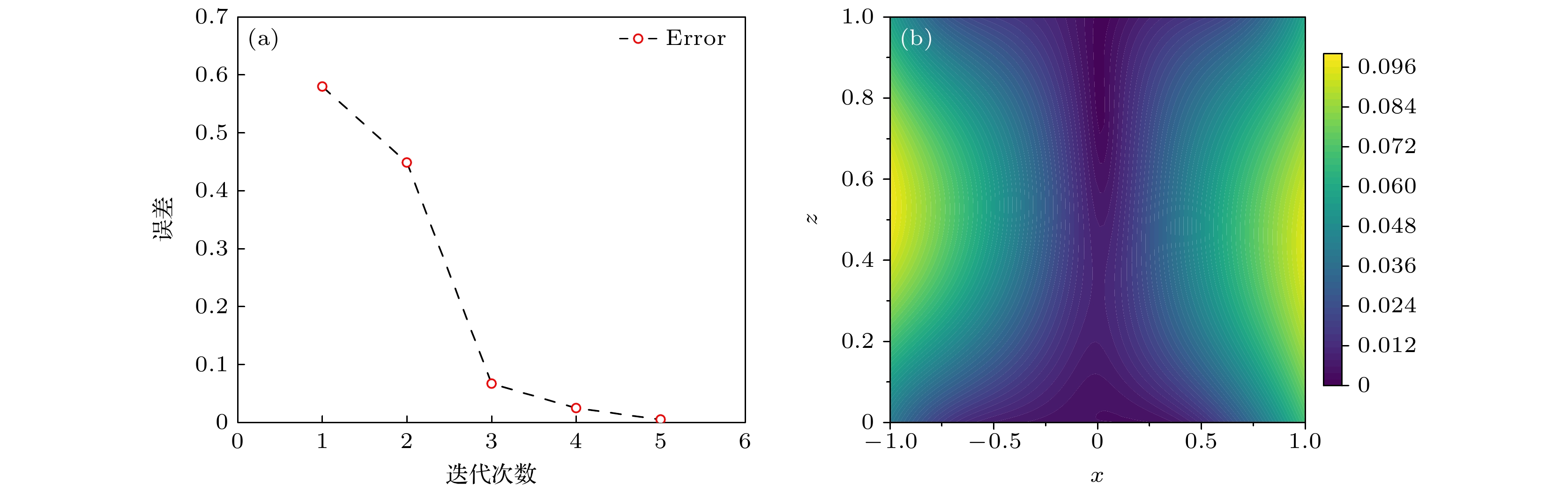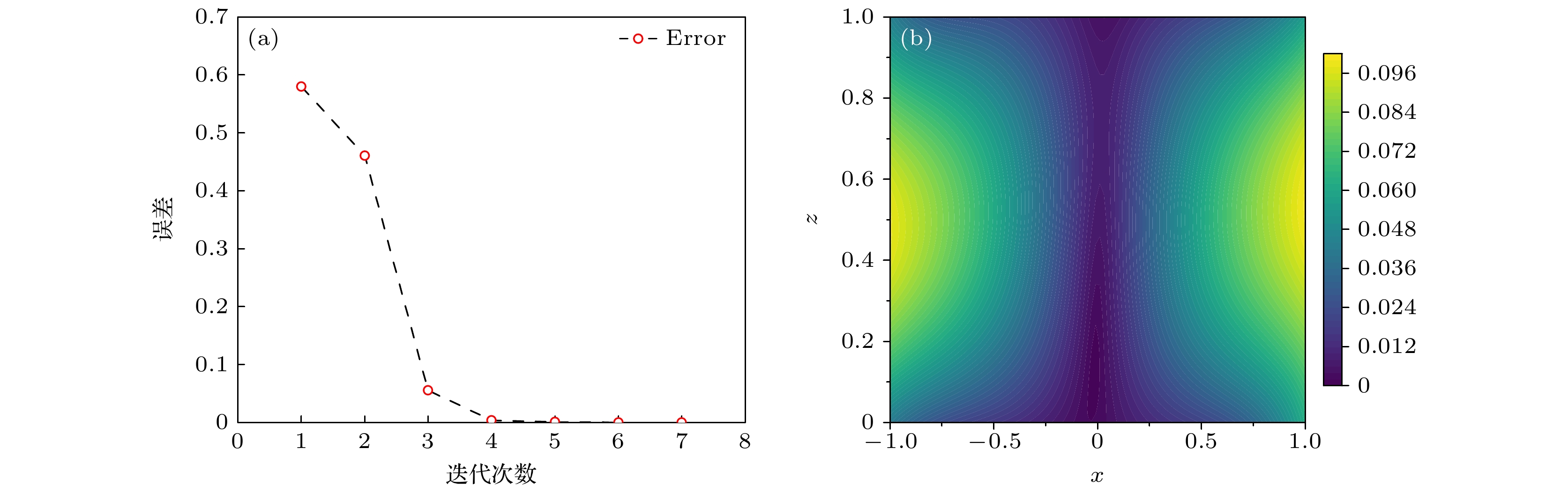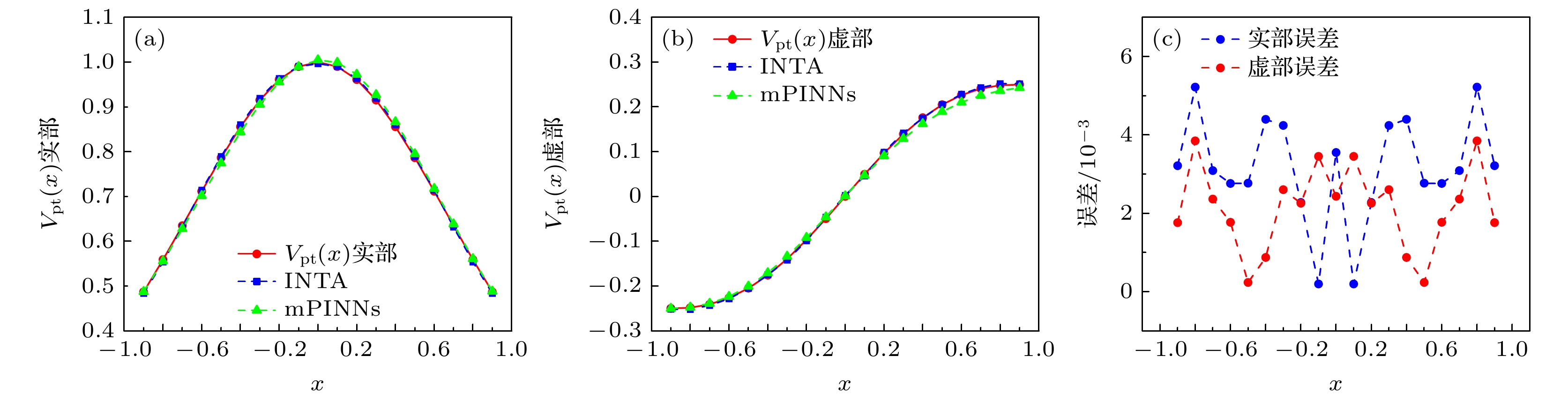 算法 实部误差 虚部误差 运行时间/s INTA $ 6.1768\times10^{-13} $ $ 7.6891\times10^{-12} $ 61.3 mPINNs 0.0416 0.01549 113.8 x $ 0.1 $ $ 0.2 $ $ 0.3 $ $ 0.4 $ $ 0.5 $ $ 0.6 $ $ 0.7 $ $ 0.8 $ $ 0.9 $ INTA实部 $ 6.4\times 10^{-13} $ $ 6.5\times 10^{-13} $ $ 6.1\times 10^{-13} $ $ 6.0\times 10^{-13} $ $ 6.1\times 10^{-13} $ $ 6.4\times 10^{-13} $ $ 7.3\times 10^{-13} $ $ 7.8\times 10^{-13} $ $ 8.0\times 10^{-13} $ mPINNs实部 $ 5.3\times 10^{-3} $ $ 8.8\times 10^{-3} $ $ 8.6\times 10^{-3} $ $ 4.8\times 10^{-3} $ $ 1.5\times 10^{-3} $ $ 8.5\times 10^{-3} $ $ 1.4\times 10^{-2} $ $ 1.6\times 10^{-2} $ $ 1.1\times 10^{-2} $ INTA虚部 $ 1.4\times 10^{-12} $ $ 1.6\times 10^{-12} $ $ 1.3\times 10^{-12} $ $ 7.5\times 10^{-13} $ $ 5.2\times 10^{-13} $ $ 4.7\times 10^{-13} $ $ 6.8\times 10^{-13} $ $ 9.5\times 10^{-13} $ $ 5.5\times 10^{-13} $ mPINNs虚部 $ 1.4\times 10^{-2} $ $ 1.7\times 10^{-3} $ $ 4.0\times 10^{-3} $ $ 2.3\times 10^{-3} $ $ 4.0\times 10^{-3} $ $ 5.3\times 10^{-3} $ $ 6.1\times 10^{-3} $ $ 5.7\times 10^{-3} $ $ 4.3\times 10^{-3} $ 算法 实部误差 虚部误差 运行时间/s INTA 0.0043 0.0126 71.5 mPINNs 0.0098 0.0452 112.3 x 0.1 0.2 0.3 0.4 0.5 0.6 0.7 0.8 0.9 INTA实部 $ 1.9 \times 10^{-4} $ $ 2.3 \times 10^{-3} $ $ 4.23 \times 10^{-3} $ $ 4.43 \times 10^{-3} $ $ 2.83 \times 10^{-3} $ $ 2.8 \times 10^{-3} $ $ 3.13 \times 10^{-3} $ $ 5.23 \times 10^{-3} $ $ 3.23 \times 10^{-3} $ mPINNs实部 $ 8.93 \times 10^{-3} $ $ 1.1 \times 10^{-2} $ $ 1.2 \times 10^{-2} $ $ 1.1 \times 10^{-2} $ $ 8.53 \times 10^{-3} $ $ 5.93 \times 10^{-3} $ $ 3.53 \times 10^{-3} $ $ 1.93 \times 10^{-3} $ $ 1.33 \times 10^{-3} $ INTA虚部 $ 3.53 \times 10^{-3} $ $ 2.33 \times 10^{-3} $ $ 2.63 \times 10^{-3} $ $ 8.7 \times 10^{-4} $ $ 2.3 \times 10^{-4} $ $ 1.83 \times 10^{-3} $ $ 2.43 \times 10^{-3} $ $ 3.83 \times 10^{-3} $ $ 1.83 \times 10^{-3} $ mPINNs虚部 $ 2.43 \times 10^{-3} $ $ 6.23 \times 10^{-3} $ $ 1.0 \times 10^{-2} $ $ 1.6 \times 10^{-2} $ $ 1.6 \times 10^{-2} $ $ 1.6 \times 10^{-2} $ $ 1.5 \times 10^{-2} $ $ 1.23 \times 10^{-2} $ $ 7.13 \times 10^{-3} $ -