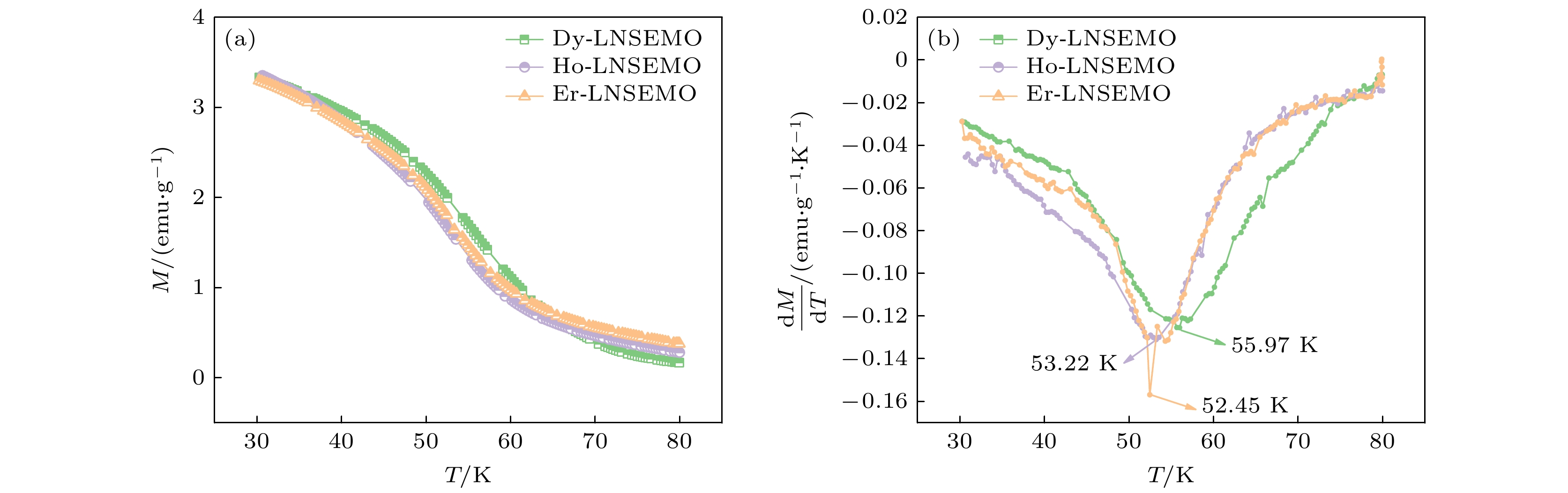 Equimolar ratio high-entropy perovskite ceramics (HEPCs) have attracted much attention due to their excellent magnetization intensity. To further enhance their magnetization intensities, (Ln0.2La0.2Nd0.2Sm0.2Eu0.2)MnO3 (Ln = Dy, Ho and Er, labeled as Ln-LNSEMO) HEPCs are designed based on the configuration entropy Sconfig, tolerance factor t, and mismatch degree σ2. Single-phase HEPCs are synthesized by the solid-phase method in this work, in which the effects of the heavy rare-earth elements Dy, Ho and Er on the structure and magnetic properties of Ln-LNSEMO are systematically studied. The results show that all Ln-LNSEMO HEPCs exhibit high crystallinity and maintain excellent structural stability after sintering at 1250 ℃ for 16 h. Ln-LNSEMO HEPCs exhibit significant lattice distortion effects, with smooth surface morphology, clearly distinguishable grain boundaries, and irregular polygonal shapes. In the present work, the influences of A-site average ion radius, grain size and lattice distortion on the magnetic interactions of Ln-LNSEMO HEPCs are investigated. The three high-entropy ceramic samples exhibit hysteresis behavior at T = 5 K, with the Curie temperature TC decreasing as the radius of the introduced rare-earth ions decreases, while the saturation magnetization and coercivity increase accordingly. When the average ionic radius of A-site decreases, the interaction between their valence electrons and local electrons in the crystal increases, thereby enhancing the conversion of electrons to oriented magnetic moments under an external magnetic field. Thus, Er-LNSEMO HEPC shows a higher saturation magnetization strength (42.8 emu/g) and coercivity (2.09 kOe) than the other samples, which is attributed to the strong magnetic crystal anisotropy, larger lattice distortion σ2 (6.52×10–3), smaller average grain size (440.49 ± 22.02 nm), unit cell volume (229.432 Å3) and A-site average ion radius (1.24 Å) of its magnet. The Er-LNSEMO HEPC has potential applications in magnetic recording materials.