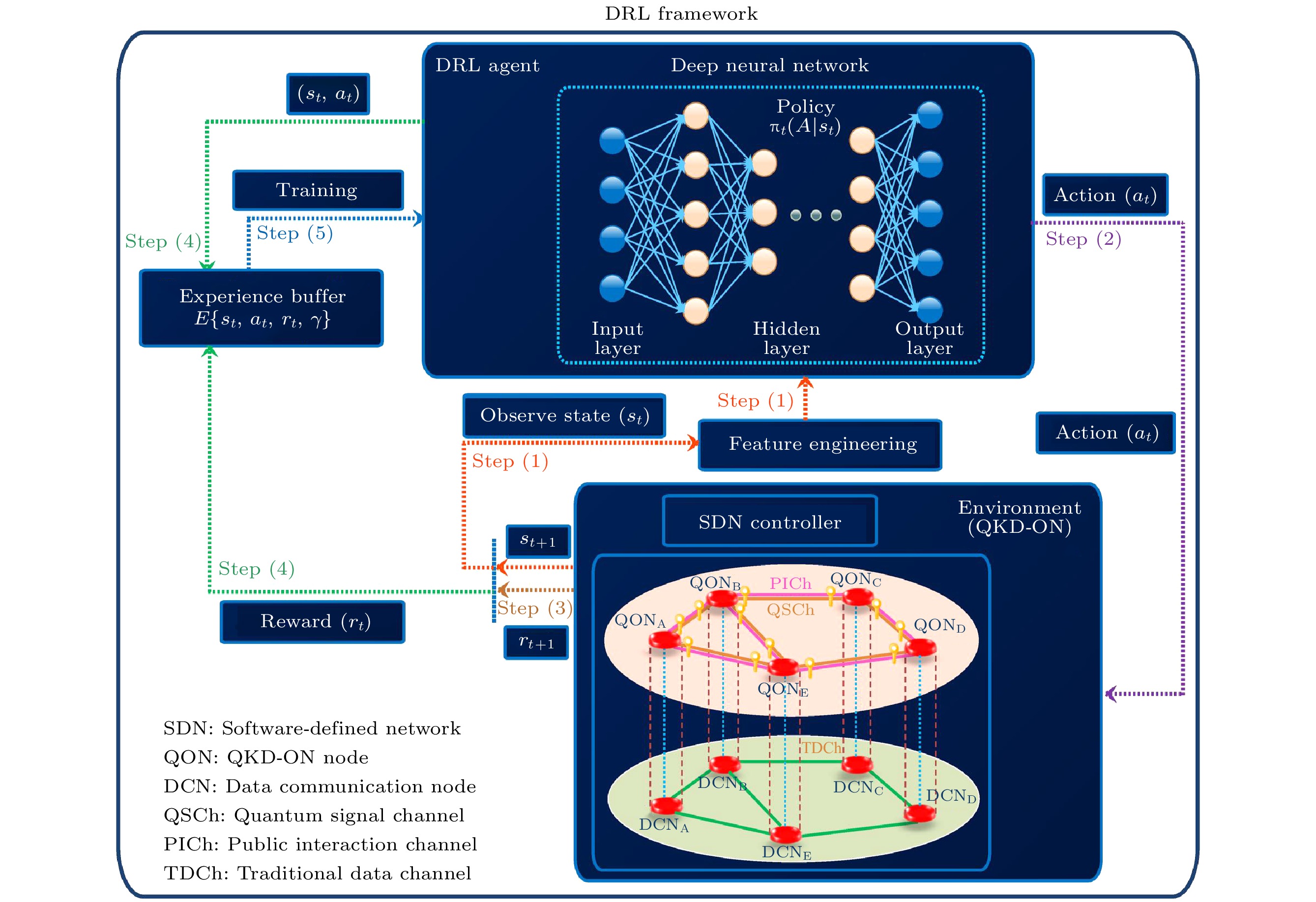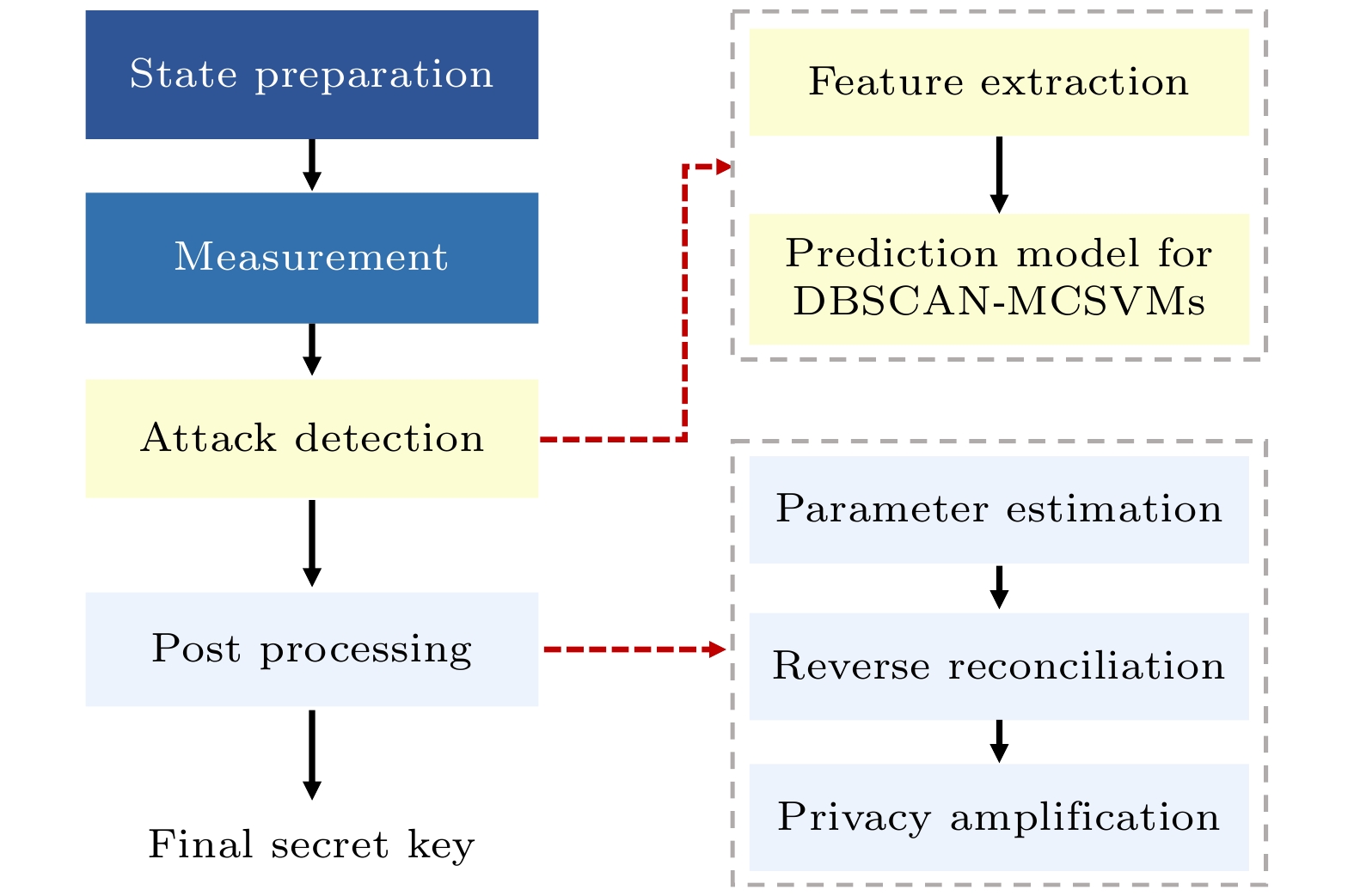 应用领域 方法 主要贡献 参考文献 参数优化 随机森林 预测MDI-QKD和BB84-QKD协议的最优参数 [24] 参数优化 神经网络 直接预测QKD系统最优参数 [25] 参数优化 极端梯度提升 预测TF-QKD的优化参数, 效率和准确性优于RF和BPNN [27] 参数优化和系统校准 反向传播神经网络 预测系统最优参数, 同时通过仿真对MDI-QKD系统进行相位校准 [26] 协议选择和参数优化 随机森林 首次将机器学习方法应用于QKD系统实现最优协议选择与系统参数优化 [28] 相位校准 长短记忆网络 预测设备物理参数, 实时进行BB84-QKD系统的相位校准 [29] 相位校准 长短记忆网络 预测MDI-QKD系统中两个用户的相位漂移, 实时主动补偿 [30] 相位校准 长短记忆网络 预测TF-QKD系统相位漂移, 实现主动反馈控制 [31] 设备缺陷和攻击检测 随机森林 实时检测设备缺陷和攻击, 准确率高达98% [32] 应用领域 方法 主要贡献 参考文献 参数优化 支持向量回归 预测系统物理参数, 优化QKD系统性能和安全性 [33] 参数优化 反向传播神经网络 调整调制方差, 确保系统安全, 有效地提高了密钥率 [34] 参数优化 机器学习框架 控制相位噪声, 优化调制方差, 实现100 km光纤通道上的密钥分发 [40] 密钥率预测 多标签分类算法 通过多标签分类算法区分相干态, 优于现有离散调制CV-QKD协议 [35] 密钥率预测 神经网络 快速预测离散调制CV-QKD协议的密钥率, 速度和准确性优于传统数值方法 [36,37] 攻击检测 人工神经网络 自动识别和分类攻击类型, 准确率和召回率超过99% [38] 攻击检测 密度聚类和多类支持向量机 高效检测量子黑客攻击, 修正密钥率高估问题, 提供更紧致的安全边界 [39] 应用领域 方法 主要贡献 参考文献 量子传感器
