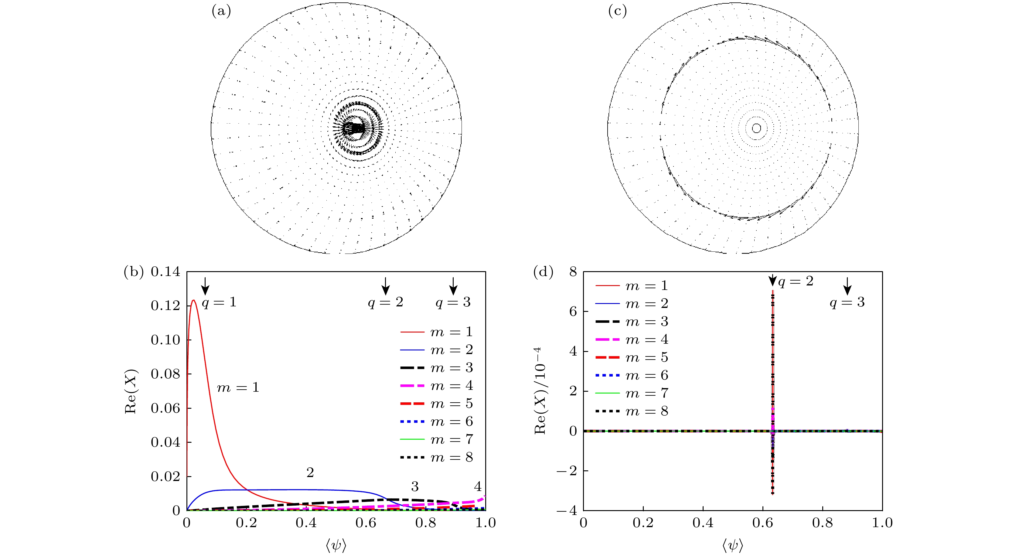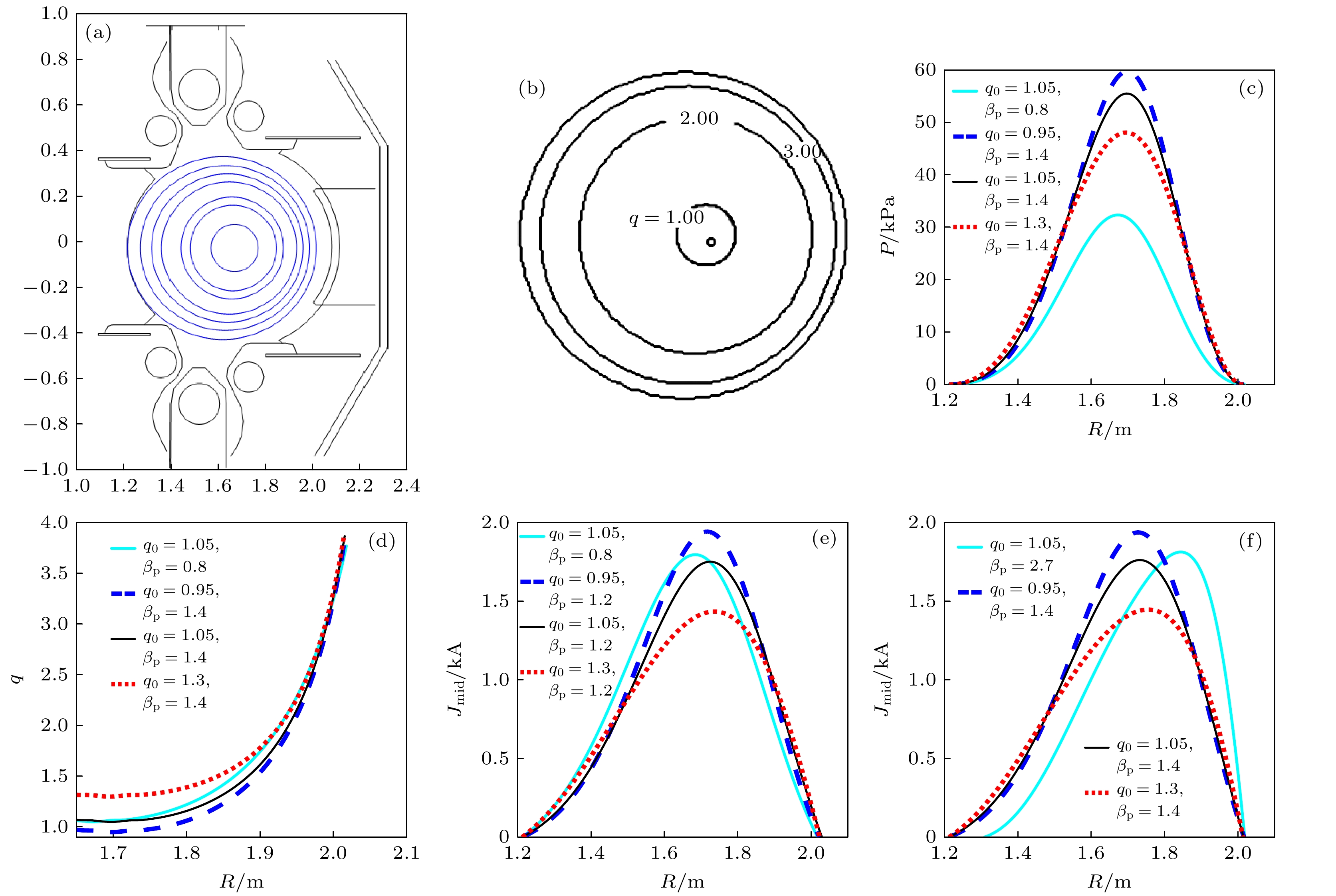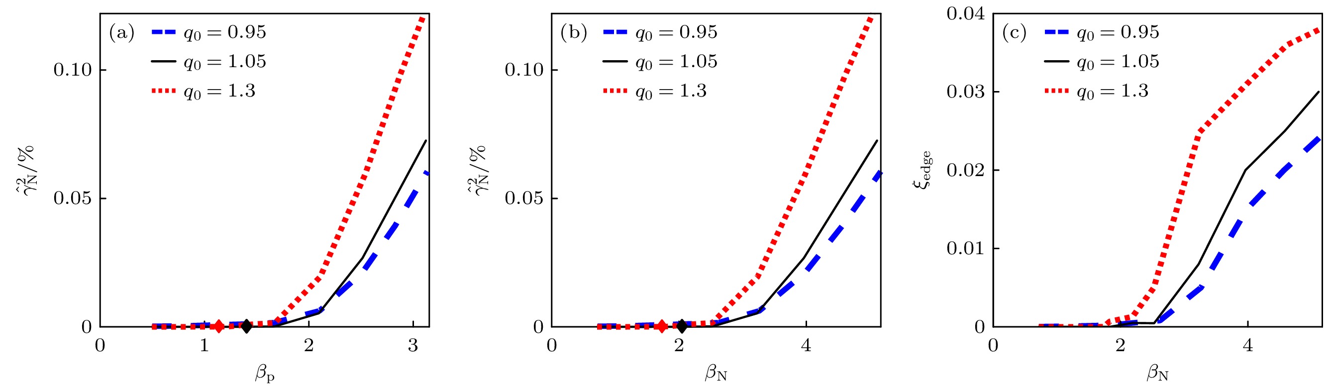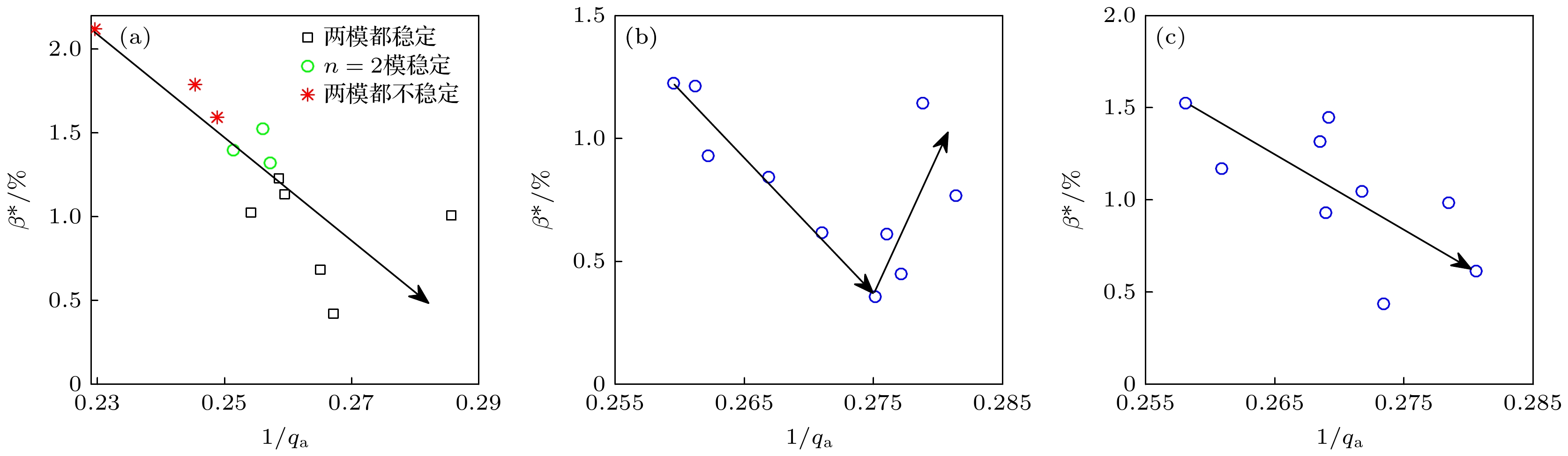 圆形截面等离子体是最基本的托卡马克等离子体形态, 是磁约束聚变实验研究的基础位形. 本文基于HL-2A装置限制器位形放电实验, 研究了托卡马克圆形截面等离子磁流体动力学(MHD)平衡和MHD不稳定性. 研究表明, 当$ {q}_{0}=0.95 $时, $ m/n=1/1 $内扭曲模总是不稳定的. 轴安全因子$ {q}_{0} $和边缘安全因子$ {q}_{{\mathrm{a}}} $的组合决定了等离子体的平衡位形, 也影响着平衡的MHD稳定性, 但其不稳定性增长率与比压($ \beta $)的大小相关联. 在$ {q}_{{\mathrm{a}}} > 2 $和$ {q}_{0} $稍大于1的条件下, 可以容易实现内扭曲模和表面扭曲模的稳定. 但当$ {q}_{0} $超过1较多时, 等离子体又变得不稳定, 且等离子体(扭曲)不稳定性强度随$ {q}_{0} $的继续增高而增强. 随着极向比压($ {\beta }_{{\mathrm{p}}} $)的增加, MHD不稳定性会增强, MHD平衡位形横向拉长, Shafranov位移增加, 这反过来又有抑制不稳定性的作用. 计算发现, HL-2A圆形截面等离子体的运行比压极限约为$ {\beta }_{{\mathrm{N}}}^{{\mathrm{c}}}\cong 2.0. $ 较高的$ {q}_{0} $不利于MHD稳定性, 引起比压极限降低. 当$ {q}_{0}=1.3 $时, 得到最大$ {\beta }_{{\mathrm{N}}}\approx 1.8 $. 最后, 基于现有的圆形横截面等离子体, 讨论了影响运行$ \beta $的一些关键因素以及可期实现的高比压和理想比压极限之间的关系问题.Circular cross-section plasma is the most basic form of tokamak plasma and the fundamental configuration for magnetic confinement fusion experiments. Based on the HL-2A limiter discharge experiments, the magnetohydrodynamic (MHD) equilibrium and MHD instability of circular cross-section tokamak plasmas are investigated in this work. The results show that when $ {q}_{0}=0.95 $, the internal kink mode of $ m/n=1/1 $ is always unstable. The increase in plasma $ \beta $ (the ratio of thermal pressure to magnetic pressure) can lead to the appearance of external kink modes. The combination of axial safety factor $ {q}_{0} $ and edge safety factor $ {q}_{{\mathrm{a}}} $ determines the equilibrium configuration of the plasma and also affects the MHD stability of the equilibrium, but its growth rate is also related to the size of $ \beta $. Under the condition of $ {q}_{{\mathrm{a}}} > 2 $ and $ {q}_{0} $ slightly greater than 1, the internal kink mode and surface kink mode can be easily stabilized. However the plasma becomes unstable again and the instability intensity increases as $ {q}_{0} $ continues to increase when $ {q}_{0} $ exceeds $ 1 $. As the poloidal specific pressure ($ {\beta }_{{\mathrm{p}}} $) increases, the MHD instability develops, the equilibrium configuration of MHD elongates laterally, and the Shafranov displacement increases, which in turn has the effect on suppressing instability. Calculations have shown that the maximum $ \beta $ value imposed by the ideal MHD mode in a plasma with free boundary in tokamak experiments is proportional to the normalized current $ {I}_{{\mathrm{N}}} $ ($ {I}_{{\mathrm{N}}}={I}_{{\mathrm{p}}}\left({\mathrm{M}}{\mathrm{A}}\right)/a\left({\mathrm{m}}\right){B}_{0}\left({\mathrm{T}}\right) $), and the maximum specific pressure $ \beta \left({\mathrm{m}}{\mathrm{a}}{\mathrm{x}}\right) $ is calibrated to be $ ~2.01{I}_{{\mathrm{N}}},{\mathrm{ }}{\mathrm{i}}. {\mathrm{e}}. $ $ \beta \left({\mathrm{m}}{\mathrm{a}}{\mathrm{x}}\right)\sim 2.01{I}_{{\mathrm{N}}} $. The operational $ \beta $ limit of HL-2A circular cross-section plasma is approximately $ {\beta }_{{\mathrm{N}}}^{{\mathrm{c}}}\approx 2.0 $. Too high a value of $ {q}_{0} $ is not conducive to MHD stability and leads the $ \beta $ limit value to decrease. When $ {q}_{0}=1.3 $, we obtain a maximum value of $ {\beta }_{{\mathrm{N}}} $ of approximately $ 1.8 $. Finally, based on the existing circular cross-section plasma, some key factors affecting the operational $ \beta $ and the relationship between the achievable high $ \beta $ limit and the calculated ideal $ \beta $ limit are discussed.