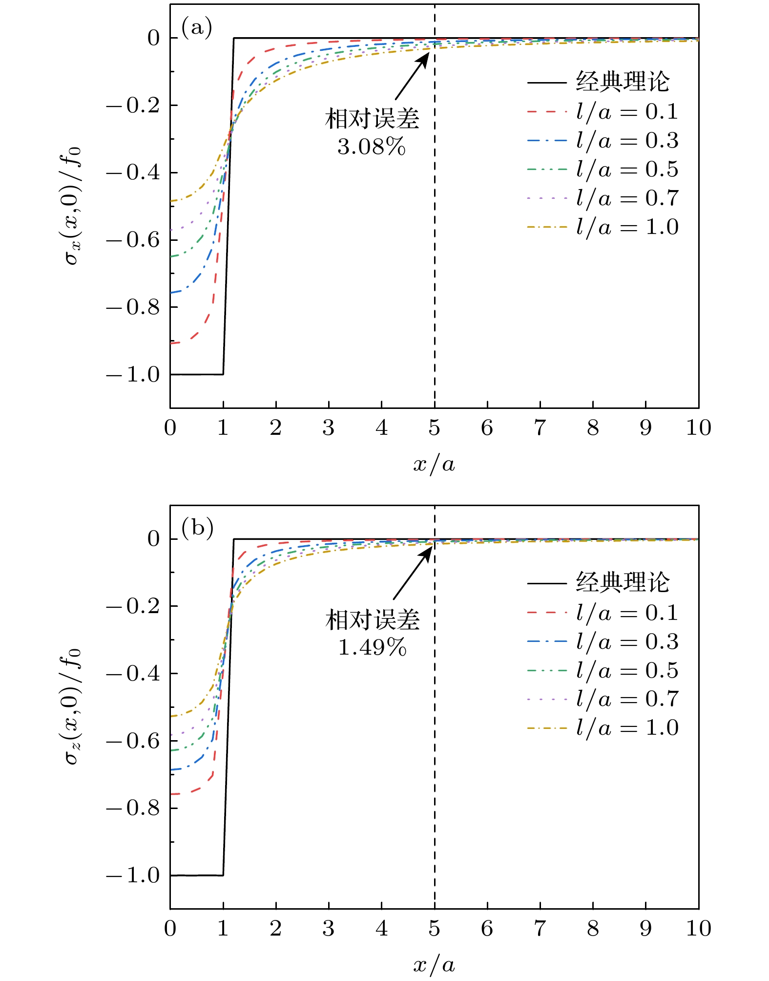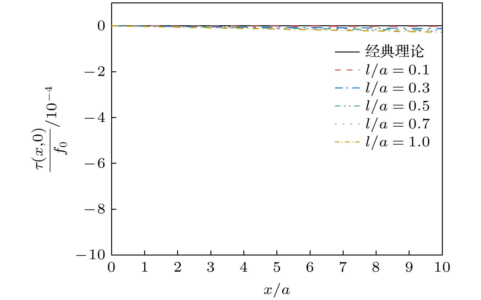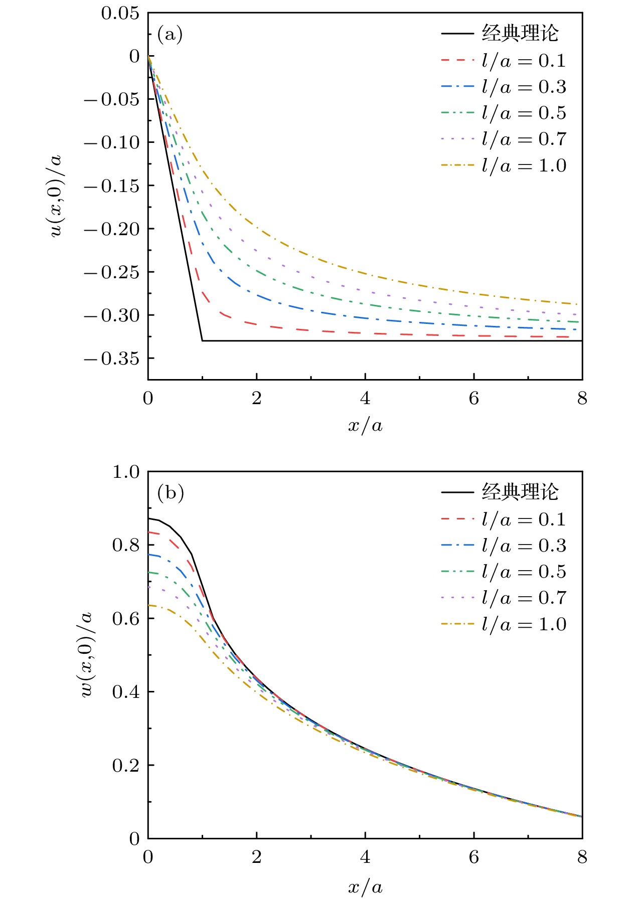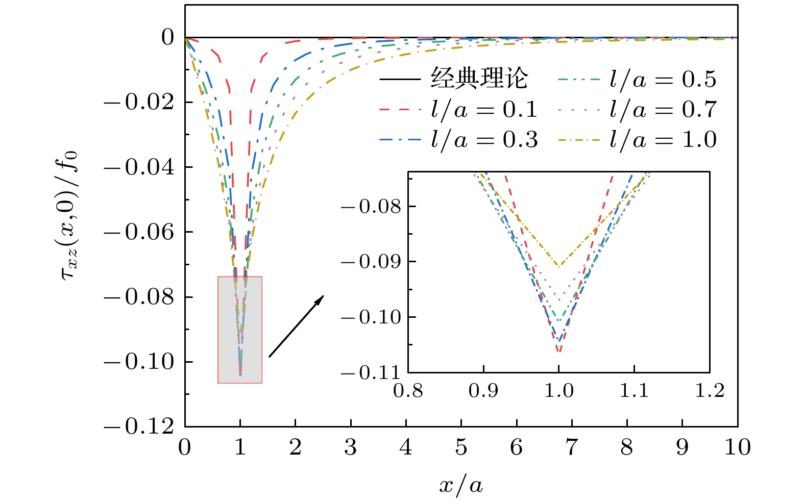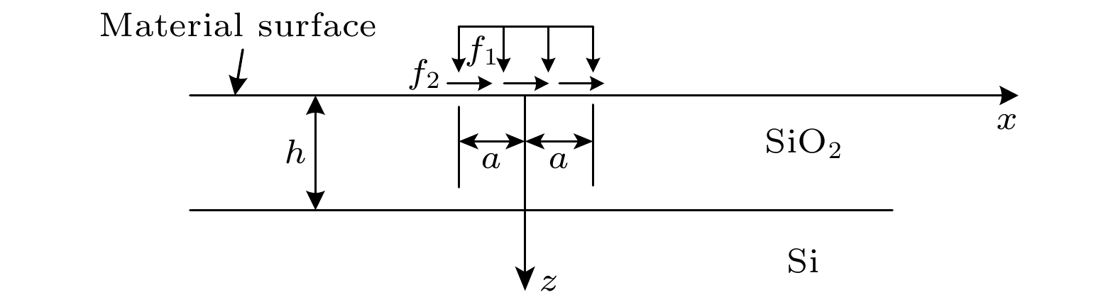 随着微纳声学器件的快速发展, 其核心声学结构已进入纳米尺度范畴, 表面效应对薄膜材料性能的影响日益凸显, 经典弹性理论面临挑战. 本文基于表面弹性理论, 引入表面能密度研究纳米尺度下的表面效应, 采用傅里叶积分变换法推导出纳米尺度SiO2/Si异质结构薄膜表面牵引力下应力场与位移场的解析表达式. 结果显示, 若以表面应力分布与经典理论相差3%作为判断标准, 在激励区域宽度2a的5倍范围内, 材料的微观特性彰显主导地位. 随着激励区域不断减小, 在激励区域内及边界附近表面应力分布较经典理论更加集中, 剪切应力于边界处有极大值, 材料表面刚度与抗变形能力增加, 横向与纵向位移较经典理论减小. 纳米尺度异质结构存在显著表面效应, 导致应力和位移分布明显偏离弹性理论, 经典弹性假设在相应纳米尺度范围不再适用. 以上结果表明, 在纳米尺度固体表面中, 超高频纳米波长声波传播将明显受到尺度效应影响, 经典弹性波理论在纳米尺度存在失效现象, 这对纳米声学理论研究具有参考价值.The rapid advancement of micro-nano acoustic devices has led their core acoustic structures to shrink to the nanoscale level. The influence of surface effects on the mechanical properties of thin-film materials on a nanoscale becomes increasingly prominent, and the classical elasticity theory struggles to accurately describe their mechanical behavior on this scale. In this paper, a mechanical model of nano-SiO2/Si heterostructured thin films that considers surface effects is developed using surface elasticity theory. This model incorporates the key parameter of surface energy density. In this paper, a mechanical model of heterostructured nano-SiO2/Si films is developed using the surface elasticity theory, incorporating surface effects through the introduction of surface energy density as a key parameter. Using the Fourier integral transform method, analytical expressions for stress and displacement fields under surface traction are systematically derived, revealing the influence of surface effects on the mechanical behavior of materials on a nanoscale by comparing the analytical solution with that from the classical theory. The results show that when the surface stress distribution deviates by 3% from that predicted by the classical theory, the microscopic properties of the material become significant, and the surface effect cannot be ignored in a range of five times the width of the excitation region 2a. As the size of the excitation region decreases, the surface effect is significantly increases and the stress distribution within the excitation region and near the boundary becomes more concentrated than the counterparts in the classical theory. The shear stress is no longer zero, and an extreme value is observed at the boundary, which is significantly different from that predicted by the classical theory of elasticity. The transverse and longitudinal displacements are reduced compared with those from the classical theory, and the surface stiffness and deformation resistance of the material are greatly enhanced. Significant surface effects occur on nano-heterostructure thin films, leading to large deviations in stress and displacement distributions from the results of elasticity theory. Therefore, the classical elasticity assumptions are no longer applicable in the corresponding nanoscale range. The results demonstrate that the propagation of ultrahigh-frequency nano- length acoustic waves in nanoscale solid film surfaces is significantly affected by the scale effect. The failure of the classical elastic wave theory on a nanoscale is of great value for the study of nanoscale acoustic theory. Furthermore, these findings provide a theoretical basis for the subsequent development of more precise models of interfacial effects and a more detailed investigation of the influence of the film-substrate modulus ratio.
