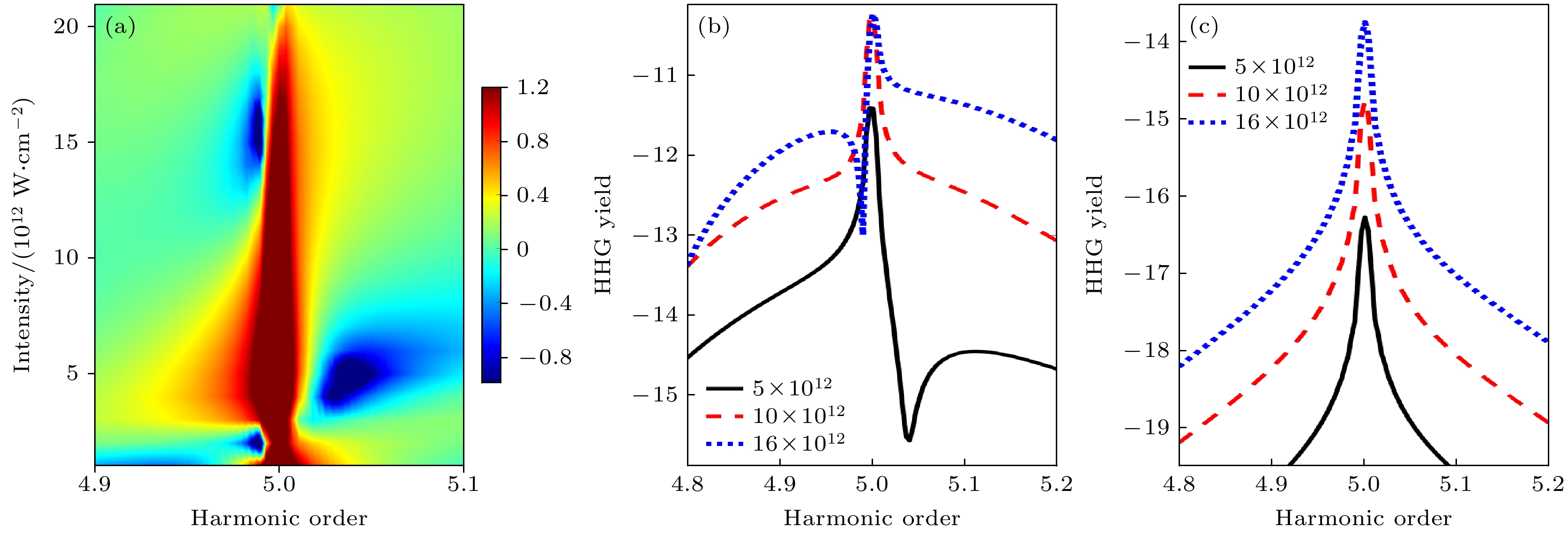 We numerically solved the time-dependent Schrödinger equation (TDSE) for a hydrogen atom interacting with intense near-infrared laser fields to investigate the mechanism of below-threshold high-harmonic generation (HHG). The primary focus was on understanding the spectral features, particularly resonant structures, arising in the fifth harmonic region under specific driving conditions. Our simulations utilized a laser wavelength of 608 nm. At this wavelength, hydrogen atoms can resonantly absorb five photons, promoting electrons from the ground stateWe numerically solved the time-dependent Schrödinger equation (TDSE) for a hydrogen atom interacting with intense near-infrared laser fields to investigate the mechanism of below-threshold high-harmonic generation (HHG). The primary focus was on understanding the spectral features, particularly resonant structures, arising in the fifth harmonic region under specific driving conditions. Our simulations utilized a laser wavelength of 608 nm. At this wavelength, hydrogen atoms can resonantly absorb five photons, promoting electrons from the ground state $\left|1{\mathrm{s}}\right\rangle$ to the excited state $\left|2{\mathrm{p}}\right\rangle$. Concurrently, the atom can absorb additional photons leading to ionization. Crucially, due to the AC Stark shift induced by the intense laser field (laser dressing), some laser-dressed continuum states $\left|{\mathrm{c}}\right\rangle$ become energetically degenerate with the laser-dressed $\left|2{\mathrm{p}}\right\rangle$ state. High-harmonic radiation at the fifth harmonic frequency can then be emitted via two distinct quantum paths: 1) Bound-bound recombination: Direct recombination from the laser-dressed $\left|2{\mathrm{p}}\right\rangle$ state back to the ground state $\left|1{\mathrm{s}}\right\rangle$. 2) Continuum-bound recombination: recombination from the laser-dressed continuum states $\left|{\mathrm{c}}\right\rangle$ (reached via ionization) back to $\left|1{\mathrm{s}}\right\rangle$. Both pathways emit photons of identical energy corresponding to the fifth harmonic. Our important finding is that there is significant quantum interference between these two recombination channels. This interference is manifested in the spectrum as an asymmetric Fano lineshape of the fifth harmonic intensity profile. Furthermore, we demonstrate that the shape of this Fano resonance exhibits strong and controllable dependence on the intensity of the driving laser field. This study provides clear evidence that Fano quantum interference, typically associated with multi-electron correlations or autoionizing states in complex systems, can emerge in the fundamental single-electron hydrogen atom system under the condition of intense laser field. The interference arises directly from the coherent superposition of the bound-bound and continuum-bound recombination pathways caused by laser-induced degeneracy. Importantly, by adjusting the laser intensity the spectral profile of the Fano resonance can be actively manipulated, providing a novel method for coherently controlling the harmonic emission in simple atomic systems.