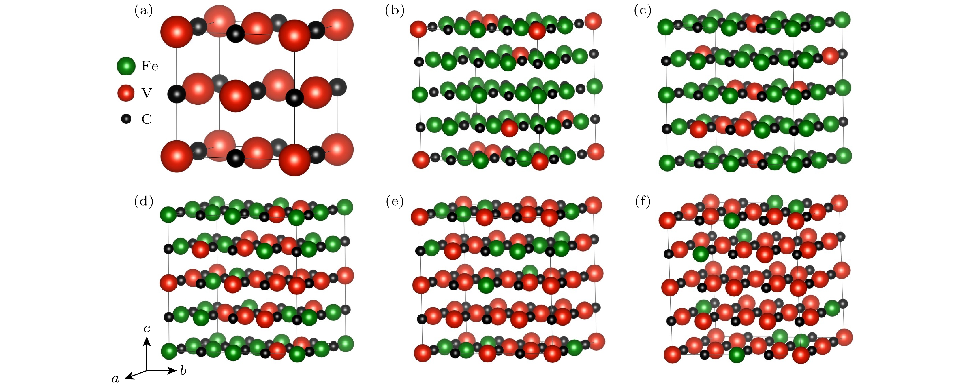 钒碳化物通常作为金属材料的增强相, 其弹性和延展-脆性特性对于力学性能至关重要. 本研究基于特殊准随机结构(SQS)方法和第一性原理计算系统探讨了多组分V1–x FexC系碳化物的稳定性、电子结构、机械性能和热性质随元素Fe含量变化的规律. 研究结果表明, 5种组分(V0.125Fe0.875C, V0.25Fe0.75C, V0.5Fe0.5C, V0.75Fe0.25C和V0.875Fe0.125C)随着元素Fe含量的减小稳定性提高, V1–x FexC系碳化物键合类型以共价键、金属键和离子键的混合特征为主. 相较于V1–x FexC系其他碳化物, V0.875Fe0.125C由于具有高的共价键强度, 因此表现出高的弹性模量和硬度, 元素Fe的掺杂引入显著影响V1–x FexC碳化物的晶格振动模式和电子结构, V0.875Fe0.125C碳化物较高的德拜温度, 同样印证了其高温下优异的机械强度. 此外, 热导率的计算不仅指导V1–x FexC系碳化物的实验选择, 同时为开发高性能耐高温涂层提供重要的理论支持.