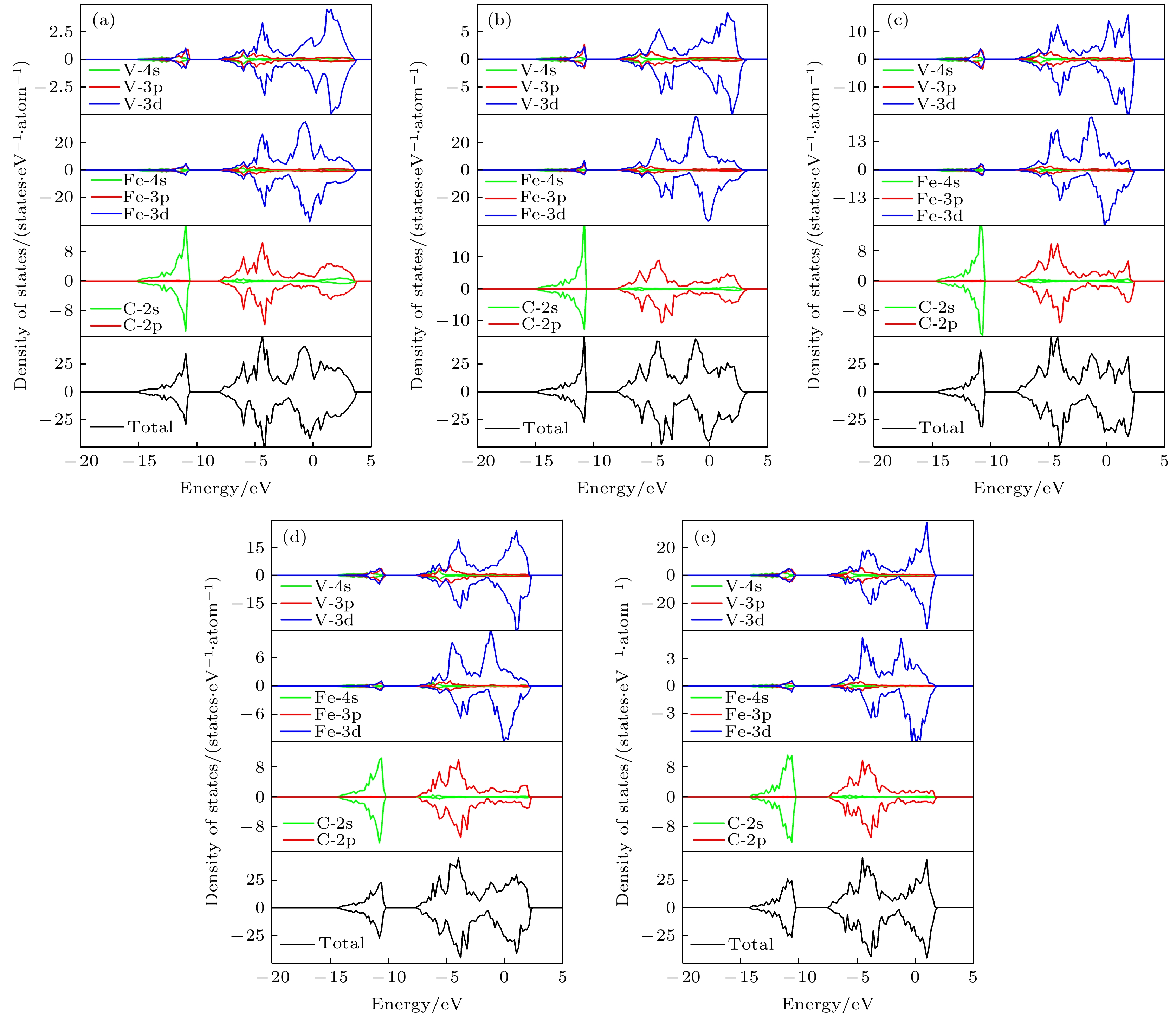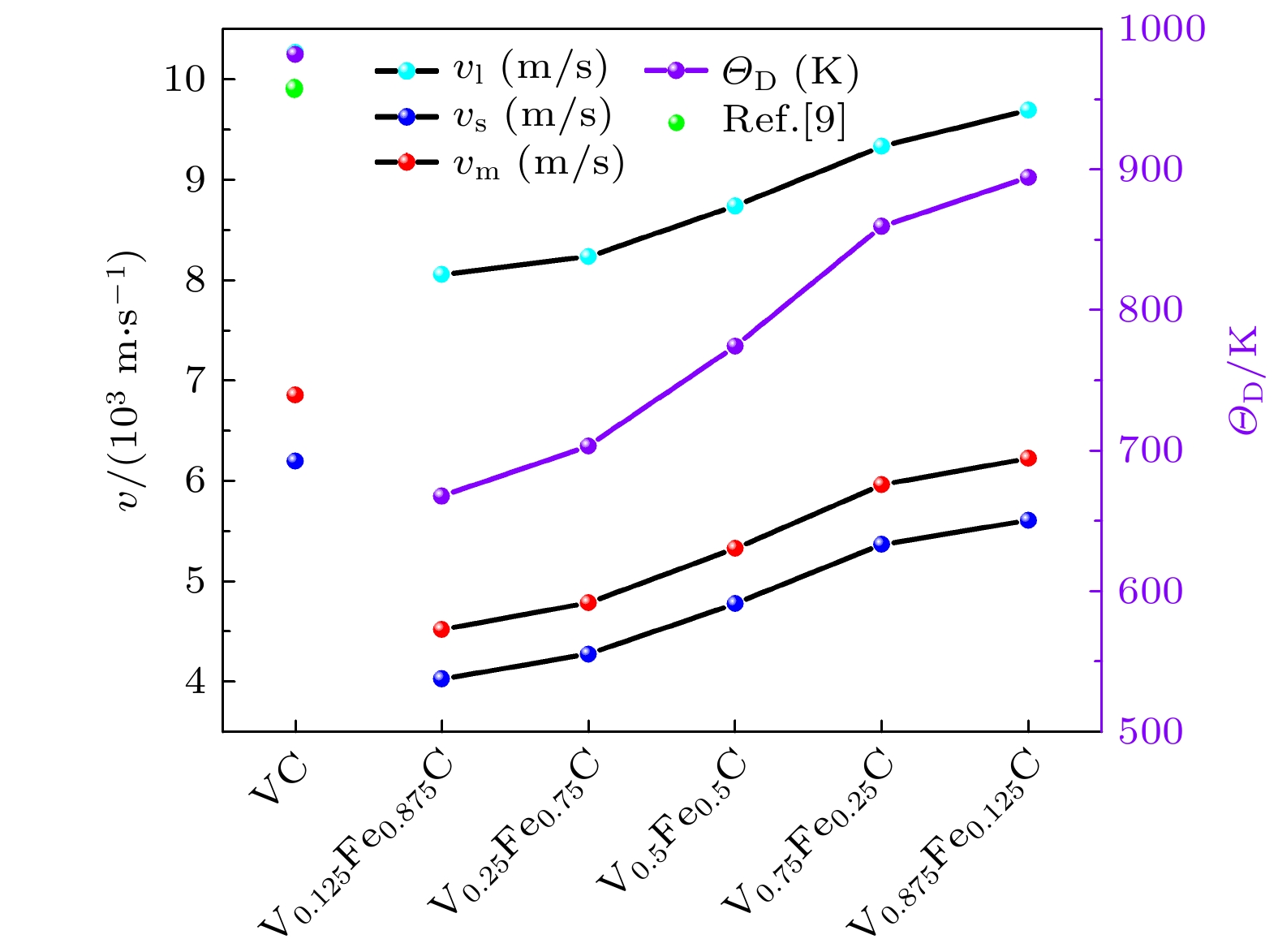 元素 原子百分比/% 质量分数/% C 4.47 1.04 Fe 60.96 66.11 V 27.35 27.06 Cr 1.16 1.17 Mn 2.29 2.44 Other elements 3.77 2.18 a/Å b/Å c/Å $\alpha $/(°) $\beta $/(°) γ/(°) ΔHf/( meV·atom–1) fm Bader V0.125Fe0.875C 8.061 8.065 8.063 90.08 89.99 89.95 0.443 0.548 0.840 V0.25Fe0.75C 8.106 8.107 8.107 90.00 90.00 90.01 0.321 0.622 0.914 V0.5Fe0.5C 8.203 8.188 8.195 90.00 90.00 90.00 0.042 0.844 1.052 V0.75Fe0.25C 8.262 8.261 8.258 89.92 90.08 89.99 –0.230 0.971 1.146 V0.875Fe0.125C 8.287 8.287 8.288 89.93 90.00 89.97 –0.439 1.19 1.213 碳化物 C11/GPa C12/GPa C44/GPa BH/GPa GH/GPa BH/GH E $\nu $ HV/GPa KIC/(MPa·m1/2) Mx/μm–1/2 VC 668.78 138.75 200.00 315.43 223.89 1.41 543.15 0.345 28.73 3.83 648.24[24] 156.88[24] 209.99[24] 318[9] 213[9] 1.49[9] 521[9] 0.356[9] 25.8[9] V0.125Fe0.875C 552.84 165.68 75.32 294.40 110.79 2.657 442.11 0.333 8.49 2.564 3.310 V0.25Fe0.75C 553.84 155.42 86.486 288.10 121.67 2.368 319.96 0.315 10.34 2.665 3.878 V0.5Fe0.5C 563.87 152.52 113.41 289.61 144.23 2.008 371.09 0.286 14.06 2.925 4.808 V0.75Fe0.25C 584.01 148.76 149.97 293.96 174.39 1.686 436.80 0.252 19.63 3.254 6.034 V0.875Fe0.125C 615.80 154.92 162.02 308.46 186.60 1.650 465.87 0.248 21.06 3.450 6.104 V0.125Fe0.875C V0.25Fe0.75C V0.5Fe0.5C V0.75Fe0.25C V0.875Fe0.125C [100] [100]vl 9003.42 9126.02 9446.38 9820.16 10182.71 [010]vs1 3323.25 3606.30 4236.44 4976.31 5223.03 [001]vs2 3323.25 3606.30 4236.44 4976.31 5223.03 [110] [110]vl 7982.57 8144.52 8639.03 9233.81 9600.33 $[1{\bar 1}0] $vs1 5327.68 5473.24 5705.14 5994.67 6229.07 [001]vs2 3323.25 3606.30 4236.44 4976.31 5223.03 [111] [111]vl 7611.92 7789.92 8352.592 9029.91 9398.19 $ [11{\bar 2}] $vs1 4754.38 4930.12 5261.33 5675.55 5912.77 $[11{\bar 2}] $vs2 4754.38 4930.12 5261.33 5675.55 5912.77 碳化物 γ Aγ /(10–8) V $\delta $/Å Mav/(kg·mol–1) n kph(300)/(W·m–1·K–1) kph(1300)/(W·m–¹·K–1) kmin/(W·m–1·K–1) V0.125Fe0.875C 1.996 3.039 524.18 2.016 22.413 64 2.139 0.535 1.536 V0.25Fe0.75C 1.869 3.075 532.81 2.027 22.208 64 2.873 0.718 1.609 V0.5Fe0.5C 1.692 3.132 550.38 2.049 21.800 64 4.729 1.182 1.752 V0.75Fe0.25C 1.511 3.199 563.61 2.065 21.392 64 8.183 2.046 1.929 V0.875Fe0.125C 1.492 3.206 569.15 2.072 21.188 64 9.427 2.357 2.001 -