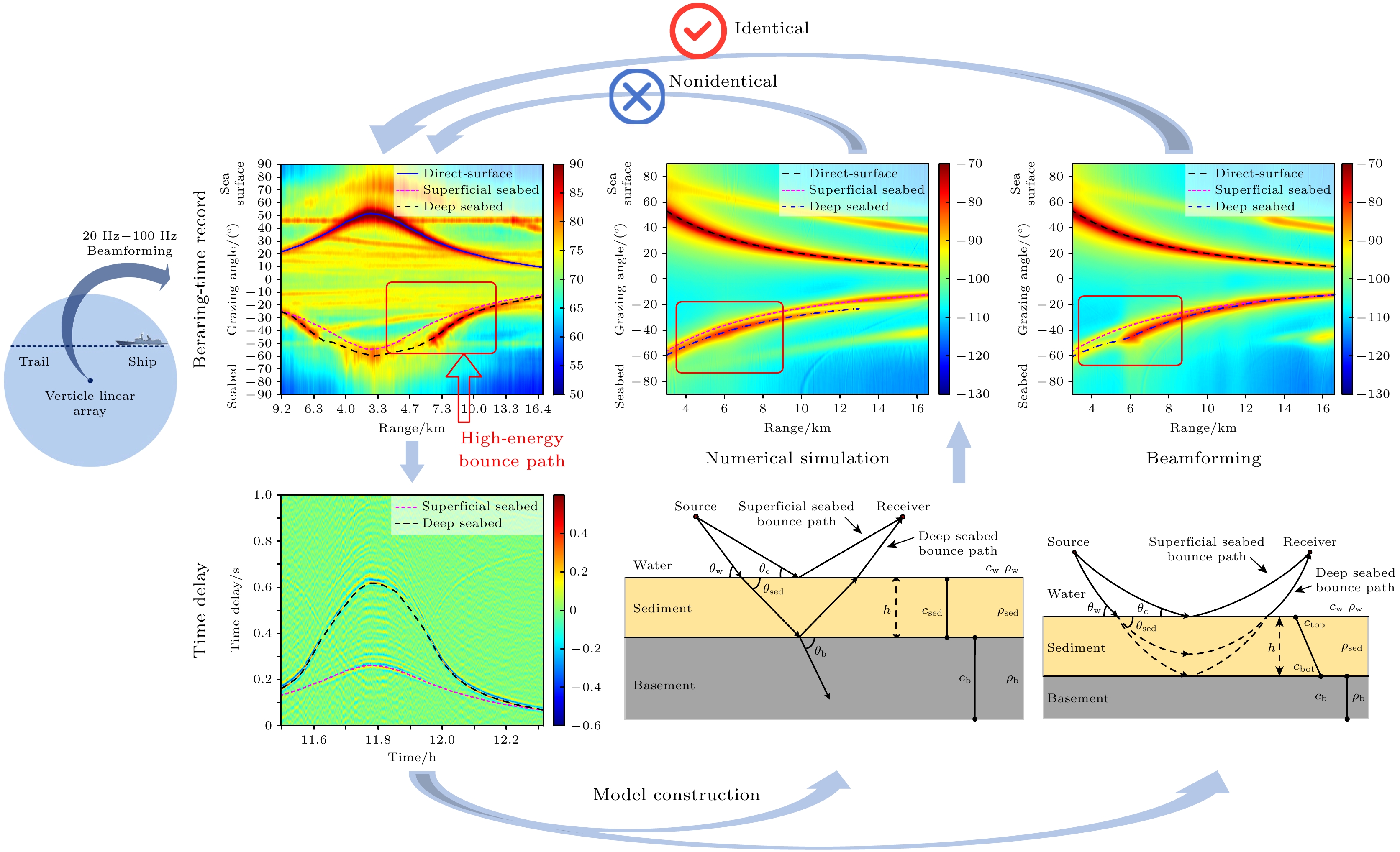 Very-low-frequency (VLF) (≤100 Hz) acoustic waves exhibit special propagation characteristics in the deep sea, owing to strong penetration capability and interaction with deep geological structures. In a deep sea experiment conducted in the South China Sea, a vertical linear array including 64 elements is moored to the bottom (approximately 4360 m depth) to receive the acoustic signal. In the bearing-time record (BTR) processed by beamforming, a high-energy bottom bounce path is observed from the ship noise received by the bottom-moored vertical linear array, which shows an abrupt increase in energy near a grazing angle of 45°. However, the physical mechanism causing this phenomenon is still unclear, and we investigate it further in this work. According to the data processing, we develop an environmental model of the seabed by combining continuous speed gradient, which arises from long-term geological compaction processes, in the sediment. This model is compared with a traditional stratified model under the assumption of a uniform sediment layer. The wavenumber integration method is adopted in numerical simulation to accurately calculate the pressure field and analyze the cross-media propagation. The numerical simulations show that the positive velocity gradient (increasing from 1600 m/s to 2144 m/s) causes an ‘acoustic turning’ effect, which reradiates substantial acoustic energy back into the water column and generates the observed high-energy bounce paths. This is supported by theoretical analysis in the WKB approximation, where the calculated reflection coefficient shows a sharp transition in the acoustic turning point, explaining the energy fluctuations observed in the experimental BTR. Further analysis shows that the thickness of sediment influences the angular separation between bottom bounce paths, while its sound speed structure determines the turning angle. These findings offer new insights into VLF acoustic propagation in the deep sea and also provide critical evidence for supporting a transition from simplified stratified models to a more realistic model with a continuous gradient structure. Furthermore, the discovery of high-energy bottom bounce paths provides a new way for enhancing the capabilities of underwater detection, and these observed features also provide reliable pressure field characteristics for inverting deep seabed parameters.
