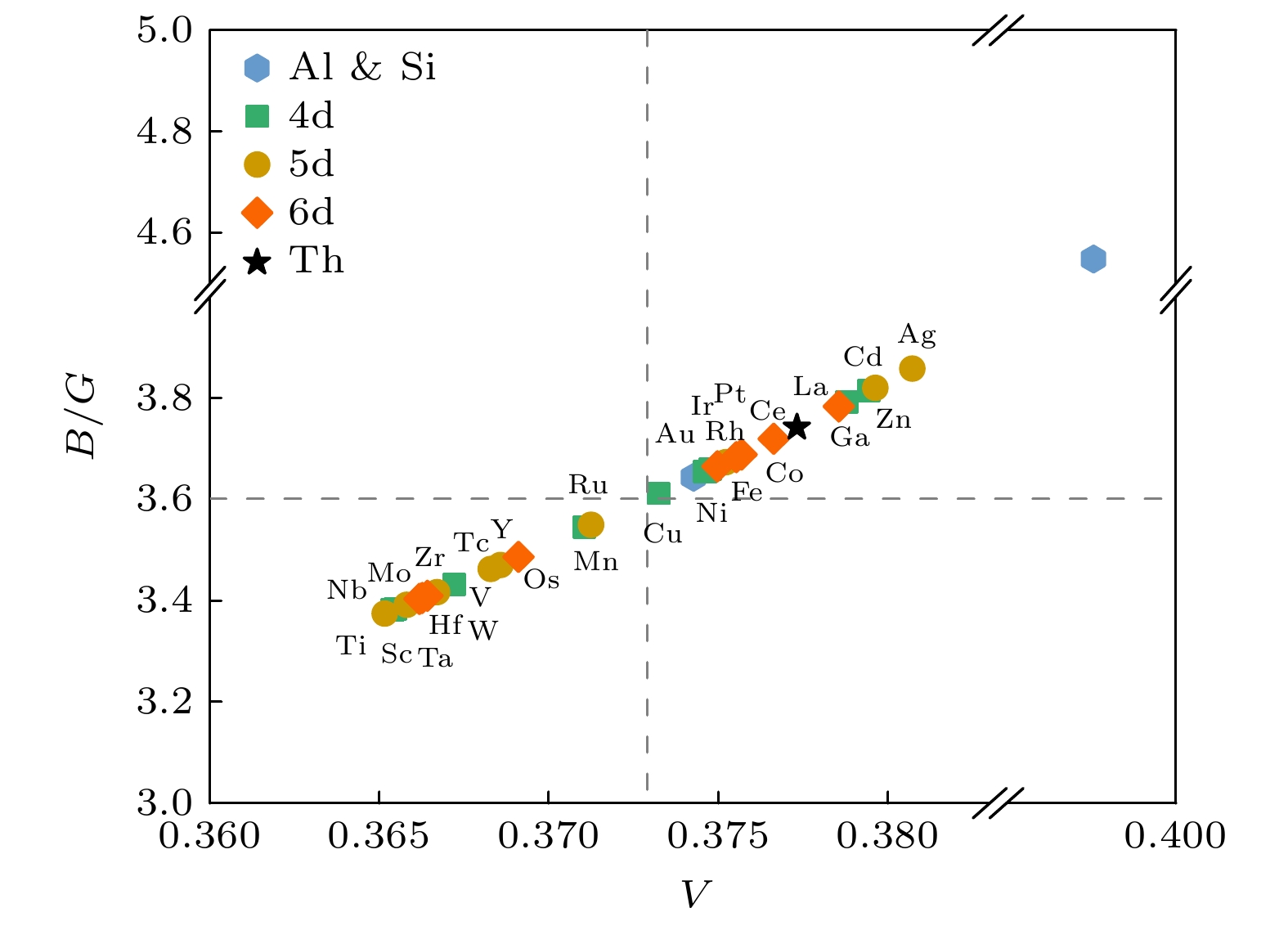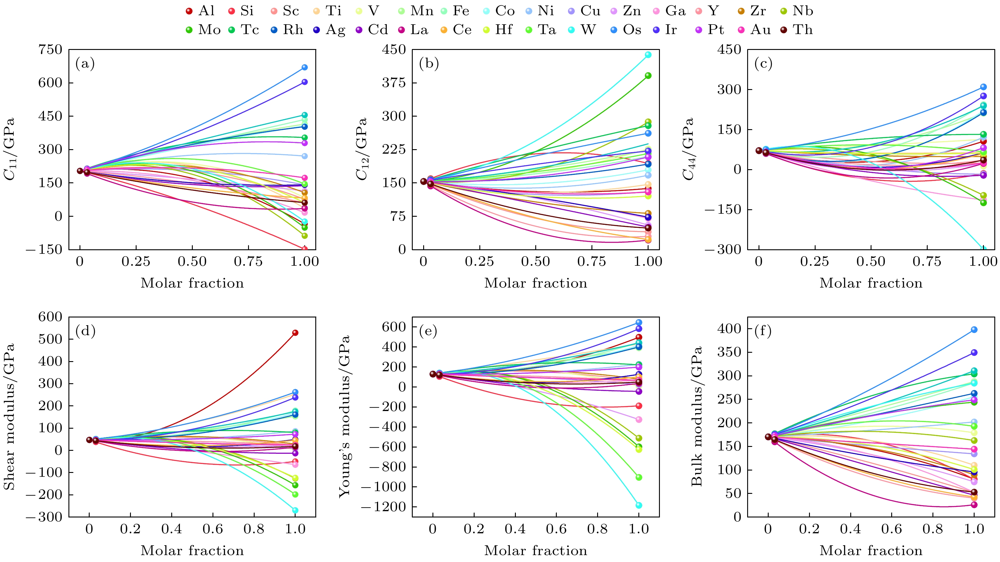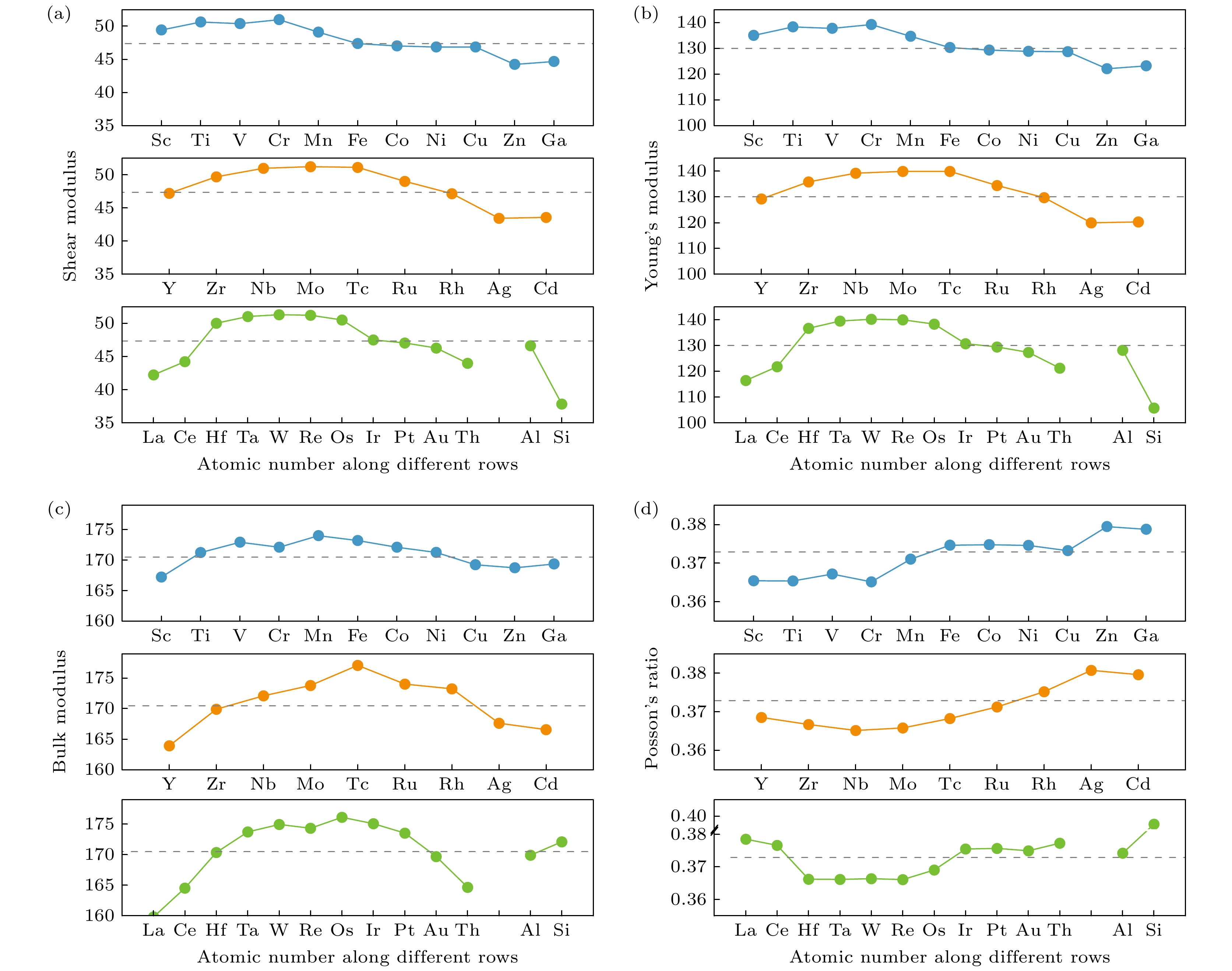 • 钯(Pd)合金较低的摩擦系数和较好的力学性能使得其在用于长时间稳定工作的高精度仪器仪表中具备潜在优势, 但是因为高昂的原料和实验成本导致基础数据缺乏, 无法进行高性能Pd合金的设计. 因此, 本研究利用第一性原理计算了Pd的晶格常数和弹性模量, 并建立Pd与Al, Si, Sc, Ti, V, Cr, Mn, Fe, Co, Ni等33种合金元素形成的稀固溶体模型, 计算了混合焓、弹性常数和弹性模量. 研究结果表明, 除Mn, Fe, Co, Ni, Ru, Rh, Os和Ir外, 其他合金元素都可以固溶到Pd中, 元素周期表两侧的合金元素能提高Pd固溶体的延展性, 其中La, Ag和Zn的作用最明显. 通过差分电荷密度分析, Ag掺杂后形成的电子云呈球形分布, 造成延展性提高, Hf掺杂后周围的离域程度最大, 表明Hf与Pd的键合存在较强的离子性, 导致Pd31Hf硬度较高. 本文数据集可在https://www.doi.org/10.57760/sciencedb.j00213.00186中访问获取.