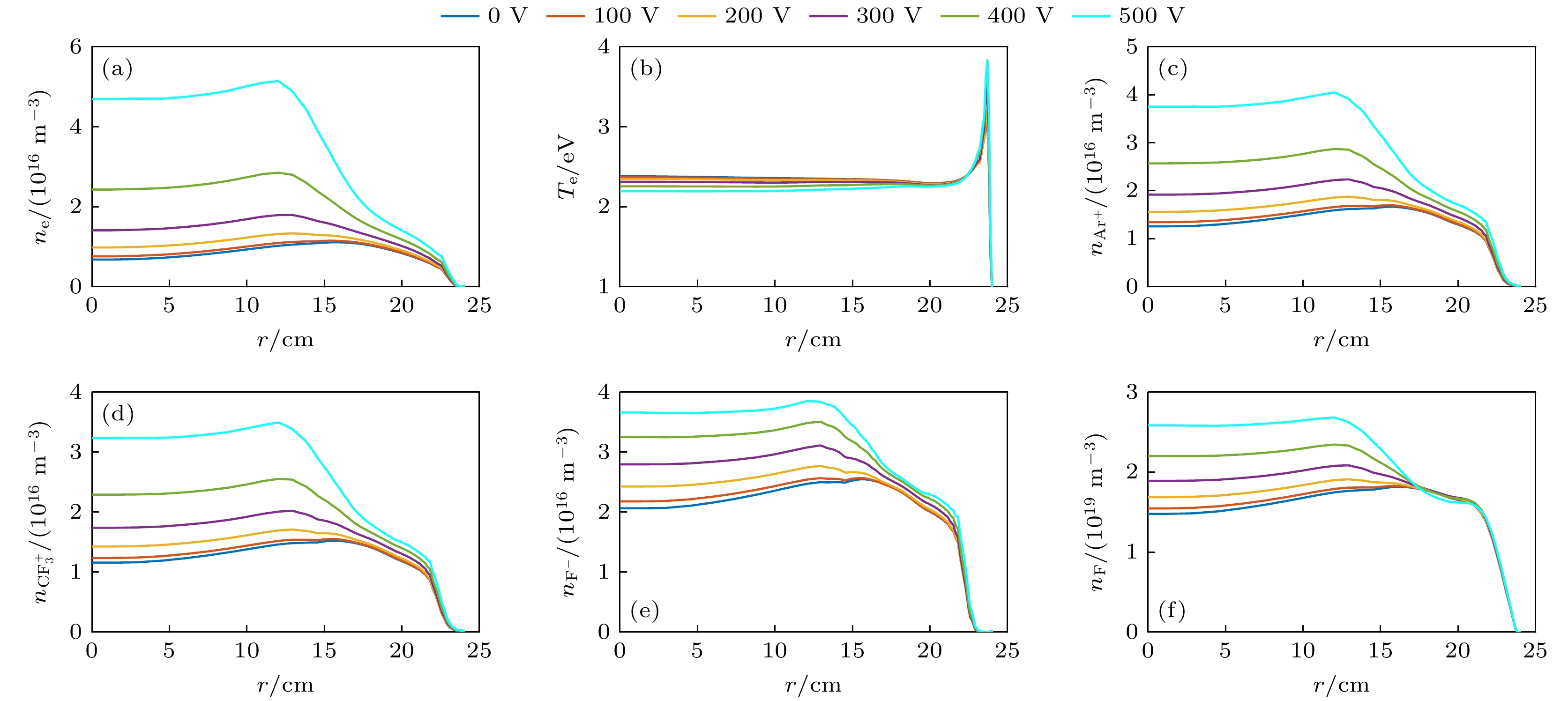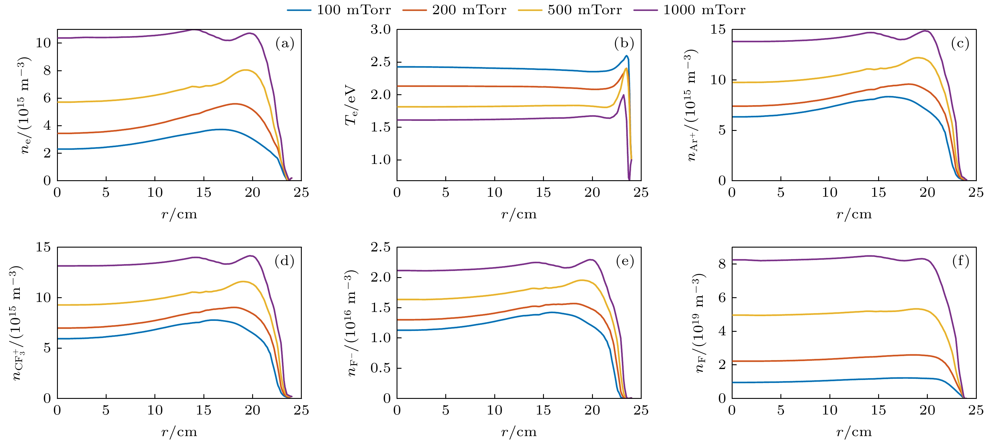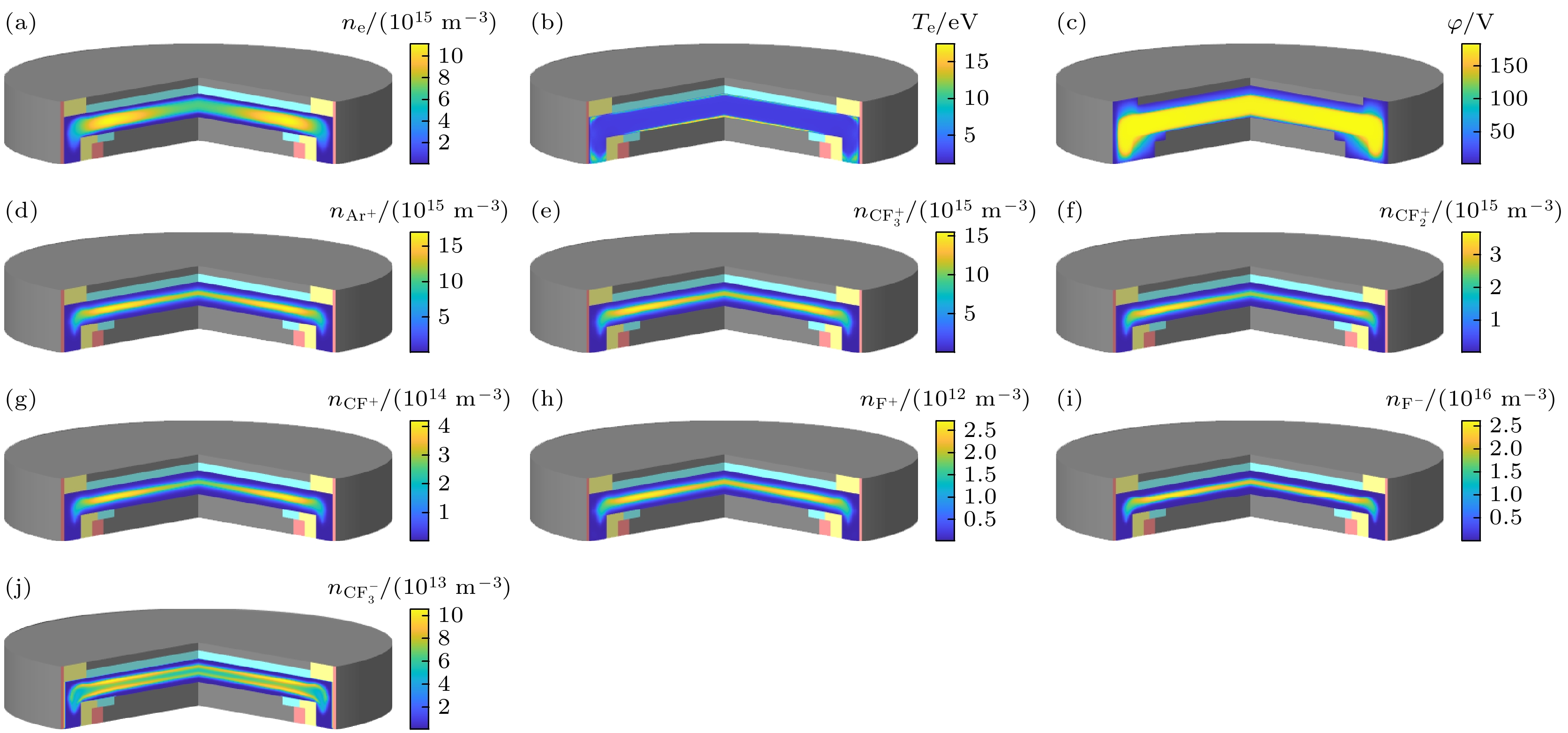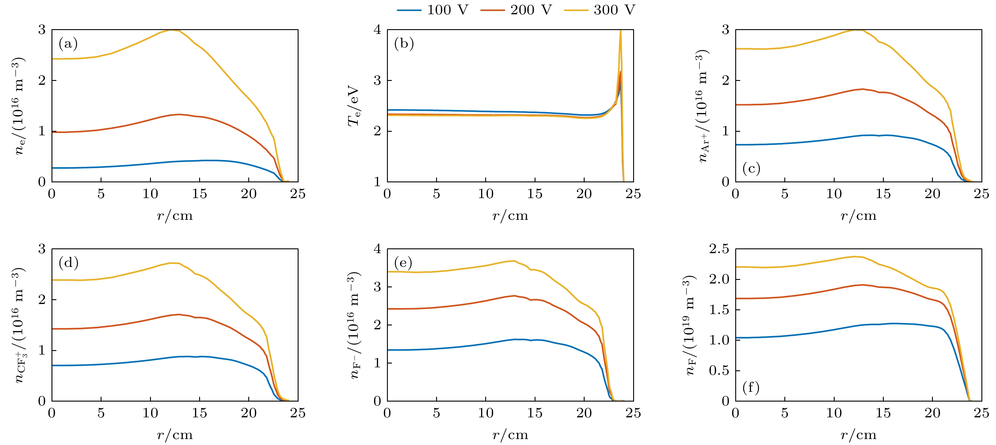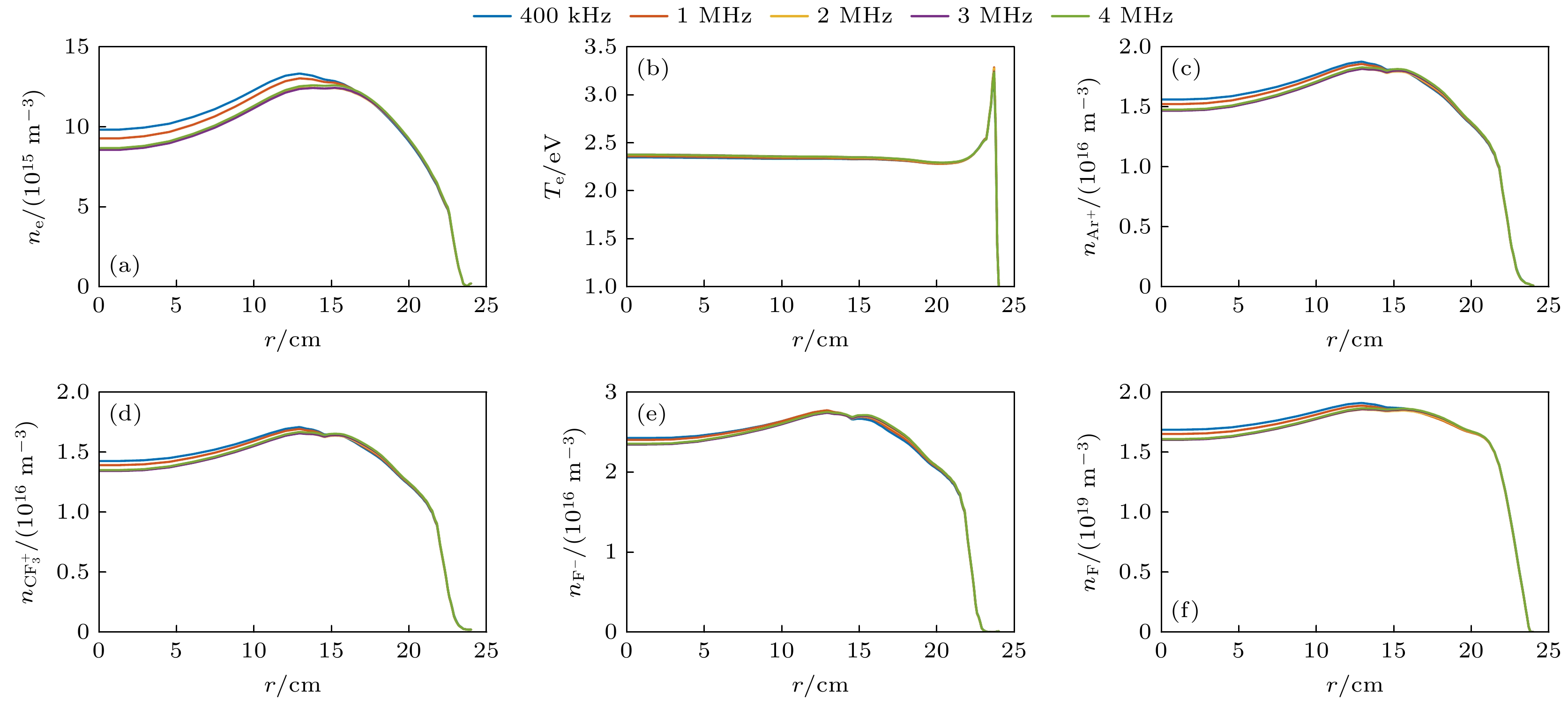 容性耦合等离子体源具备结构、造价低、能产生大面积均匀等离子体的优点, 被广泛应用于半导体芯片制造的刻蚀、沉积等工艺中. 为了满足先进生产工艺的需求, 人们常常需要对等离子体源实施流体模拟, 从而对等离子体的密度、均匀性等重要参数进行优化. 本文采用自主研发的容性耦合等离子体快速模拟程序对双频容性耦合Ar/CF4等离子体源进行了三维流体模拟, 以对程序在该问题中的有效性进行初步验证, 并研究气压、高低频电压、低频频率、气体组分比例等放电参数对等离子体产生的影响. 模拟结果显示, 该程序具有极高的模拟速度; 随着低频电压的增加, 等离子体密度先近似不变, 后显著增大, 而等离子体的均匀性先上升, 后显著下降, 在此过程中低频电源带来的γ模式加热逐渐增加, 直到取代高频电源的α模式加热成为主导; 随着低频频率的增加, 等离子体密度先近似不变, 后略微增大, 而等离子体的均匀性变化不大, 这是因为低频电源的γ模式加热与频率无关, 而α模式加热远远低于高频电源; 随着高频电压的增加, 等离子体密度显著增大, 而等离子体的均匀性先上升, 后显著下降, 在此过程中高频电源的α模式加热显著增强; 随着气压的增加, 等离子体密度明显增大, 同时等离子体的均匀性也明显上升, 原因是粒子与背景气体间碰撞更为充分; 随着背景气体中Ar比例的增加, 等离子体密度变化较小, Ar相关粒子的密度总体呈上升趋势, CF4相关粒子的密度总体呈下降趋势, 但部分粒子的密度变化存在非单调的情况, 这体现了部分组分的电离、解离间具有相互促进的作用.Capacitively coupled plasma sources, which are widely used in the etching and deposition processes of semiconductor manufacturing, have the advantages of simple structure, low cost, and the ability to generate large-area uniform plasma. To meet the requirements of advanced processes, fluid models are usually required to simulate plasma sources and optimize their important plasma parameters, such as density and uniformity. In this work, an independently-developed capacitively coupled plasma fast simulation program is employed to conduct three-dimensional fluid simulations of a dual-frequency capacitively coupled Ar/CF4 plasma source, with the aims of verifying the effectiveness of the program and investigating the influence of discharge parameters such as gas pressure, high and low-frequency voltages, low frequency, and background component ratios. The simulation results show that the program has an extremely high simulation speed. As the low-frequency voltage increases, the plasma density initially remains approximately constant and then significantly increases, while the plasma uniformity initially rises and then significantly decreases. In this process, the γ-mode heating of the low-frequency source increases and becomes the dominant mode in replace of the α-mode of high-frequency source. As the lower frequency increases, plasma density initially remains approximately constant and then slightly increases, while the plasma uniformity does not change much. this is because the γ-mode heating is frequency independent, while the α-mode heating is much lower than high-frequency source. As the high-frequency voltage increases, the plasma density significantly increases, while the plasma uniformity initially rises and then significantly decreases, the α-mode heating of high-frequency source is significantly enhanced in this process. As the pressure increases, the plasma density significantly increases, and the plasma uniformity also rises significantly, the reason is the more complete collision between particles and background gases. As the Ar ratio in background gases increases, the plasma density changes slightly, the density of Ar-related particles generally increases and the density of CF4-related particles generally decreases, although there are some non-monotonic changes in particle densities, which reflects the mutual promotion between some ionization and dissociation reactions.