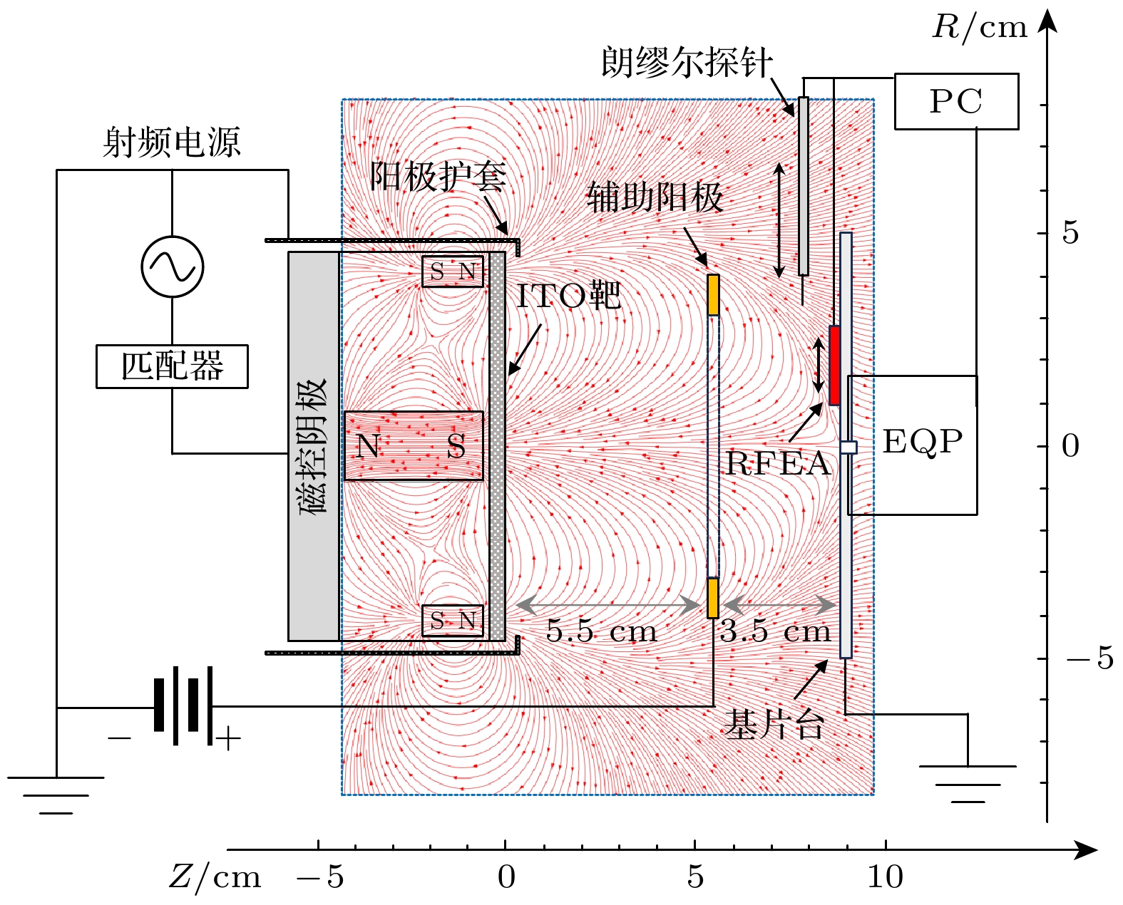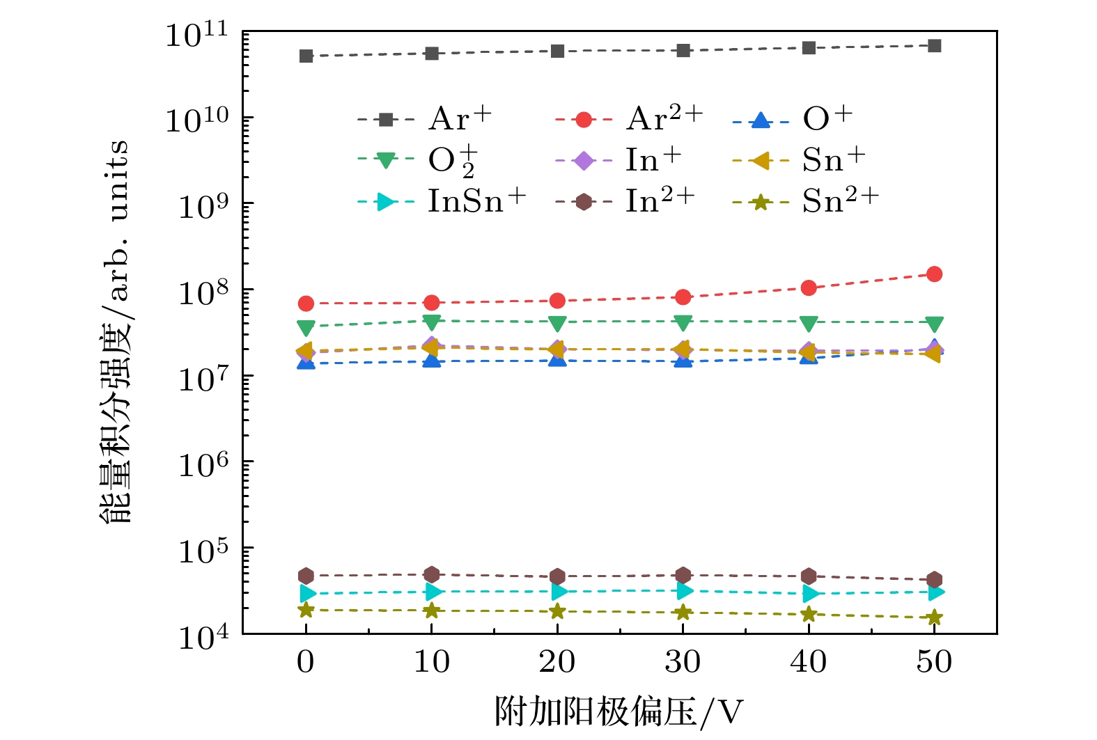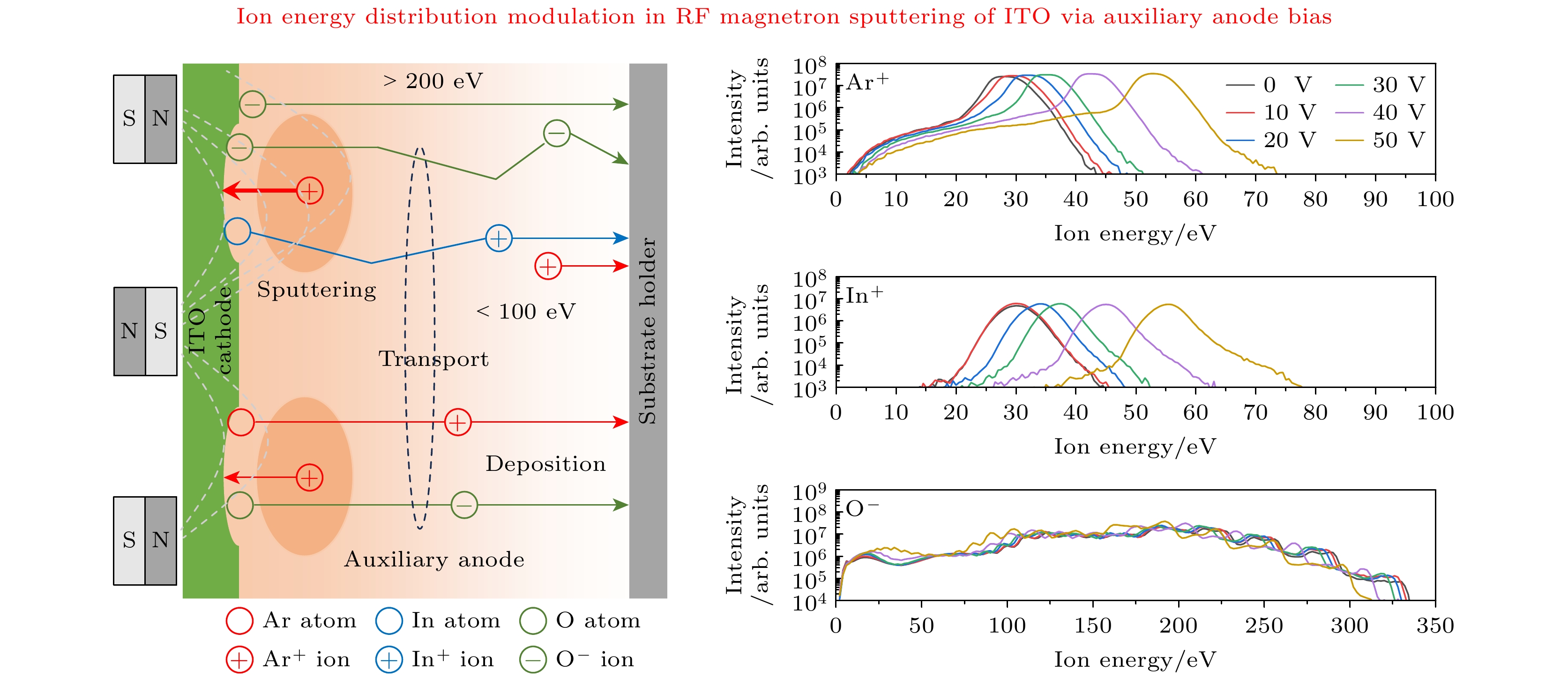 Ion energy distribution modulation in radio frequency magnetron sputtering of indium tin oxide via auxiliary anode bias