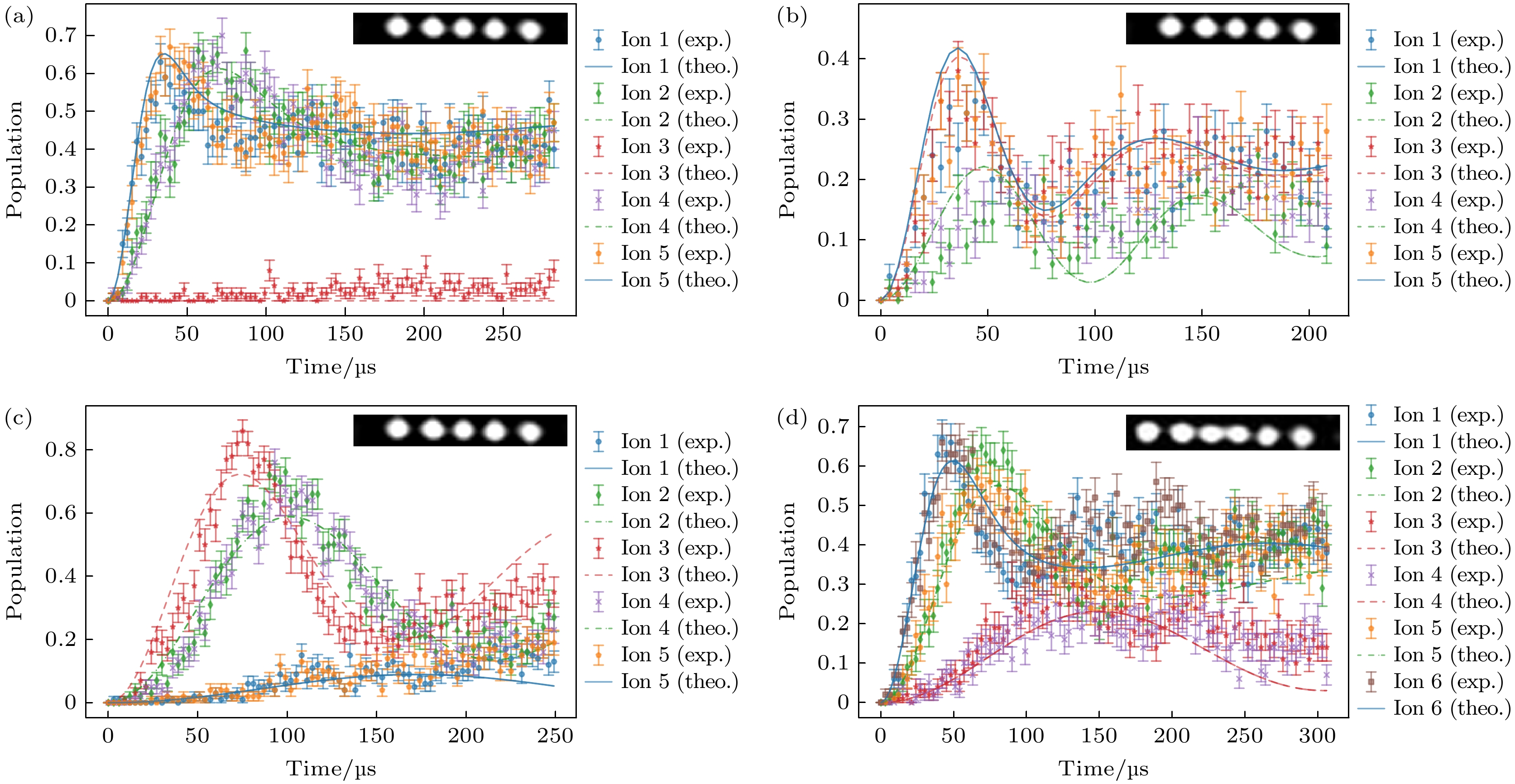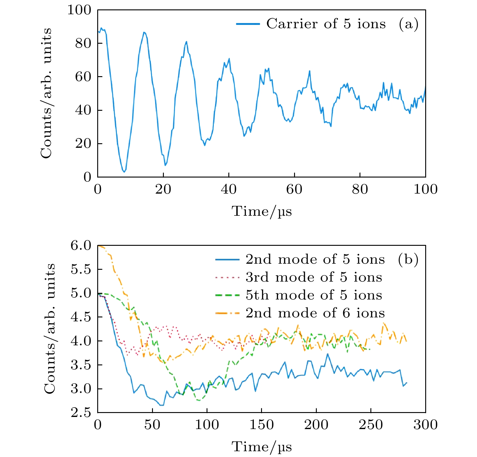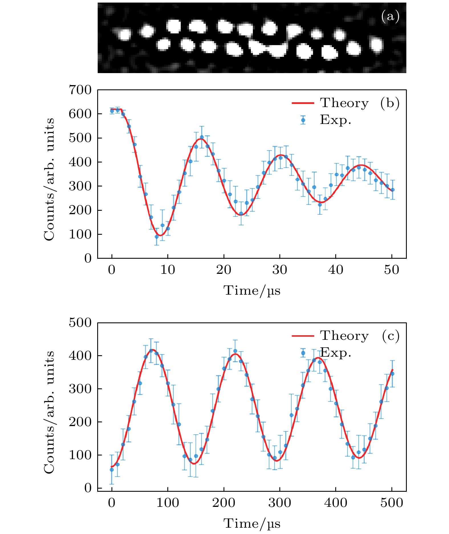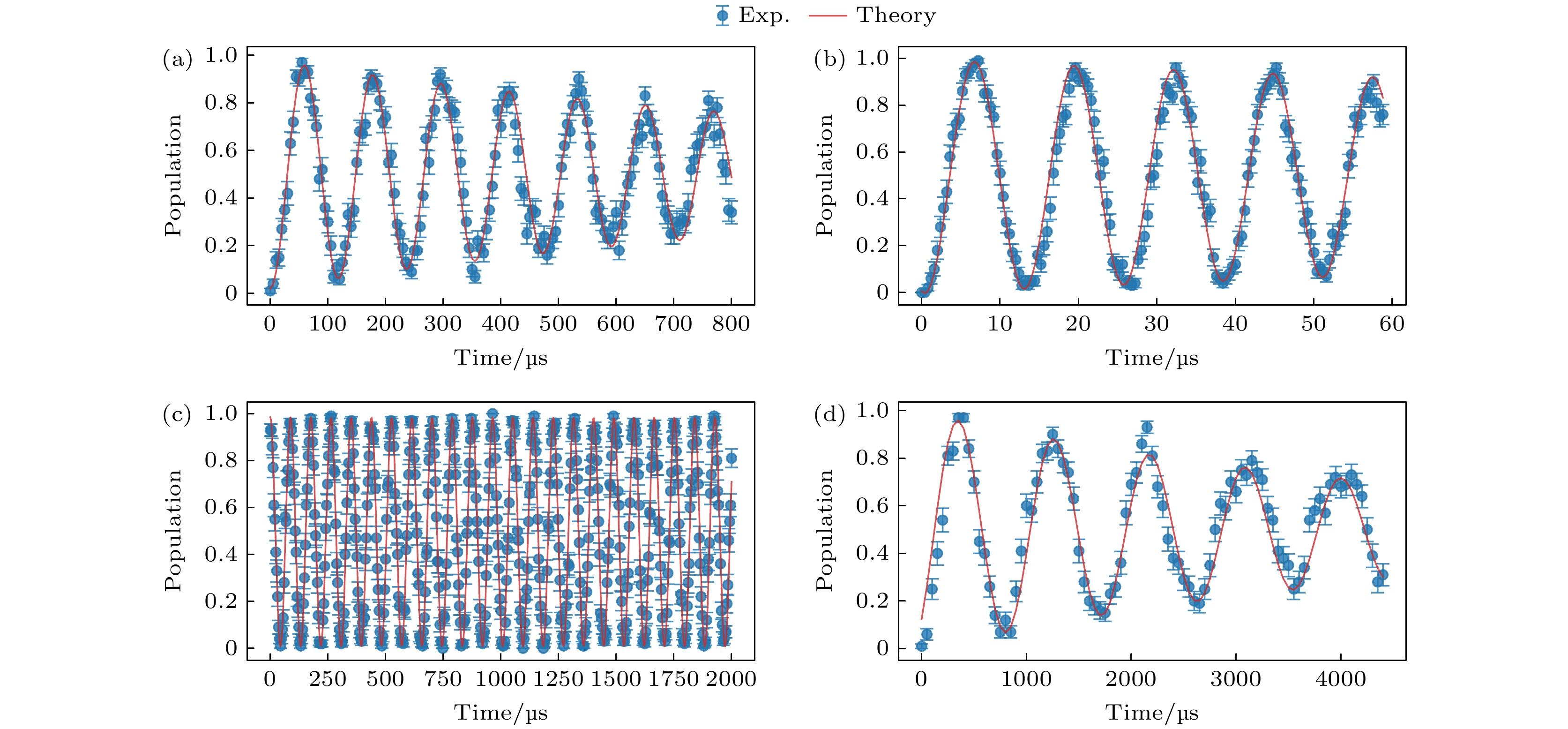 高性能表面电极离子阱是构建可扩展离子阱量子计算机的关键平台. 在室温下实现多离子相干操控, 是迈向量子纠错与大规模集成的关键步骤. 本文报道了在自主研制的室温表面电极离子阱中, 单离子与多离子相干操控的研究进展. 该芯片阱在轴向与横向分别实现了低至0.074(8) quanta/ms(@833 kHz)与0.237(51) quanta/ms(@1.3 MHz)的加热率. 结合电磁诱导透明(EIT)冷却与边带冷却, 单离子被冷却至平均声子数0.04(2)以下. 在此基础上, 利用载波与边带跃迁对多达20个离子进行了全局相干操控, 观测到由集体振动模式介导的离子间耦合, 并清晰地展示了不同位置离子因高阶振动模式向量差异而呈现出的特异相干演化行为. 本工作充分验证了在微型表面电极离子阱的单势阱中囚禁与相干操控链状和二维多离子的能力, 为在芯片电极离子阱中实现高效的多离子纠缠态制备和量子模拟奠定了物理基础.