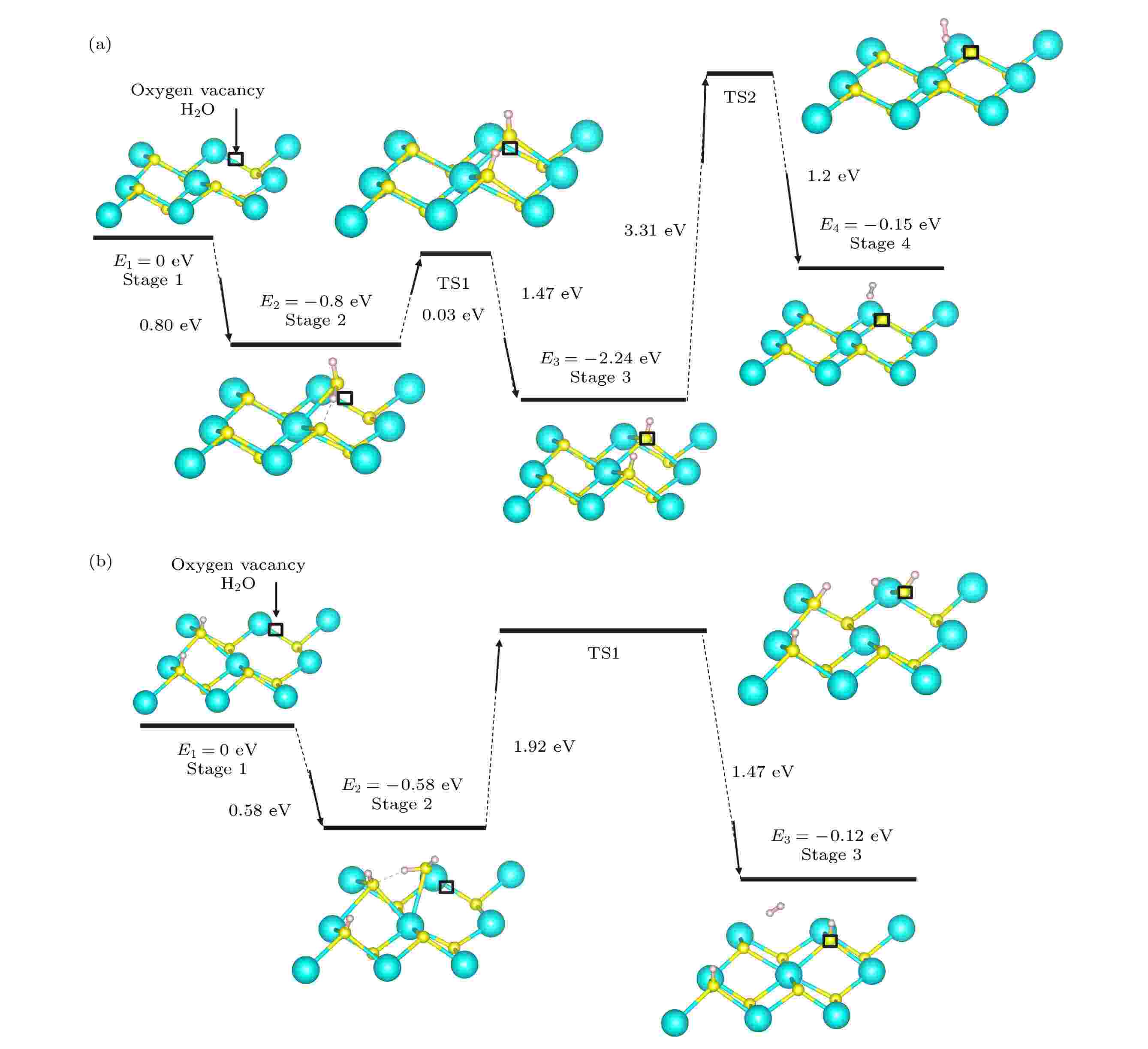 二氧化钚(PuO2)作为一种重要的核燃料材料, 表面特性直接影响放射性元素的稳定性和迁移行为, 在能源储存领域受到广泛关注. 本文通过第一性原理方法研究水分子在二氧化钚(111)和(110)表面的吸附行为以及氧空位过量电子对这些表面的影响. 模拟表明, PuO2(111)表面比(110)表面表现出更高的稳定性, 具有更高的氧空位形成能. 在化学计量的PuO2(111)和(110)表面上, 水分子的解离吸附构型是最稳定的. 利用轻推弹性带方法, 研究发现在PuO2(111)和(110)表面上, 第1个氢原子的解离仅需0.11 eV和0.008 eV的能垒, 而第2步的完全解离则需要更高的能垒, 分别为0.85 eV和1.02 eV. 在还原的PuO2(111)表面存在氧空位的情况下, 可以促进水分子解离成位于氧空位上方的羟基和与表面氧原子结合的氢原子; 在一定条件下, 克服3.31 eV的能垒, 2个氢原子即可形成H2, 在PuO2(111)过氢表面产生H2能垒下降到1.92 eV. 本文研究对于改进核燃料储存技术、延长储存寿命和降低潜在风险具有重要的实际意义.