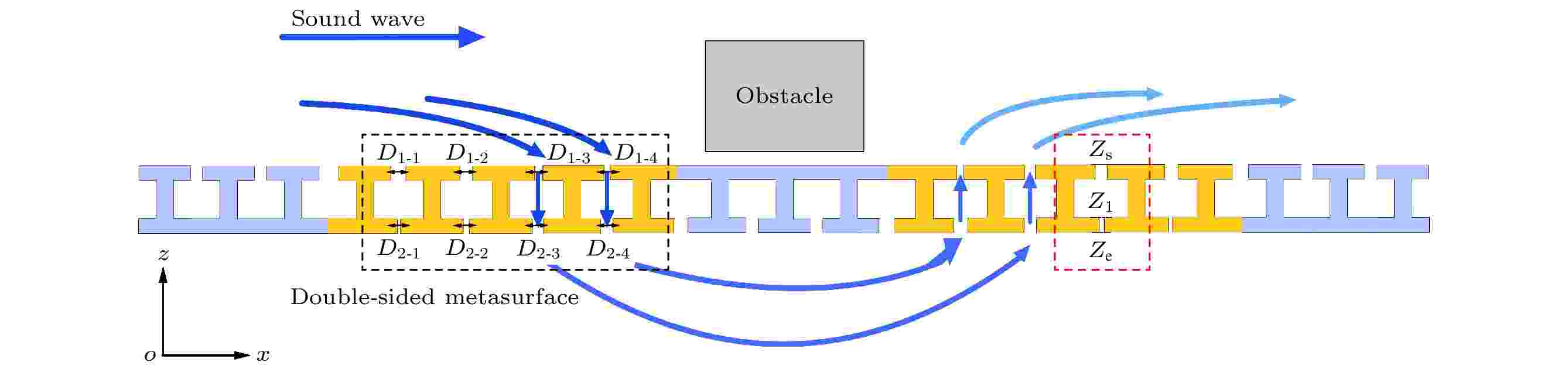 设计了一种可支持伪表面波双面传输的声学超表面, 并构建了一类声隐身装置. 该超表面由双向开孔的亥姆霍兹共鸣器周期性排列构成, 能够在上下表面之间灵活传导伪表面波, 且结构整体厚度仅为工作波长的1/20, 具有显著的亚波长特性. 本文理论推导了伪表面波模式的色散方程, 得到传播波矢与结构参数之间的依赖关系, 通过优化双面超表面的结构参数, 确保传导过程中的波矢匹配, 实现伪表面波在上下表面之间的高效耦合. 在此基础上, 本文构建了一种“声透明通道”, 通过在障碍物前后两侧铺设双面超表面, 使伪表面波能够传导至结构下表面并绕过障碍物, 实现声隐身效果. 经数值模拟和实验验证, 该装置对不同形状的大尺寸障碍物均表现出良好的鲁棒性, 并且具有一定的工作带宽. 本文提出的伪表面波隐身器件具有结构轻薄、灵活性高等显著优势, 为深亚波长尺度的伪表面波操控及声学器件设计提供了新的研究思路和技术路径.
